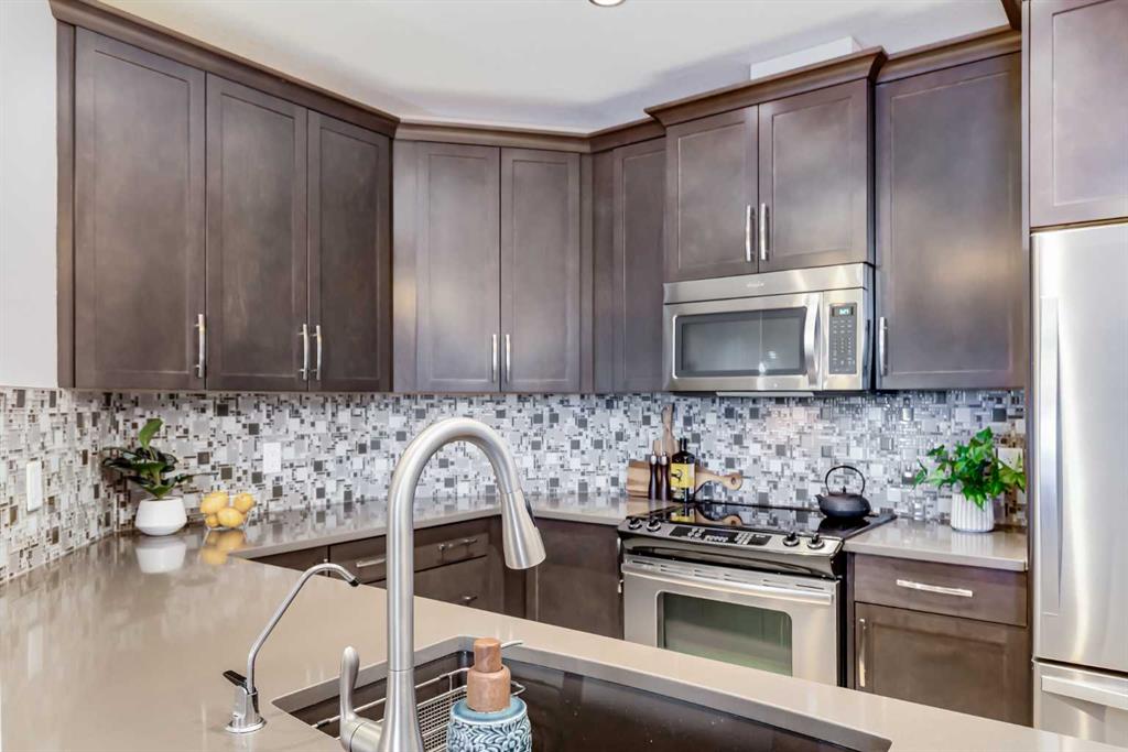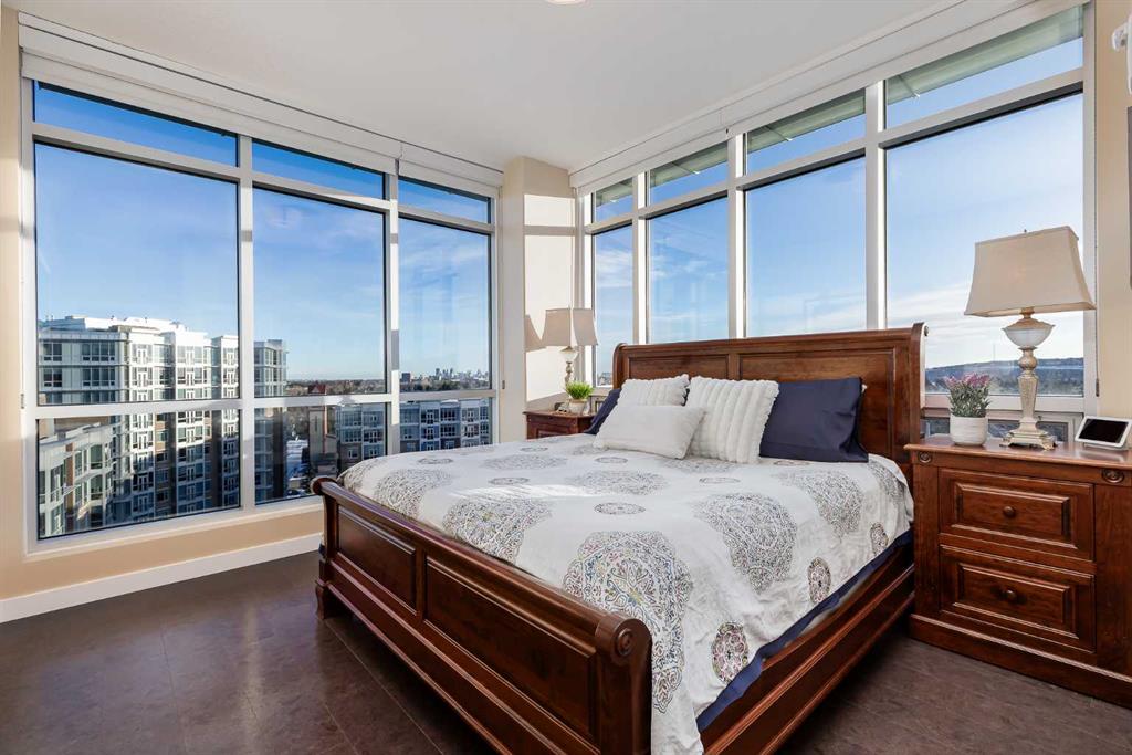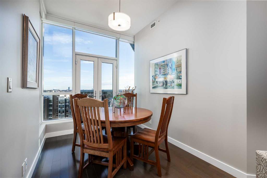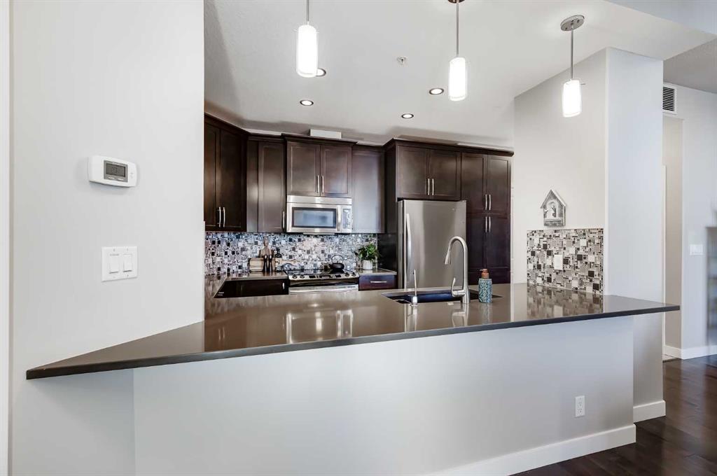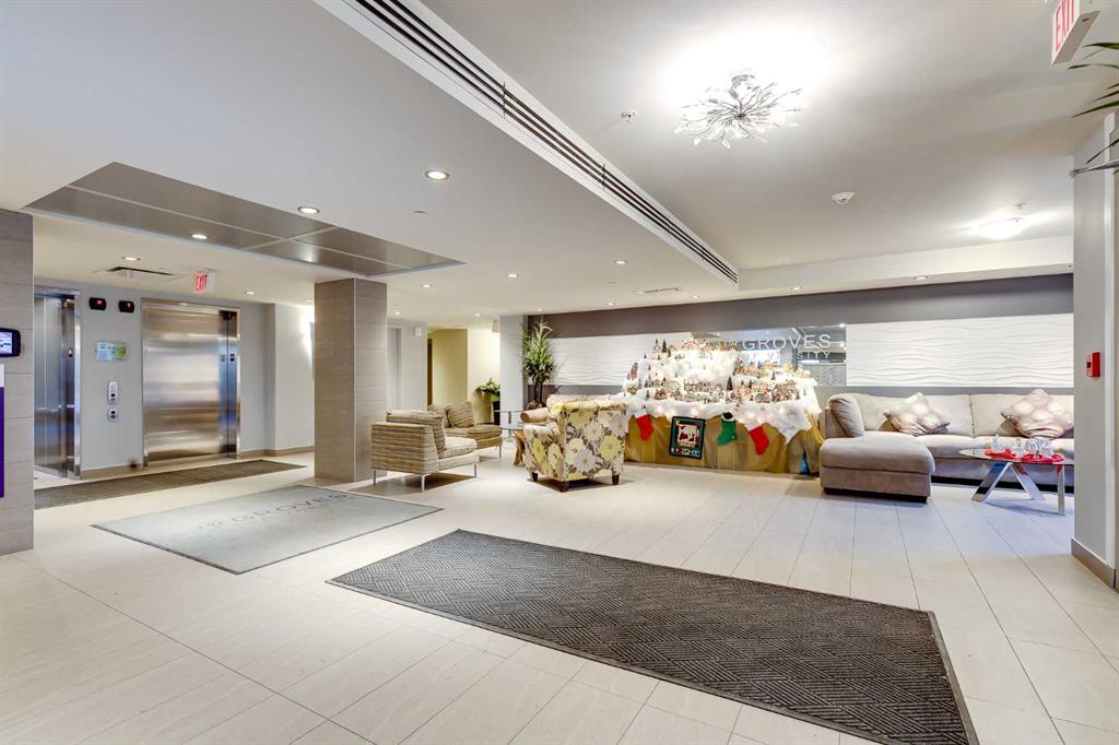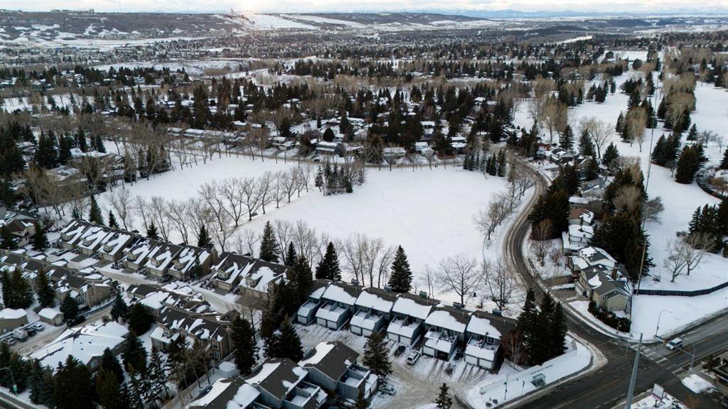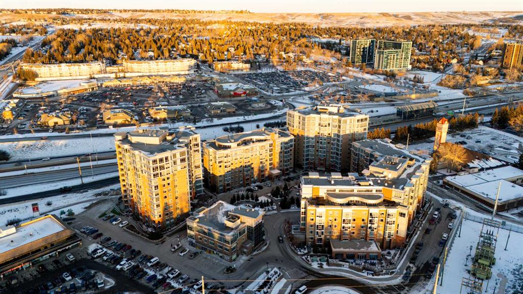 Perched on the 11th floor of the Monterey One building at Groves of Varsity, this thoughtfully designed condominium offers expansive city and mountain views and a refined living experience in one of Calgary’s most established luxury complexes. Constructed with concrete and steel, the residence provides a quiet, secure setting. With over 1,000 square feet of developed space, the home features two bedrooms and two bathrooms, balancing comfort with functionality. The interior is defined by 10-foot ceilings and full-height windows that flood the space with natural light and frame open outlooks. Hardwood flooring anchors the living and dining areas, creating a cohesive flow throughout the main living space. The well-proportioned living room opens seamlessly to the dining area, which features a Juliet balcony with downtown views—ideal for both everyday living and entertaining. The modern kitchen blends style and practicality with tile flooring, rich wood cabinetry, quartz countertops, stainless steel appliances, ample storage, and a breakfast bar for casual seating. The primary bedroom is positioned to take full advantage of the views and includes cork flooring, a walk-in closet, and a five-piece ensuite with a soaker tub, standalone shower, dual sinks, and quartz countertops. The second bedroom is equally versatile, currently set up as a home office with a Murphy bed and integrated desk. A nearby three-piece bathroom features an oversized glass-enclosed shower and quartz countertop. Additional features include a dedicated laundry room with full-size stacked washer and dryer, extra storage, air conditioning, one titled underground heated parking stall, and a titled storage locker. Residents enjoy a well-managed building with a strong reserve fund, an on-site property manager and building operator, and an engaged board that meets monthly. Amenities include a fitness area, steam rooms, owners’ lounge, and an outdoor rooftop terrace with BBQs. Short-term rentals are not permitted, and pets are welcome with board approval. The location is exceptional, steps from the Dalhousie LRT Station and directly across from the shops, dining, and services of Dalhousie Station. Market Mall, Northland Mall, Crowfoot Crossing, downtown Calgary, and major routes are all minutes away. The University of Calgary, SAIT, Foothills Hospital, Alberta Children’s Hospital, Nose Hill Park, and Bowmont Park are close by, offering an ideal balance of lifestyle and accessibility. Check out the 3D tour and floor plans!