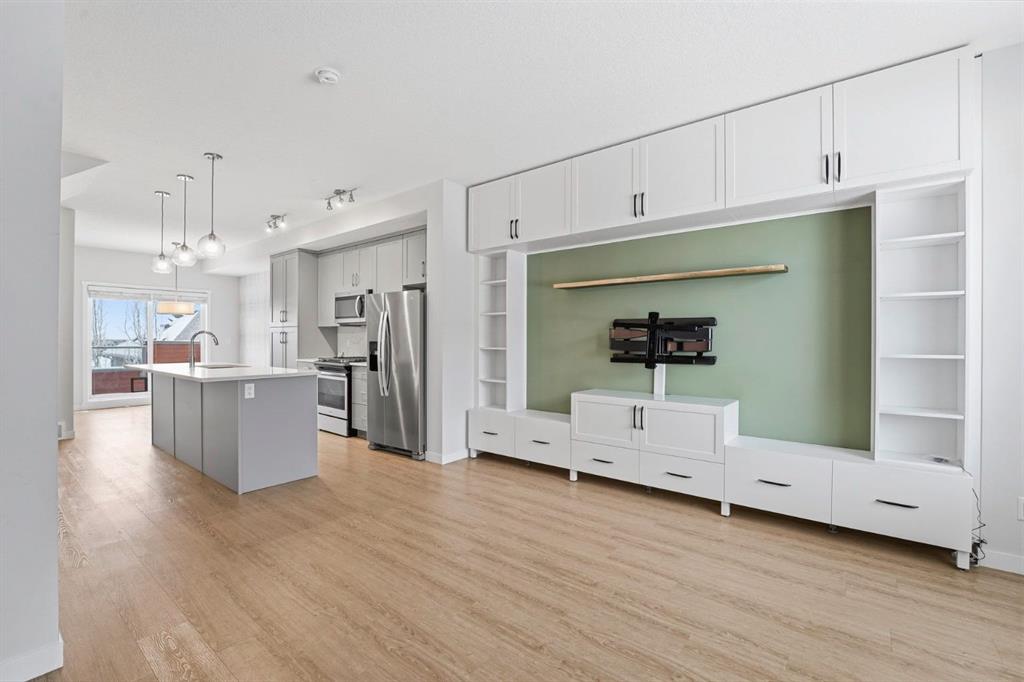 Welcome to this beautifully designed former show home, where modern style meets everyday functionality. Thoughtfully laid out with two private primary suites—each featuring its own ensuite and walk-in closet—this home is perfectly suited for professionals, first-time buyers, investors, or small families. A tandem attached garage offers added convenience and extra storage. The open-concept living space is highlighted by designer finishes and upgrades throughout, including quartz countertops, upgraded cabinetry, a gas range, stainless steel appliances, durable vinyl plank flooring, and a sleek eat-up island ideal for entertaining. Eye-catching feature walls add character to both bedrooms and the dining area, while raised ensuite vanities and upper-level laundry enhance daily comfort. Flexible spaces on both the main and upper levels allow for a home office or study area. Step out onto the private balcony off the dining area—perfect for grilling or relaxing outdoors. Additional value comes from thoughtful inclusions such as a custom closet organizer with full-length mirror, premium Sanus full-motion TV mount, modern window coverings, and wall shelving.. Ideally located in Calgary’s sought-after southwest, this home offers easy access to major roadways and transit, on-site amenities, and is just steps from tennis courts, playgrounds, the C-Train, and scenic Fish Creek pathways. Shopping and everyday conveniences are only minutes away. Stylish, move-in ready, and perfectly located—this is modern living at its best. Book your showing today.