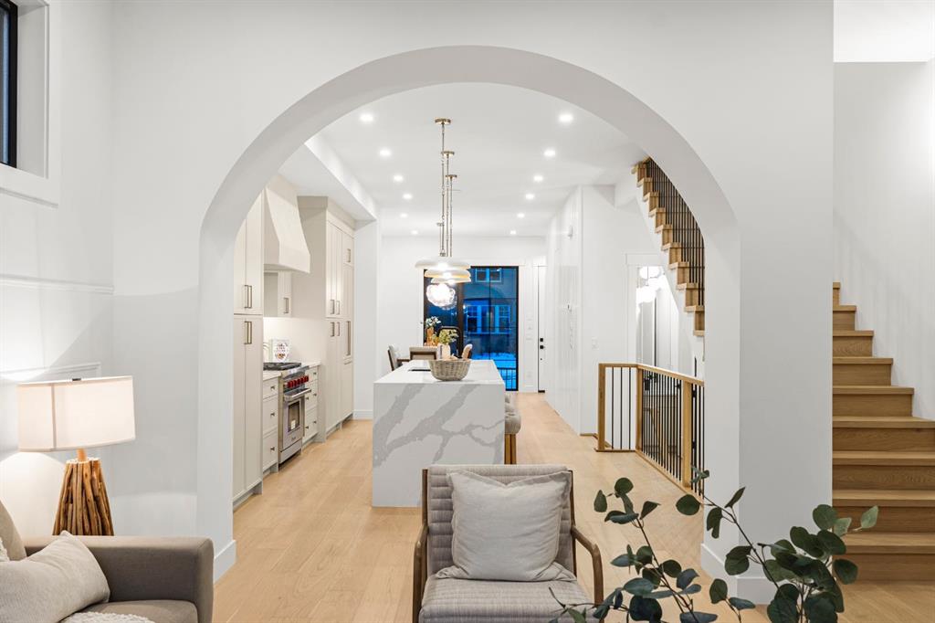 This extraordinary brick-exterior home is set in one of the most desirable locations and built by Jerry Homes with a thoughtfully designed, functional floor plan. A spacious foyer welcomes you into the main level with soaring 10-foot ceilings, a dining area accented with custom wainscoting, and a stunning kitchen featuring a massive 12-foot island, hidden walk-in pantry, high-end built-in Wolf and Dacor appliances, quartz countertops with under-cabinet lighting, and elegant gold accents. A beautifully crafted archway separates the kitchen from the great room, anchored by a custom multi-tier gas fireplace, while the mudroom provides ample storage. Large windows throughout the home fill every level with natural light, enhancing the open and airy design. Upstairs, 9-foot ceilings frame a lavish primary suite with two large walk-in closets and a spa-inspired 5-piece ensuite fully wrapped in designer tile, complete with steam shower rough-in, in-floor heating, and a soaking tub. Two additional bedrooms, a 3-piece bath, and a full laundry room complete the upper level. The fully developed basement includes in-floor heating rough-in, a spacious rec room, wet bar, fourth bedroom, and a 3-piece bath. Additional features include rough-ins for A/C, built-in ceiling speakers, an alarm system, and exterior cameras. Ideally located near top schools, parks, and the shops and restaurants of Marda Loop, this home blends quiet luxury with unmatched convenience. Call today to book your tour!