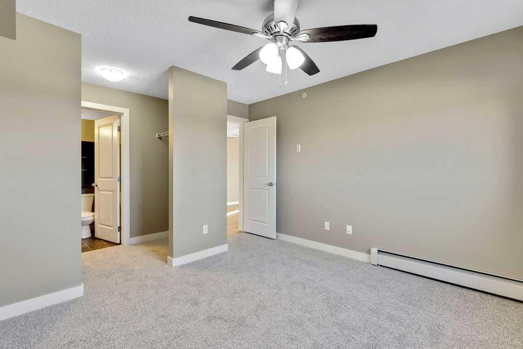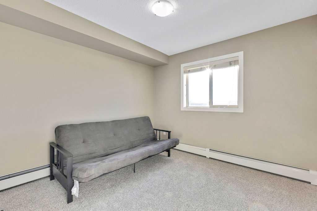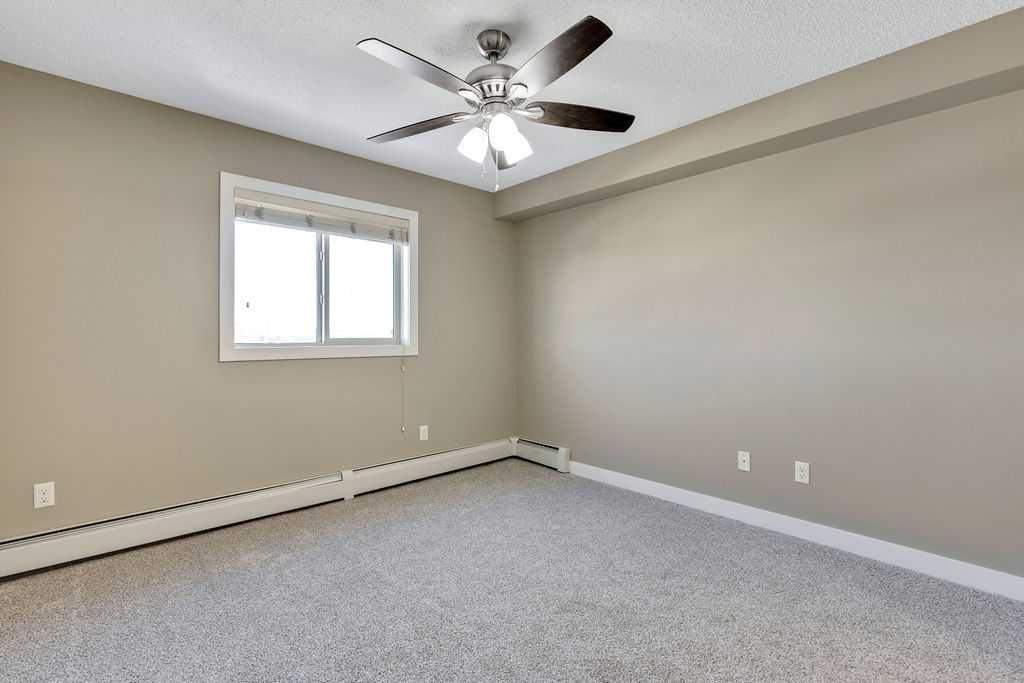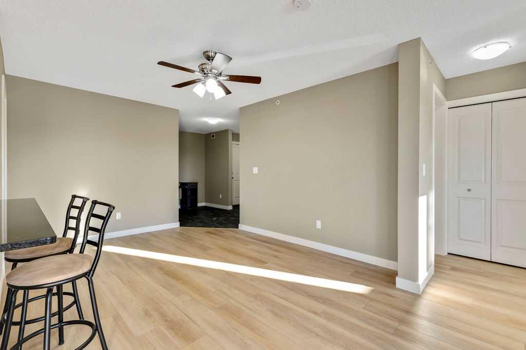 This TOP FLOOR two-bedroom, two-bathroom suite offers TWO Parking Stalls in Downtown Airdrie’s most desirable location, with beautiful southwest-facing views. With almost 1,000 square feet, the thoughtfully designed layout includes two spacious bedrooms plus a versatile den area. Recent upgrades include new carpeting, vinyl plank flooring, stainless steel appliances, and a custom 2” blind package, enhancing both comfort and style. The open-concept living space is bathed in natural light from expansive windows, creating a bright and welcoming atmosphere. Elegant kitchen features granite countertops, a breakfast island, soft-close cabinetry, and a dedicated dining area—perfect for everyday living and entertaining alike. The living room opens through patio doors to a generously sized balcony, ideal for hosting guests or simply enjoying the stunning views. The primary bedroom offers a private 3-piece ensuite, while the second bedroom is conveniently located near a full four-piece bathroom. Large foyer with an office nook and in-suite laundry adds further functionality. This well-appointed condo includes one titled underground parking stall and one above-ground surface stall. With numerous upgrades and a walkable location close to Sobeys, Good Earth Café, fitness facilities, shops, and transit, this is a true move-in-ready opportunity—simply settle in and enjoy.