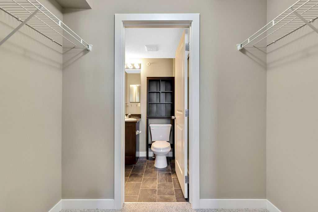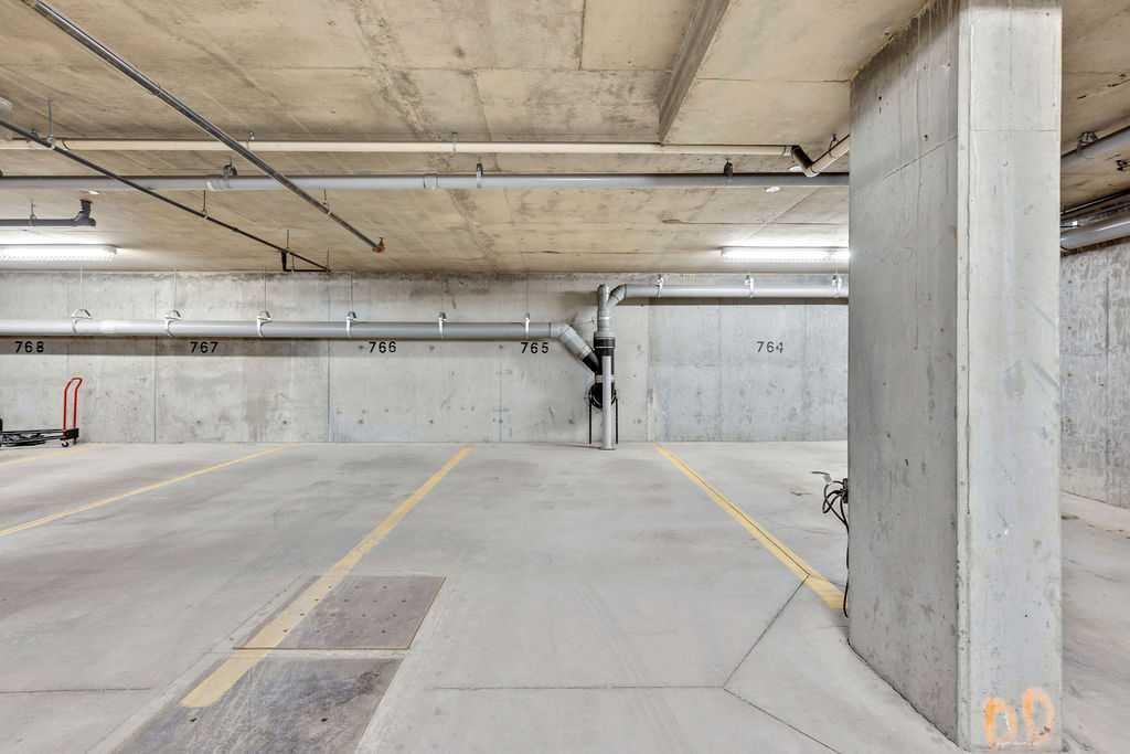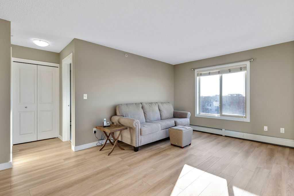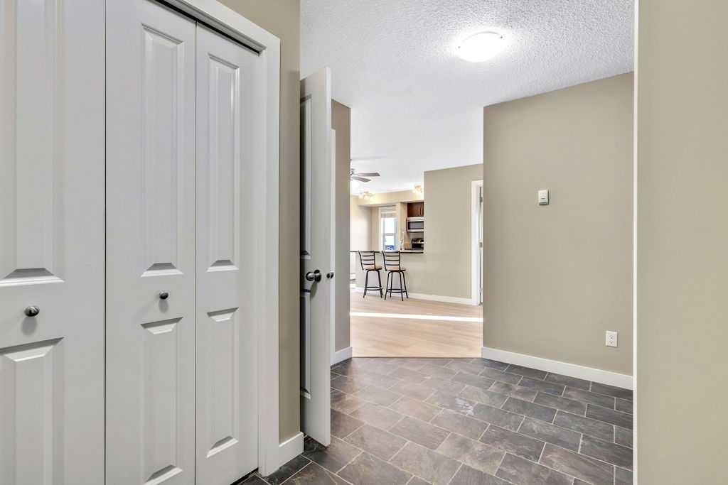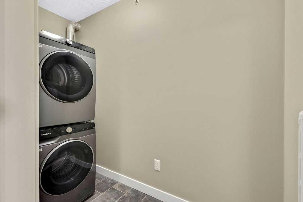 This TOP FLOOR two-bedroom, two-bathroom suite offers TWO Parking Stalls in Downtown Airdrie’s most desirable location, with beautiful southwest-facing views. With almost 1,000 square feet, the thoughtfully designed layout includes two spacious bedrooms plus a versatile den area. Recent upgrades include new carpeting, vinyl plank flooring, stainless steel appliances, and a custom 2” blind package, enhancing both comfort and style. The open-concept living space is bathed in natural light from expansive windows, creating a bright and welcoming atmosphere. Elegant kitchen features granite countertops, a breakfast island, soft-close cabinetry, and a dedicated dining area—perfect for everyday living and entertaining alike. The living room opens through patio doors to a generously sized balcony, ideal for hosting guests or simply enjoying the stunning views. The primary bedroom offers a private 3-piece ensuite, while the second bedroom is conveniently located near a full four-piece bathroom. Large foyer with an office nook and in-suite laundry adds further functionality. This well-appointed condo includes one titled underground parking stall and one above-ground surface stall. With numerous upgrades and a walkable location close to Sobeys, Good Earth Café, fitness facilities, shops, and transit, this is a true move-in-ready opportunity—simply settle in and enjoy.
