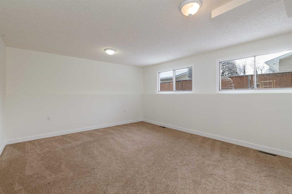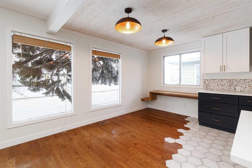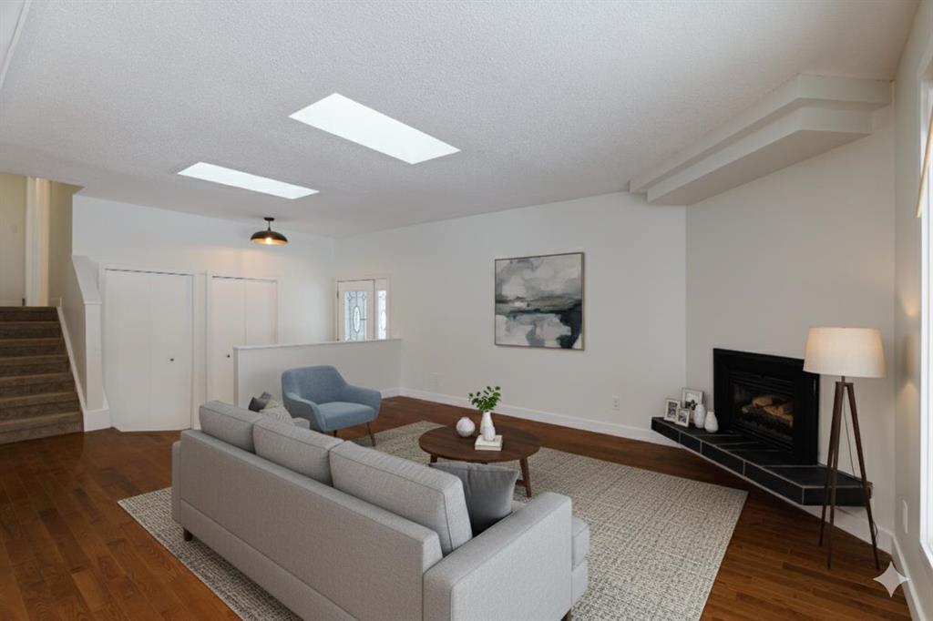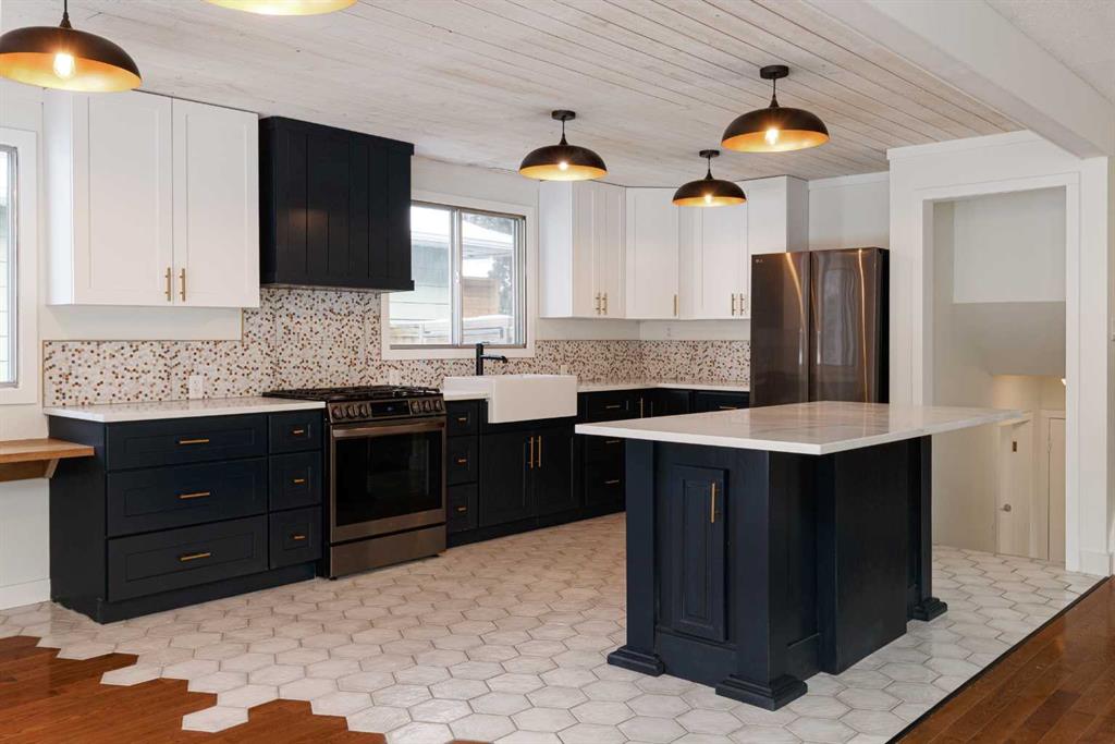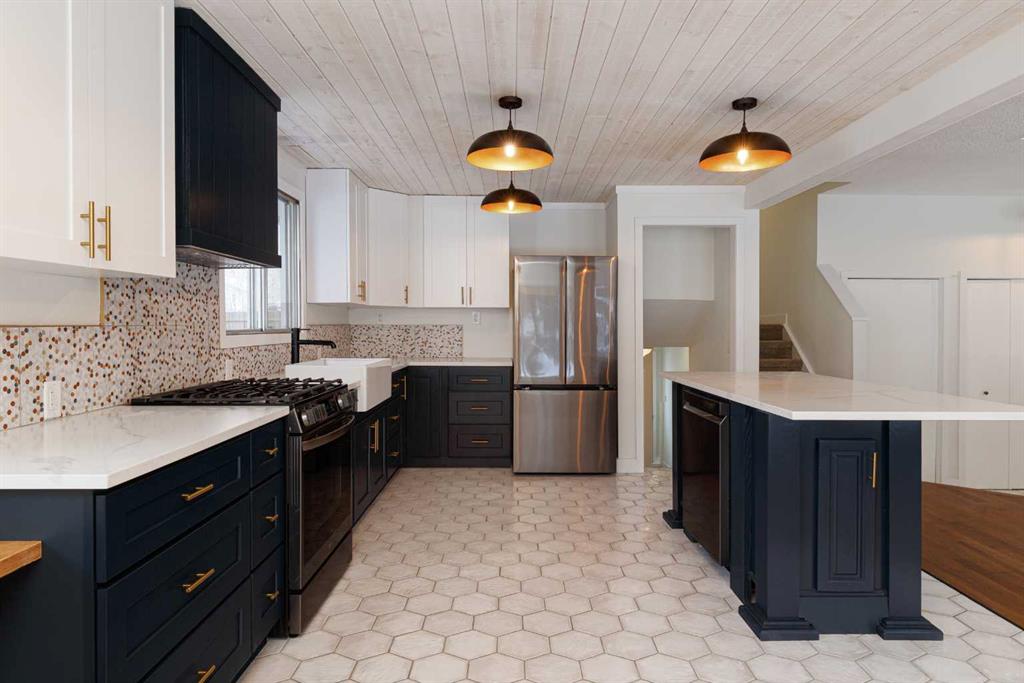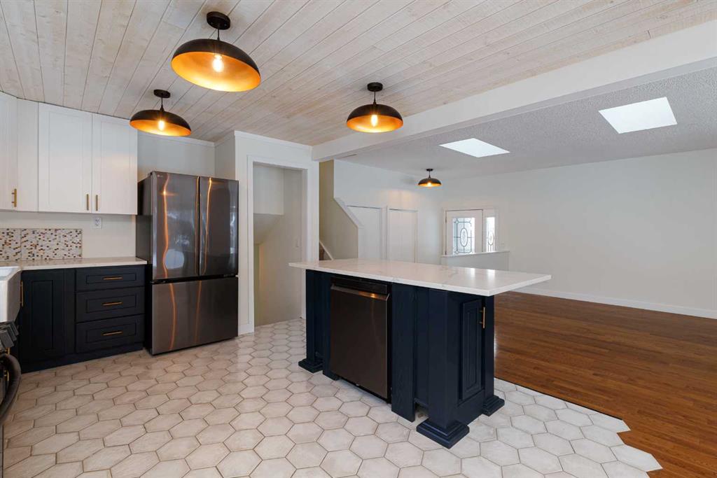 OPEN HOUSE - SATURDAY, JAN 31 2:00-4:00. Welcome to this stunningly transformed 4-level split in the heart of Queensland, where mid-century charm meets contemporary luxury. No expense was spared in this top-to-bottom renovation, offering 1,738 square feet of finished living space. The main floor is a showstopper, featuring an open concept layout with gorgeous hardwood flooring and a custom kitchen. The culinary space boasts sleek navy and white cabinetry, a large central island, quartz countertops, a classic farmhouse sink, and a unique hexagonal tile transition that seamlessly blends the kitchen and dining areas. Large windows and dual skylights flood the space with natural light, highlighting the modern wood plank ceiling and industrial-chic lighting. Relax in the expansive living room, anchored by a sleek, minimalist fireplace with a slate hearth. Retreat to the upper level where you will find three generously sized bedrooms, including the primary with two piece ensuite. The lower level provides even more versatility with a massive recreation room—perfect for a home theatre or play area—along with a fourth bedroom and a second full bathroom, making it an ideal space for guests or teenagers. The basement level houses the laundry and a large open space ensuring you’ll never be short of storage. A separate entrance walks up to the large private yard with mature trees and plenty of space to roam. An oversized double detached garage and parking space for your RV complete this property. This home is ideally located and is just minutes from schools, shopping, the ridge at Fish Creek Park, and an off leash dog park. Don’t miss your chance to own one of the most uniquely renovated homes in this established, quiet community!