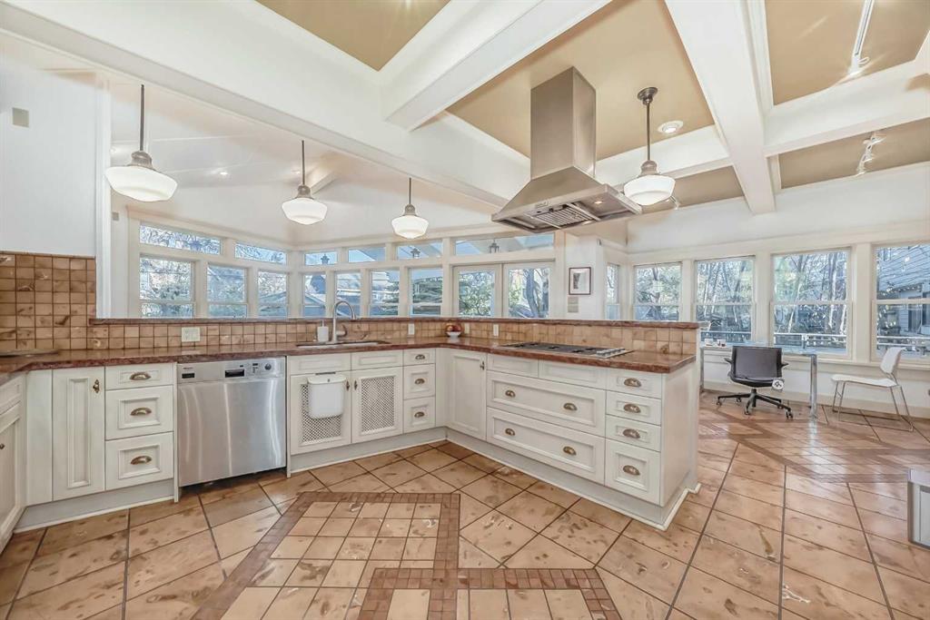 Facing a serene park in historical Scarboro—one of Calgary’s most coveted inner-city enclaves—this exquisite 5-bedroom red-brick residence offers 4,289 sq ft refined living space (Main Floor alone boasts about 1700 sq ft. expansive living place with 3 fireplaces. And 4 bedrooms on upper level with a layout enjoyable for a growing family. ) and a blend of heritage charm and modern craftsmanship. From 2000 to 2022, about $800,000 had been invested in fundamentally transforming the home with modern builds: new three-level 1,700 sq ft addition including the new custom kitchen and family room; updated bathrooms, oversized under-drive, attached double garage, in-floor heating, heated driveway, electrical and mechanical updates, new patio, new windows, new flooring, vacuflo system and more. The iconic red-brick façade and front manicured garden exude timeless heritage charm. The architectural, gourmet Farmhouse Kitchen, designed and built by industry leader Downsview Kitchens, wrapped in three walls of windows with vaulted ceilings and exposed beams, a showpiece kitchen brings exceptional natural light and “the outdoors cooking in.”; Sculptural oversized island with curved granite counters and 2 kitchen sinks; Sub-Zero 48” refrigerator, Gaggenau and Thermador appliances; Italian ceramic tile floors with in-floor heating; Adjacent family room with fireplace; Outdoor kitchen and skylit patio overlooking the gardens; Formal dining room with garden views and custom cabinetry, and built-in Sub-Zero wine/beverage fridge and Miele coffee station nearby; Spacious living room with wood-burning fireplace; Office/den with wood-panelled walls, shelving, and wood-burning fireplace. Upper Level: Four bedrooms, sunroom, and two large bathrooms with completely new renovation; Primary Suite: Extra-large bedroom with sitting area; Spa-inspired ensuite; Custom floor-to-ceiling dressing cabinets and extra walk-in closet; Juliet Balcony; Downtown skyline views! Bedroom 2: Built-in sink/vanity and walk-in closet; Bedroom 3: New custom wardrobe and storage; Bedroom 4: with adjacent south-facing sunroom/yoga room overlooking the park. Lower Level: Exceptional recreation and guest space; Expansive rec/living room with wet bar; Dedicated fitness area; 5th bedroom; Full bathroom; Large laundry area with cast-iron double sink and laundry chute. Heating & Mechanical: Main steam boiler system (2017) with radiant heat; plus 2 additional boiler/furnace systems. Oversized attached double garage with workshop space and heated driveway. Front driveway provides easy access. Unmatched Location with a Park-like Setting - Steps to Downtown and Close to Top-Ranking Schools! A home where timeless character blends seamlessly with modern comfort. Become part of the cherished Scarboro community!