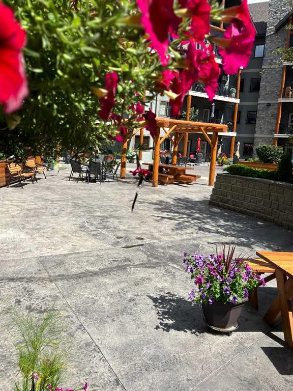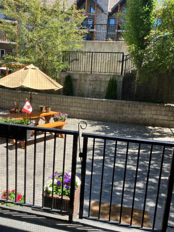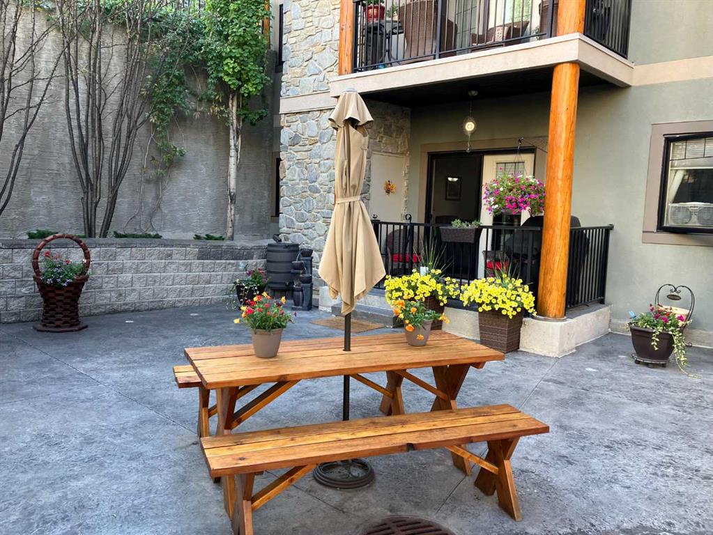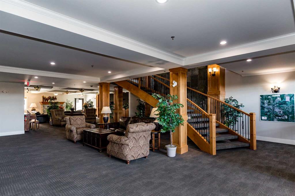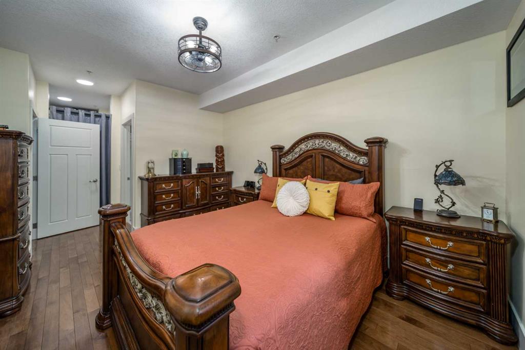 Welcome to Cochrane's most prestigious condo complex. Situated along George Fox Trail, Lofts on the Bow overlooks soccer fields, a playground area, the Bow River and the Big Hill. This two bedroom, two bathroom condo plus a Den is an end unit and features a private patio adjoining the 7,000 square foot Courtyard. The patio comes with a gas hookup for your BBQ and also has a storage room included. Inside, this unit features Hardwood floors throughout except in the bathrooms and Laundry room. The Kitchen has Gleaming granite counter tops and lots of cabinets . The lower cabinets have pullout shelving. The ceilings are 9 feet tall . New lighting throughout and unit has all new paint. All appliances are included and are just 1 year old with 3 years of extended warranty transferable to the NEW OWNER. This condo is secluded and sheltered and great for bird watching. This complex is a 55+ building and has many amenities including a pool table for those who like that, a workout room with various machines, a meeting room/ quilting room, a full kitchen and banquet facilities. There are also two guest suites that can be rented for your guests comfort. One Titled and heated underground parking space is included and there is a car wash in the Parkade. There are also lots of outside parking spaces on either side of the condo building and extra ones at the back of the building for those oversized vehicles. With easy access you can enter this PRESTINE property showing PRIDE OF OWNERSHIP THROUGHOUT .
