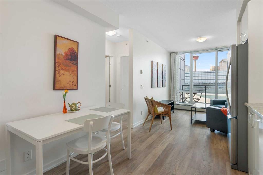 This immaculate, fully furnished property offers an exceptional downtown location and an effortless urban lifestyle. Complete with all kitchenware and a cruiser bike, it provides the ultimate convenience for walking or biking throughout downtown and along the river pathways. Just steps from City Hall LRT Station, Superstore, Central Library, Bow Valley College, Tim Hortons, Stampede Park, and a wide selection of shops and amenities, everything you need is truly at your doorstep. The secure, well-maintained, and professionally managed building presents beautifully. Inside, the bright and spacious one-bedroom unit features floor-to-ceiling windows in both the living room and bedroom, flooding the space with natural light and showcasing sweeping panoramic views. The open-concept layout seamlessly connects the kitchen and living area, complemented by durable vinyl plank flooring throughout. The modern kitchen is finished with high-gloss cabinetry, stainless steel appliances, quartz countertops, and a convenient built-in washer and dryer. The living room opens onto a generous west-facing balcony—an ideal spot to relax while enjoying stunning city and mountain views. A large primary bedroom and a well-appointed four-piece bathroom complete the home. Residents enjoy access to outstanding building amenities, including a fully equipped fitness centre, a rooftop patio with breathtaking city views, premium bike storage, a communal lounge, and an additional storage locker. Offered fully furnished as shown, this stylish turnkey condo is a fantastic opportunity for anyone seeking comfort, convenience, and the vibrancy of downtown living. For those interested parties that have a vehicle, there is a city lot right across the street that rents parking spots by the month.