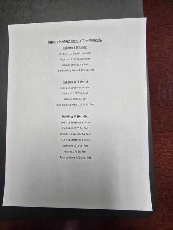 Fully Serviced, 20 Townhouse lots in the middle of already developed residental neighborhood ( yellow shade in the picture),Seller will provide all the floor palns/drawings and permits. Building E (8 Units) Each unit is 1769 Sq. feet,Garage 250 Sq. feet,Total building 14,152 Sq. feet, Lot 115-101 Strathcona Circle, Building D (6 units) 127-117 Strathcona Circle,Each unit is 1769 Sq. feet,Garage 250 Sq. feet,Total building area is 10,776 Sq. feet, Building M (6 Units) 102-413 Strathcona Circle, each unit is 1670 Sq. feet ,Double garage area 432 Sq. feet,413-421 Strathcona Circle,each unit is 1272 Sq. feet ,garage area 273 Sq.feet and Total building area is 8,035 Sq. feet.