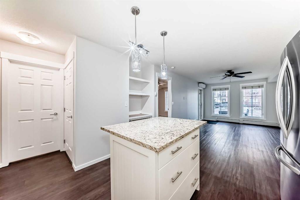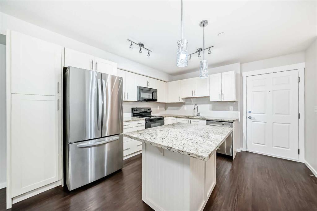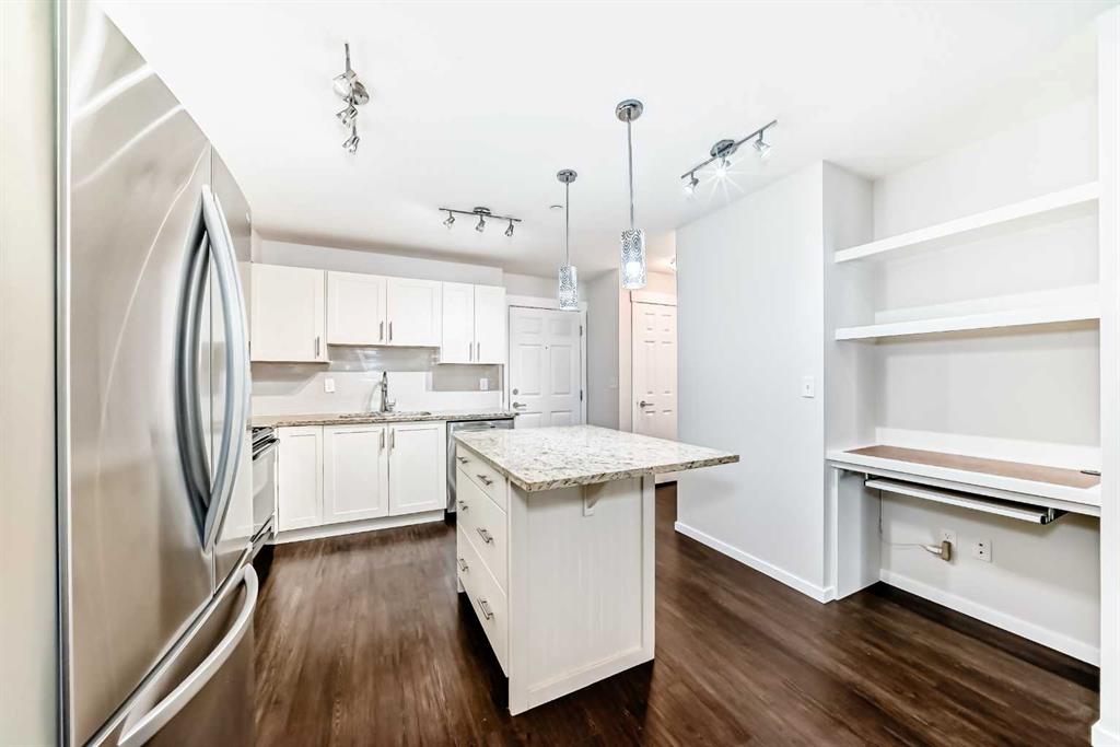 OPEN HOUSE on Sunday Jan 25th from 12-3 PM! Welcome to this meticulously maintained ground floor unit! This one has it all! Fresh paint throughout, upgraded lights, granite countertops, kitchen island with room for 3 stools, upgraded fridge and dishwasher, plenty of cabinet and counter space as well as tiled backsplash and a pantry closet! As you make your way into the living areas you have a huge living room with an access door out to the private patio area that has a gas hook up for your BBQ and there is also a desk area next to the kitchen that's perfect for a work from home professional! The bedroom is a good size and has a walk through closet with built ins that connects to the full bathroom. If that wasn't enough there is a doggie "potty station", fire pit for the residents, TITLED parking, Central A/C, separate storage down in the parkade area and this unit is close to all of the areas amenities, parks, playgrounds, major roadways, 130th shopping centre, The South Health Campus, the YMCA, off leash dog parks and so much more! This one is priced to sell and just awaiting a new owner to love it!