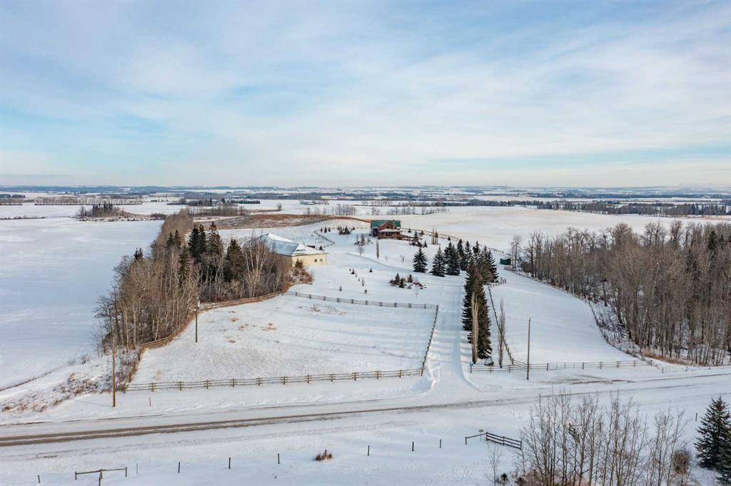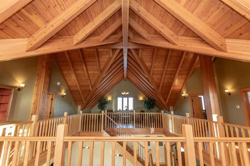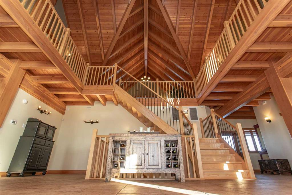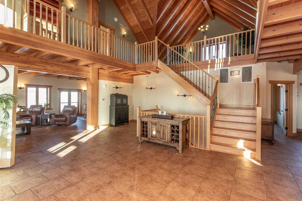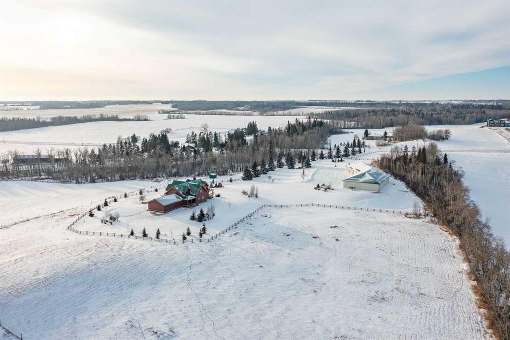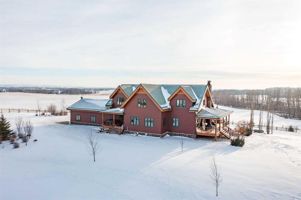This exceptional 6.5-acre property offers a rare blend of architectural distinction, quality construction, and thoughtful design, set against sweeping panoramic views just minutes from Lacombe. Zoned Ag and meticulously maintained, the manicured yard site is peaceful, private and designed for both lifestyle enjoyment and long-term efficiency. At the heart of the property is a stunning European-inspired, chalet-style two-storey home built in 2008, offering over 7,000 sq ft of developed living space. Constructed entirely with ICF concrete (no stick framing), the home is remarkably solid, quiet, and energy efficient, featuring one-foot-thick exterior walls, concrete floors throughout, and a Super-B insulated roof. Inside, Douglas Fir post-and-beam construction, soaring ceilings, an interior mezzanine, and an open-concept layout create a warm, inviting atmosphere filled with natural light. Covered balconies and walkout basement invite you to enjoy seamless indoor-outdoor living. Fine craftsmanship is evident throughout, from fir hardwood and custom ash cabinetry to walnut countertops and travertine-finished bathrooms. The main living and dining areas are spacious and welcoming, anchored by a beautiful wood-burning fireplace. The kitchen is thoughtfully designed with a center island, wood countertops, new appliances, and generous cabinetry. The primary suite offers a true retreat, with a luxurious 5-piece ensuite. Additional bedrooms and flexible upper-level space provide options for a gym, studio, or quiet reading nook. The lower level is equally well designed, featuring a wine cellar, indoor sauna, recreation area, dedicated laundry room, and a hobby or canning room with sink. Comfort and efficiency are seamlessly integrated with a hybrid geothermal heating and cooling system, in-floor radiant heat on all levels with individual room controls, triple-pane windows, advanced air filtration, humidity control, and zoned HRV systems. The oversized heated attached garage (29’ x 39’) reflects the same quality, offering ICF construction, vaulted ceilings, floor drains, and water service. Completing the property is an impressive 13,500 sq ft shop, fully insulated and heated with radiant heat. With 14-ft ceilings, six overhead doors, mezzanine, office, kitchen, bathroom, mechanical rooms, 220V services, air compressor lines, floor drains, and a 20kVA diesel backup generator, the space is ideal for business use, storage, or hobbies. Additional highlights include a drilled well, new septic field for the residence, geothermal field with 16 vertical heat exchangers, an outdoor firepit, and a 3.5-acre lifetime easement providing added usable land while preserving long-term privacy. Designed to truly live, work, and play in one location, this estate-level acreage offers exceptional flexibility for large families, extended family living, and entrepreneurial or home-based business opportunities. Properties of this caliber must be seen to be fully appreciated.