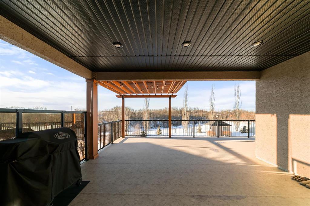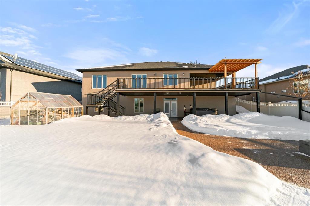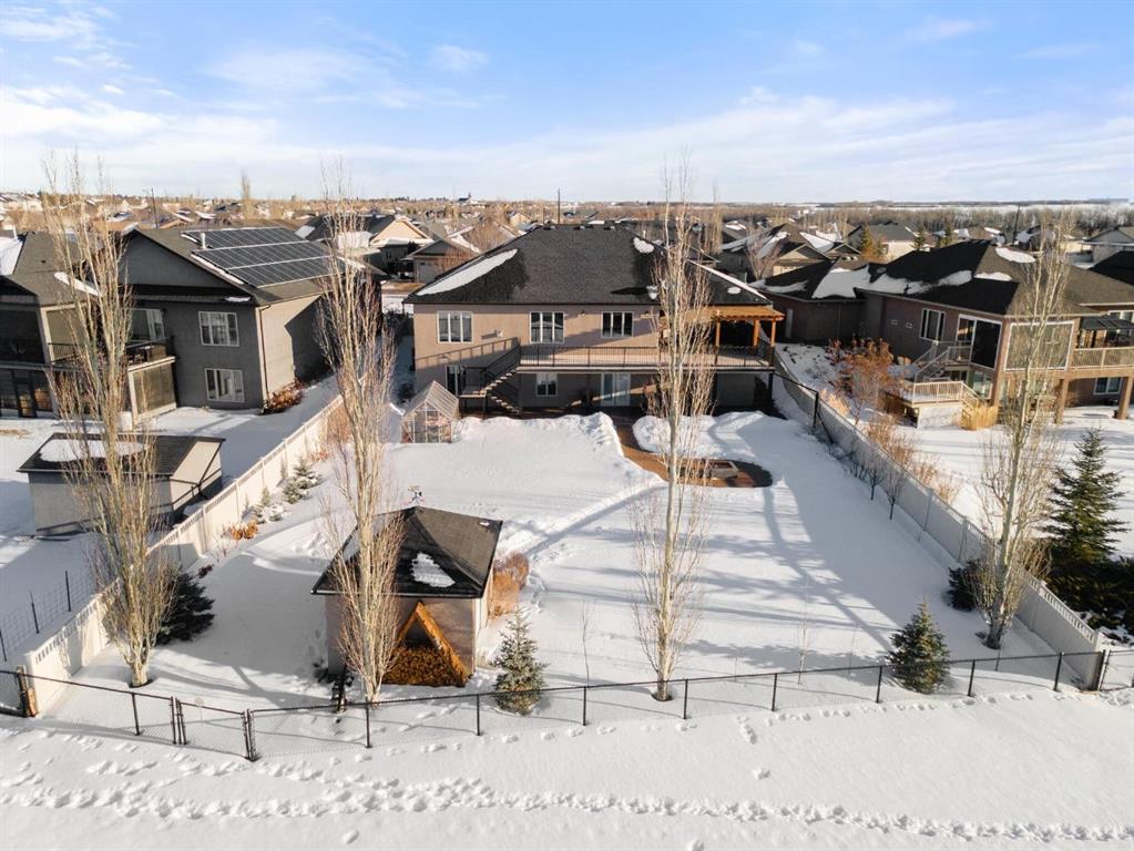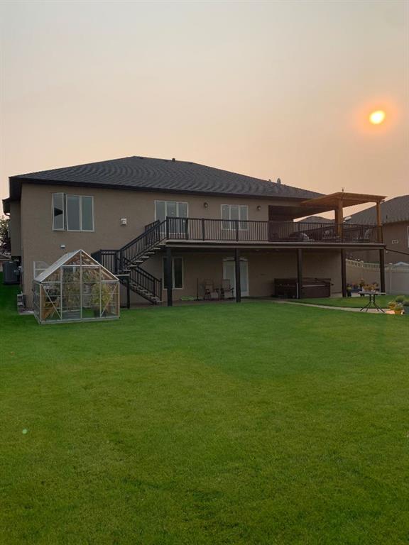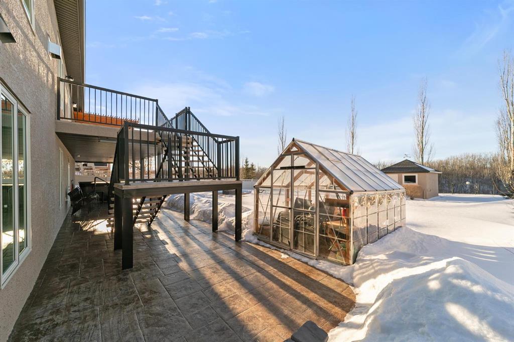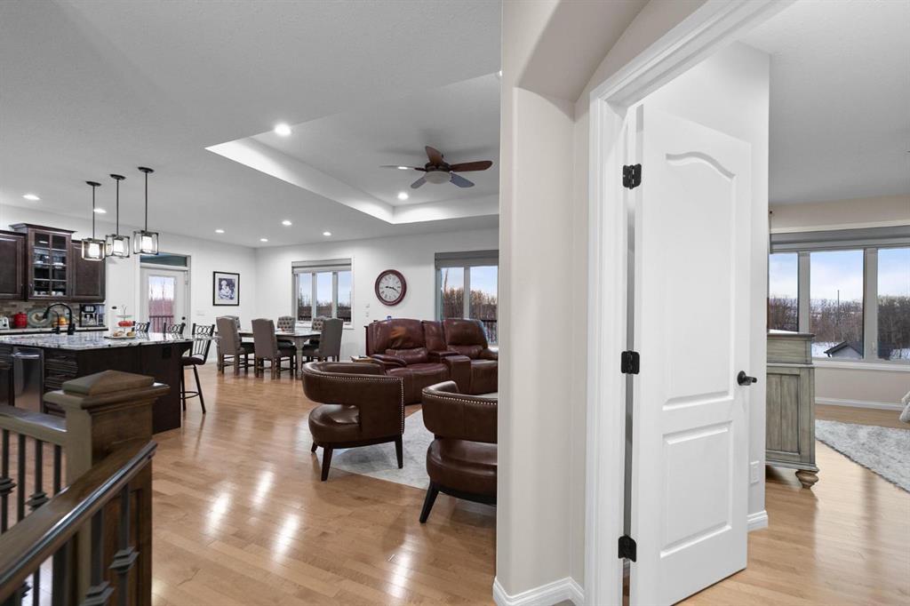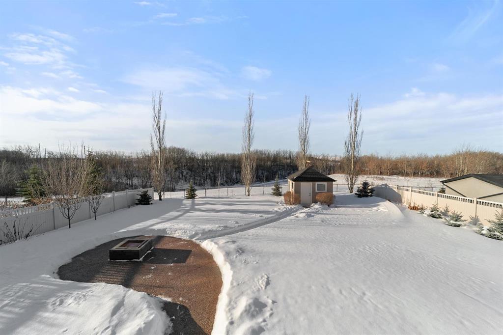 Experience unmatched views and exceptional craftsmanship in this stunning custom-built walkout bungalow, perfectly positioned in Valleyview overlooking the breathtaking valley landscape. Offering 3 bedrooms, 3 bathrooms, this home blends elegance, comfort, and thoughtful design across a bright, open-concept floor plan. Expansive windows flood the space with natural light—complemented by coffered ceilings, motorized blinds, and rich hardwood flooring. The impressive great room showcases a striking stone fireplace and open staircase framing panoramic views. The chef-inspired kitchen features granite countertops, a large entertaining island, 36” gas cooktop, built-in oven and microwave, and a spacious walk-in pantry. The adjoining dining space extends to a wrap-around covered deck, offering year-round enjoyment and remarkable valley scenery. The luxurious primary suite is a private retreat complete with spa-style ensuite and walk-in closet, with main-floor laundry and air conditioning adding everyday convenience. The fully finished walkout basement is designed for living and entertaining—featuring in-floor heat, a generous media/games area, additional bedroom and den, and a second stone fireplace. Step outside onto the covered patio with hot tub and firepit, perfect for unwinding or hosting guests. Sitting on a beautifully landscaped oversized lot with full irrigation, greenhouse, and storage shed, this home also includes an oversized heated 4-car garage with epoxy flooring. Exterior CHIC Permanent Stucco Protection offers lasting peace of mind with warranty. A rare opportunity to own a premier walkout bungalow with incredible views, premium finishes, and every detail considered—welcome home.