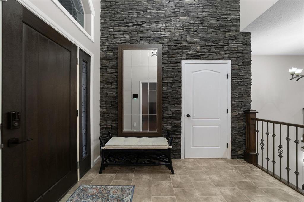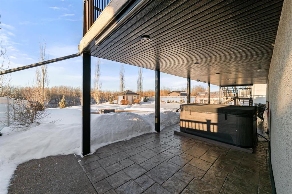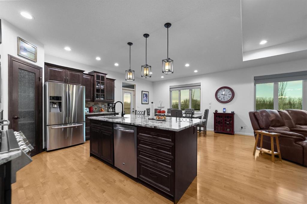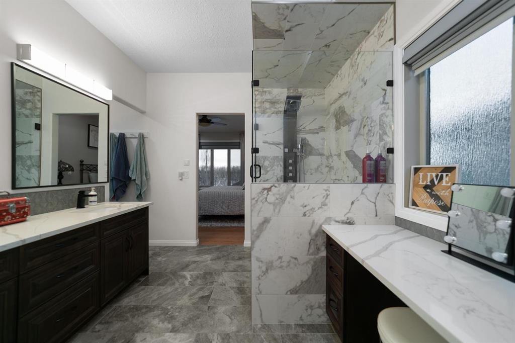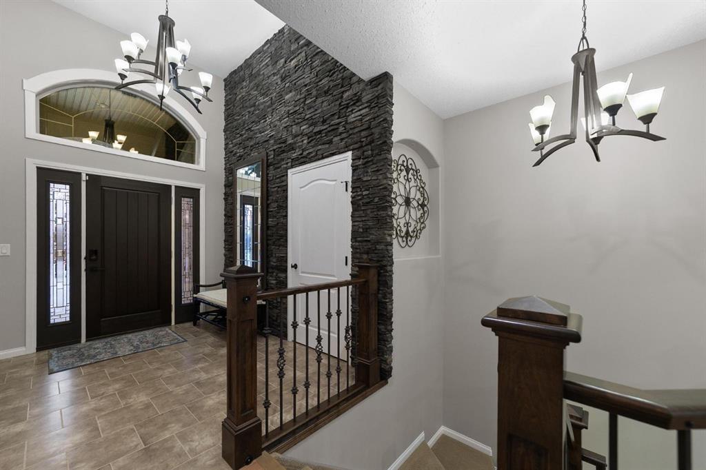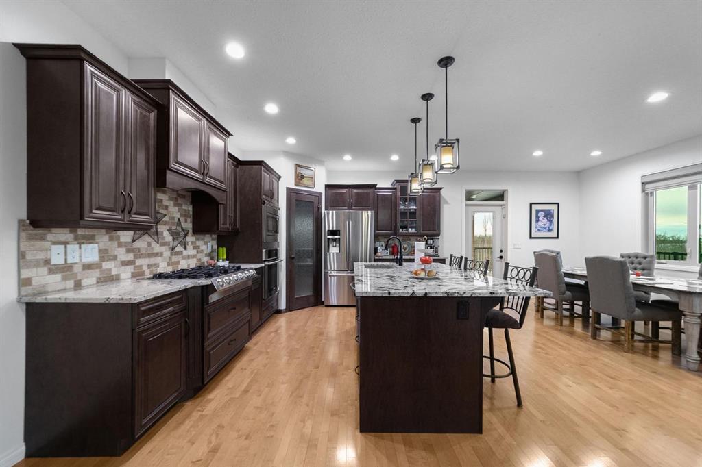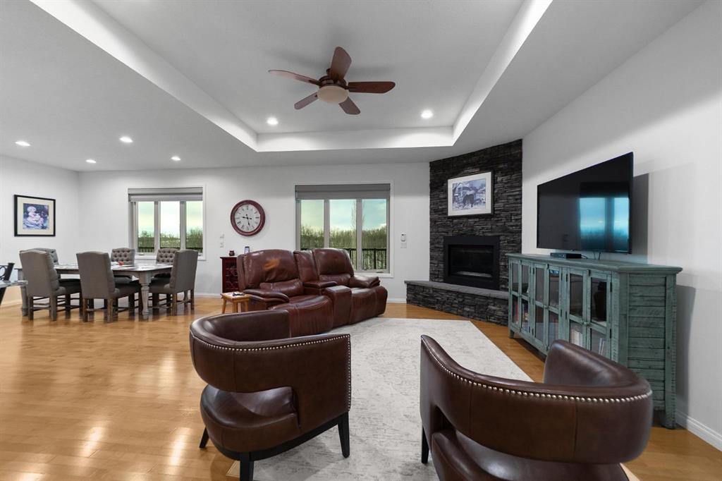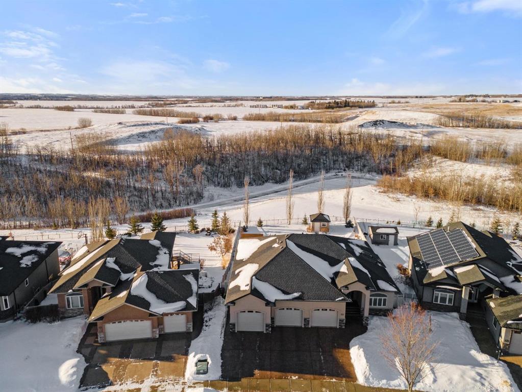 Experience unmatched views and exceptional craftsmanship in this stunning custom-built walkout bungalow, perfectly positioned in Valleyview overlooking the breathtaking valley landscape. Offering 3 bedrooms, 3 bathrooms, this home blends elegance, comfort, and thoughtful design across a bright, open-concept floor plan. Expansive windows flood the space with natural light—complemented by coffered ceilings, motorized blinds, and rich hardwood flooring. The impressive great room showcases a striking stone fireplace and open staircase framing panoramic views. The chef-inspired kitchen features granite countertops, a large entertaining island, 36” gas cooktop, built-in oven and microwave, and a spacious walk-in pantry. The adjoining dining space extends to a wrap-around covered deck, offering year-round enjoyment and remarkable valley scenery. The luxurious primary suite is a private retreat complete with spa-style ensuite and walk-in closet, with main-floor laundry and air conditioning adding everyday convenience. The fully finished walkout basement is designed for living and entertaining—featuring in-floor heat, a generous media/games area, additional bedroom and den, and a second stone fireplace. Step outside onto the covered patio with hot tub and firepit, perfect for unwinding or hosting guests. Sitting on a beautifully landscaped oversized lot with full irrigation, greenhouse, and storage shed, this home also includes an oversized heated 4-car garage with epoxy flooring. Exterior CHIC Permanent Stucco Protection offers lasting peace of mind with warranty. A rare opportunity to own a premier walkout bungalow with incredible views, premium finishes, and every detail considered—welcome home.