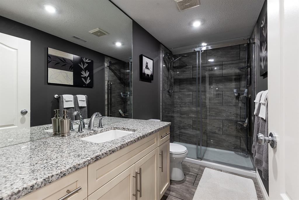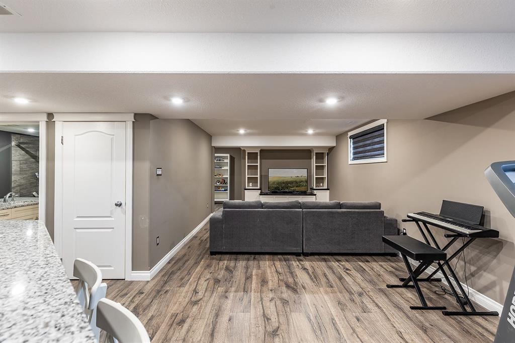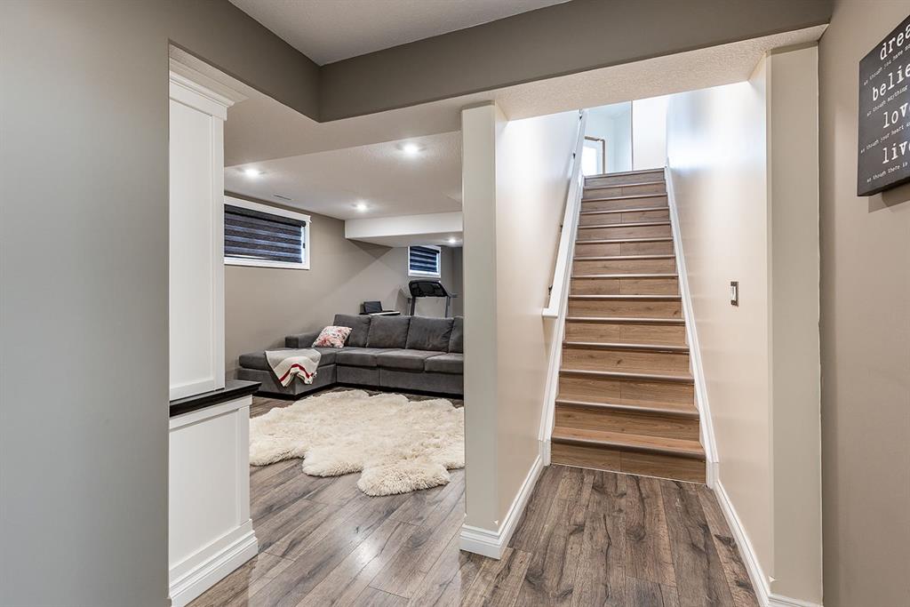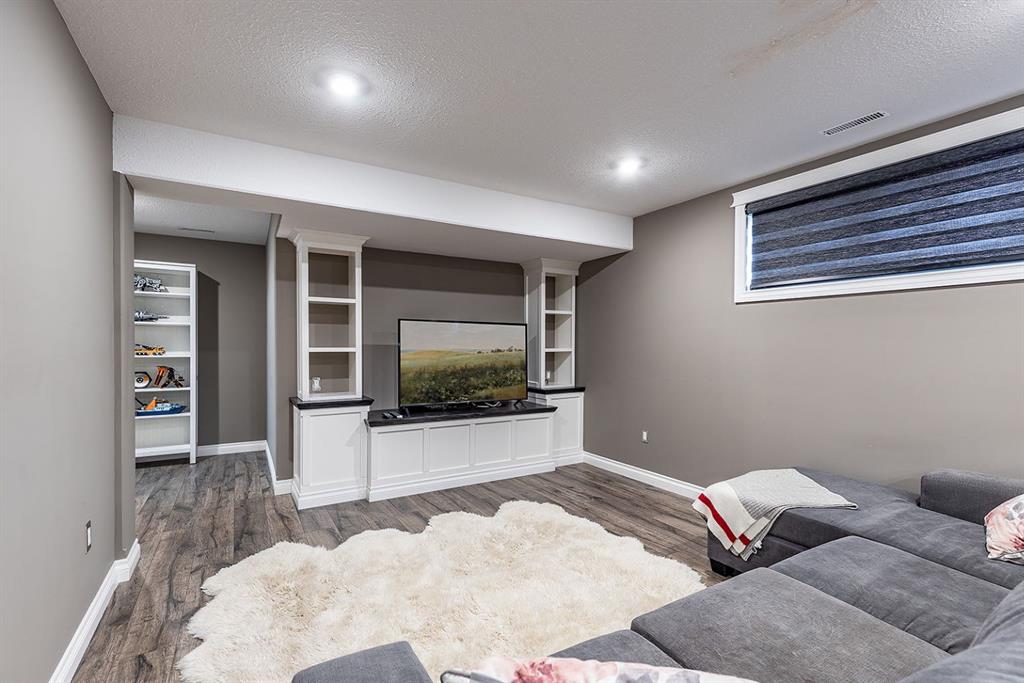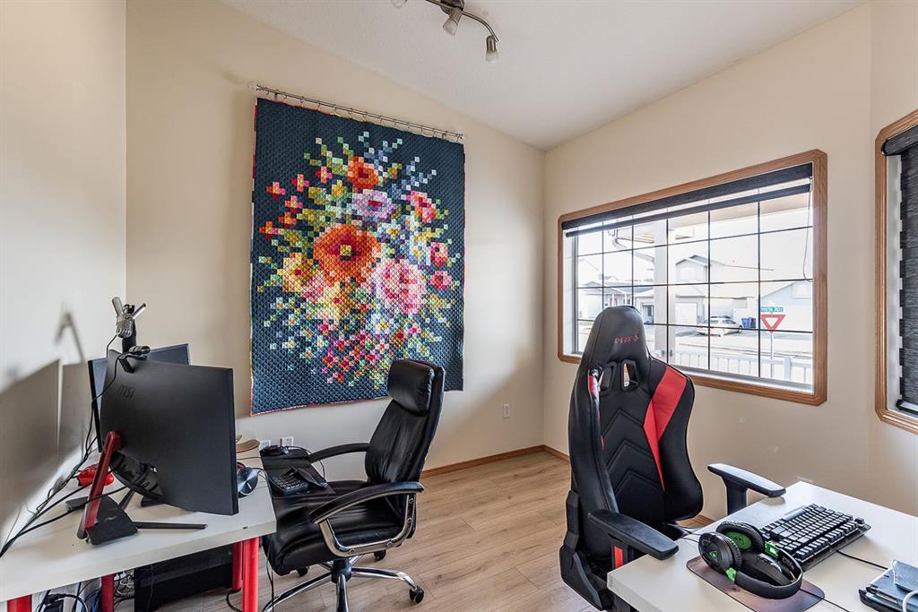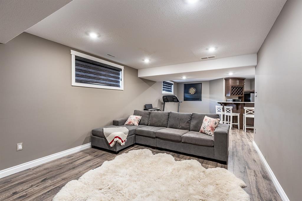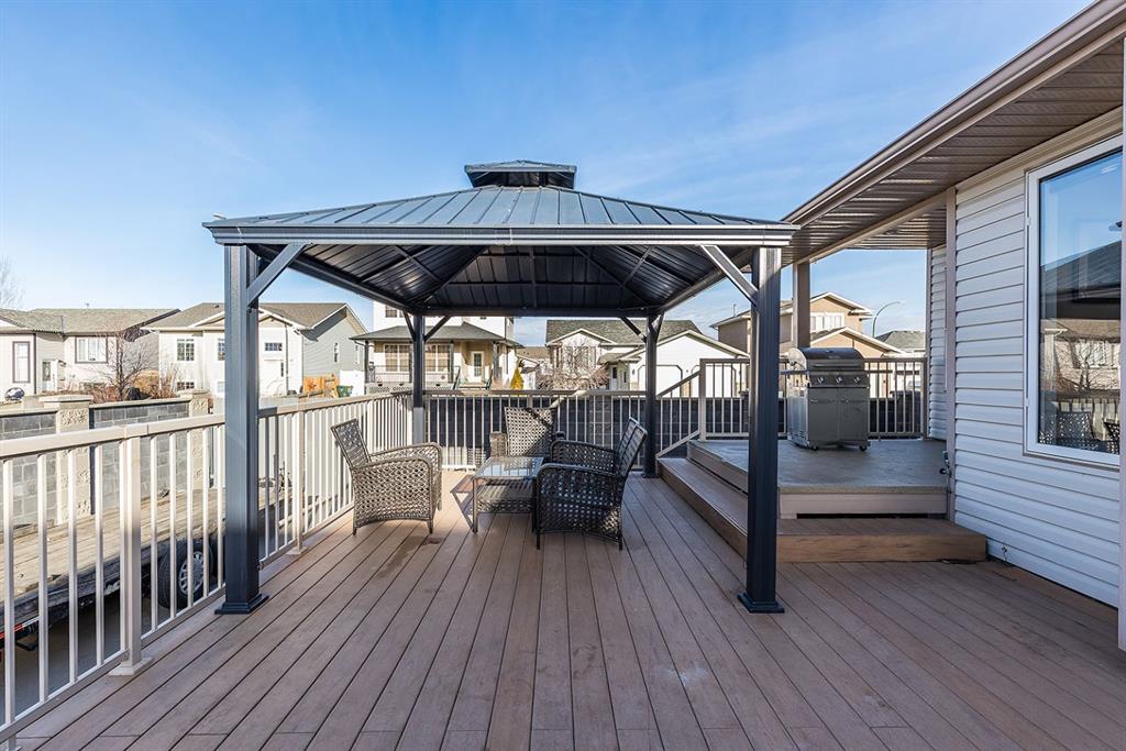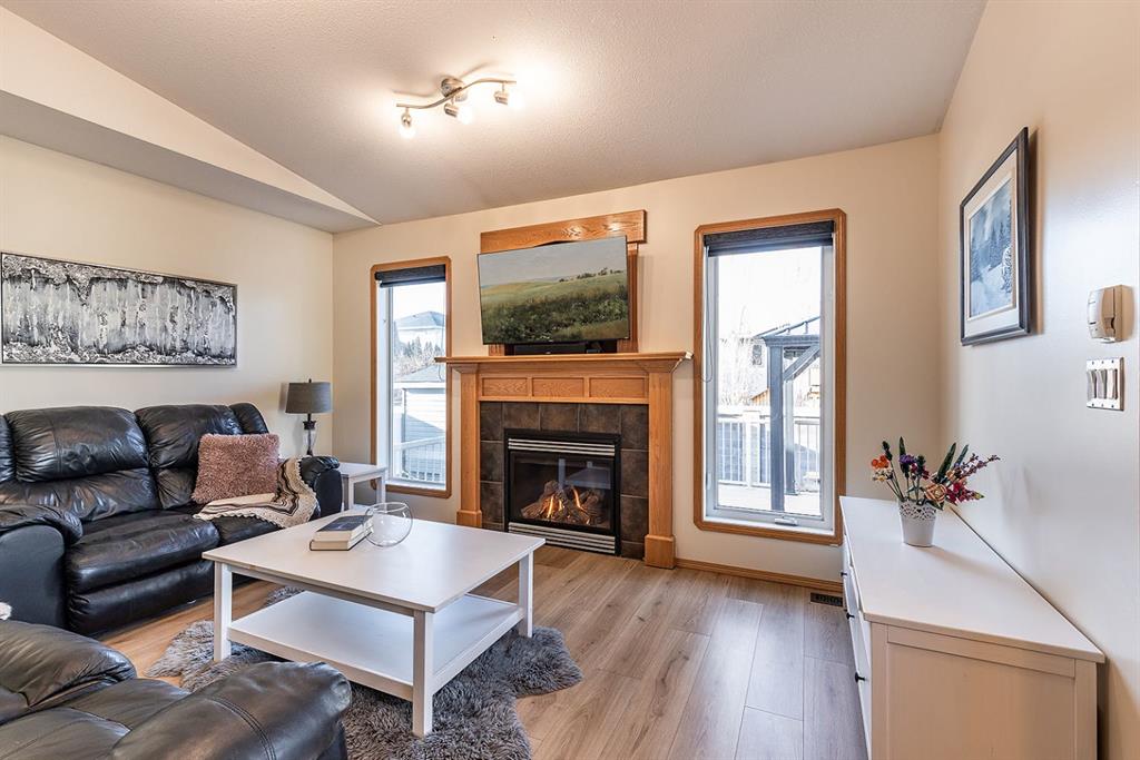 This beautifully designed 1,200+ sq ft bungalow is ideally positioned on a corner lot, showcasing a timeless brick front exterior, masonry fencing, and a thoughtfully planned low-maintenance yard complete with a storage shed. From the moment you enter, you’ll appreciate the bright, open layout enhanced by vaulted ceilings and vinyl plank flooring throughout the main level. The heart of the home is the spacious kitchen, featuring stainless steel appliances, a large island with seating, ample cabinetry, and seamless flow into the dining and living areas—perfect for both everyday living and entertaining. The inviting living room is anchored by a cozy gas fireplace, creating a warm and welcoming atmosphere year-round. Just off the main living space, step onto the oversized deck, ideal for summer barbecues, outdoor dining, or relaxing evenings. The main floor offers two generous bedrooms, including a primary suite with its own ensuite, along with a dedicated office—perfect for remote work or a quiet study space. Main floor laundry adds everyday convenience and completes the highly functional layout. Downstairs, the fully finished basement expands your living space with two additional bedrooms, a modern 3-piece bathroom with walk-in shower, and a well-appointed bar and entertainment area, making it an ideal space for hosting guests, movie nights, or accommodating family and visitors. Additional highlights include a double attached garage, ample storage options, and a layout that offers comfort, style, and practicality. This move-in-ready bungalow combines quality finishes, versatile living spaces, and an excellent location—perfect for families, professionals, or those seeking single-level living with room to grow.