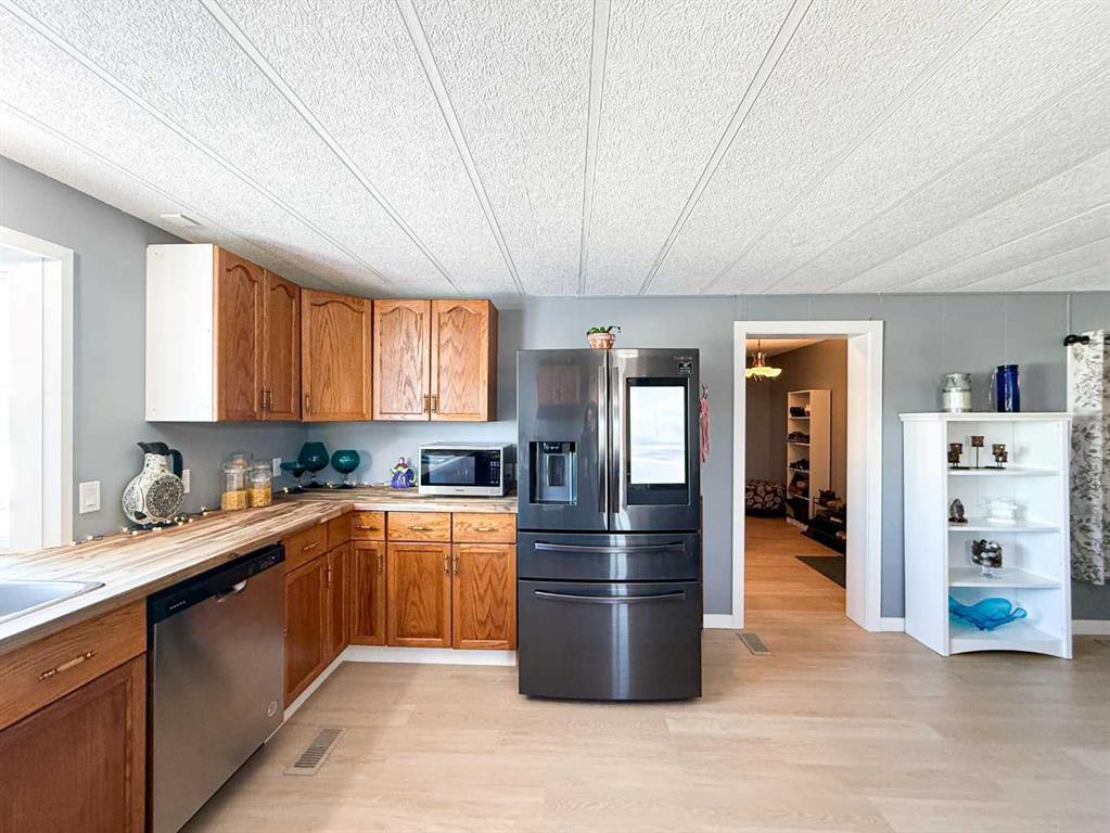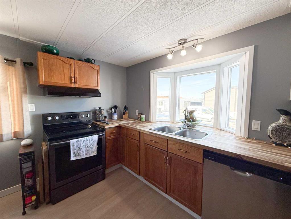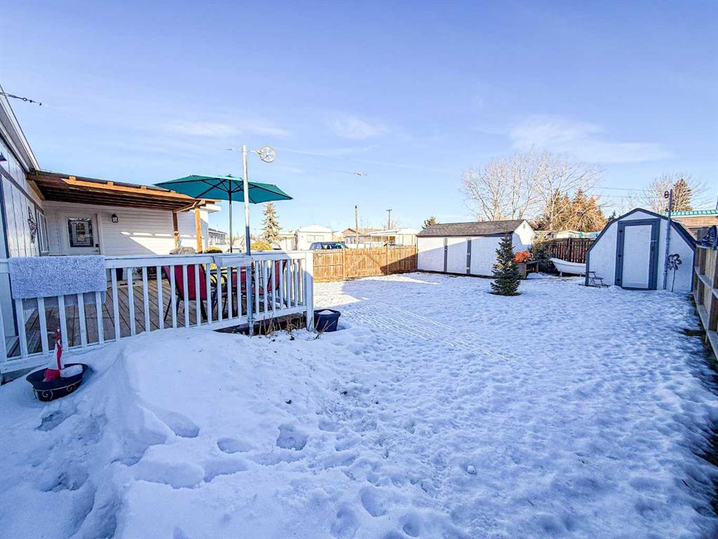 This beautifully updated home offers the perfect blend of stylish finishes and everyday livability. The addition has been completely redone and luxury vinyl plank flooring, new lighting, fresh paint and trim flow throughout the entire home. The kitchen features updated cabinetry with added pantry storage as you walk in, butcher block countertops crafted from naturally durable Acacia bamboo, a new dishwasher and newer appliances create inviting space for daily living. The kitchen, eating area and living room are all open to one another, offering a bright and cohesive layout ideal for everyday living and entertaining. A former second bedroom has been reconfigured to create a spacious, spa-inspired bathroom complete with a free-standing tub, corner shower, abundant storage and a newly relocated hot water tank for easy access. The home offers two generously sized bedrooms, including a primary bedroom with a custom closet. Vinyl windows, updated doors, a new furnace, fully updated plumbing and the complete removal of Poly-B offer long-term reliability and reduced maintenance. Outside, enjoy a fully fenced yard with an oversized, partially covered deck—perfect for entertaining—along with a clothesline, two storage sheds and a new exterior tap. Both the sheds and the home have been recently reshingled, completing this well maintained and move-in-ready property. Call today to book your private tour!!