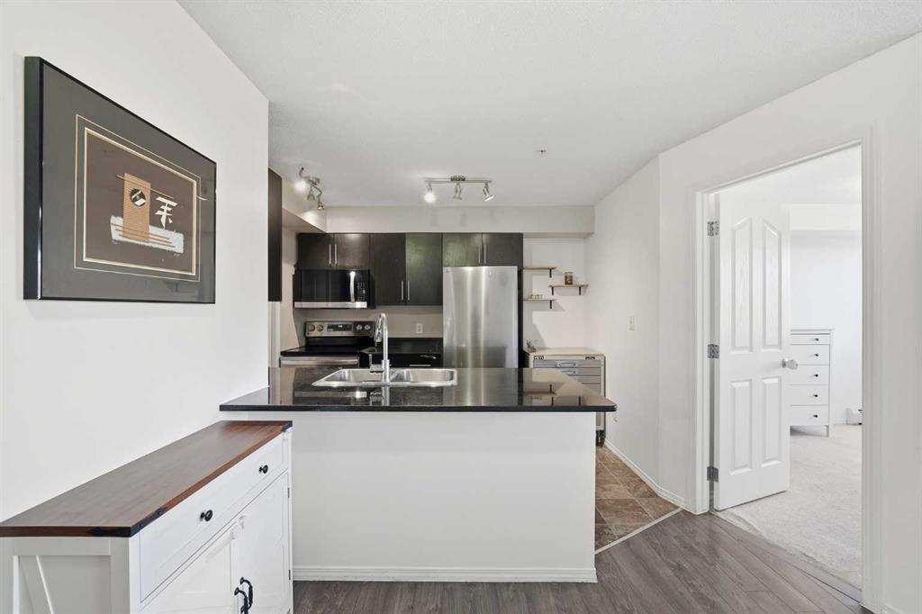 Welcome to this beautifully updated and well-maintained condo that’s truly move-in ready. Featuring two generous bedrooms and a full bathroom, this home offers a functional layout designed for comfortable, low-maintenance living. The modern kitchen is highlighted by granite countertops and brand-new stainless steel appliances, while newly installed laminate flooring adds a fresh, contemporary feel throughout the main living area. The bright and inviting living space is perfect for relaxing or entertaining. Located just minutes from shopping, dining, and everyday conveniences including Tim Hortons and nearby retail, this home also offers excellent accessibility to major routes. Low condo fees add to the value, and the dedicated parking stall located just steps from the stairwell provides unmatched convenience. Cozy yet refined, this condo is an ideal opportunity for first-time buyers, downsizers, or investors seeking a turnkey property in a highly convenient location.