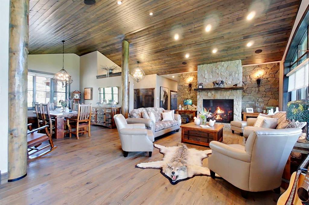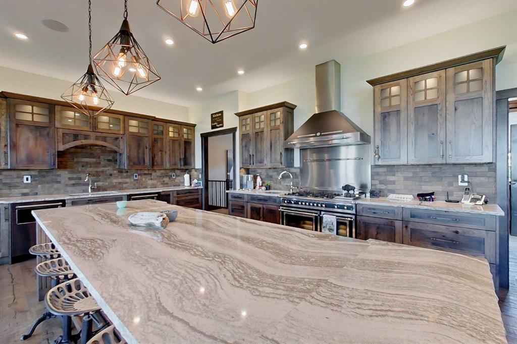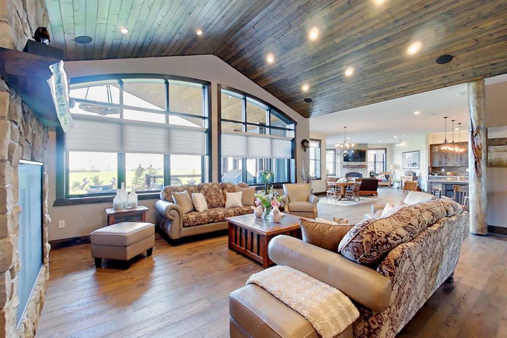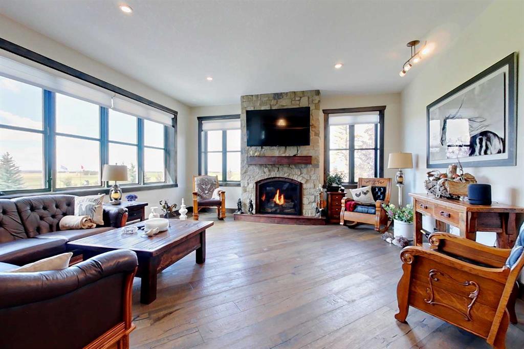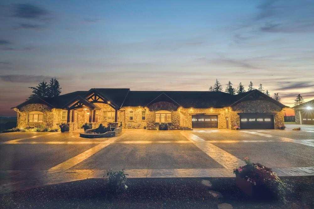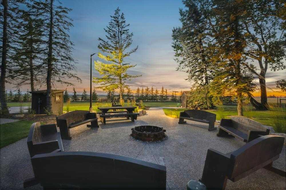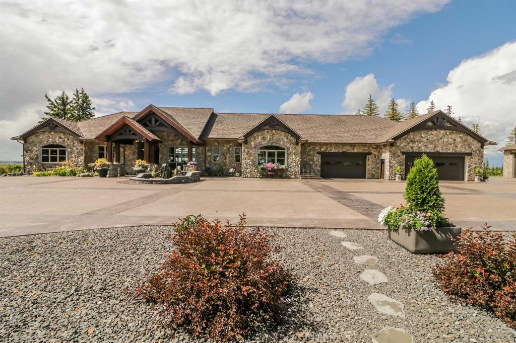EXECUTIVE ACREAGE WITH STUNNING MOUNTAIN VIEWS AND A PARKLIKE SETTING! First time offered for sale and extremely rare opportunity to purchase this pristine 5.21 +/- Acres Located Just mins South of Olds on pavement. This is the perfect central Alberta location with Less than a 1hr drive to the Calgary airport and just 40 mins to Red Deer. The entire property sends a majestic mountain lodge feel where nature, towering trees, mature landscaping, gardens, family fire pit area, wide open spaces with waterfalls & streams soothe the soul. Executive touches greet you at the impressive main entrance with beautiful timbers, stonework, wrought iron fencing and over 46000 sqft (over 1 acre) of concrete driveway and stamped concrete edging inlays. The sprawling 3690sqft bungalow is loaded with features and class. Built with ICF Block foundation and a top of line list of mechanical features and sound system throughout. Rough edge quartz counter tops highlight a huge island kitchen with two dishwashers, a gas stove imported from overseas , under counter lighting, custom detailed wood artwork and more! The wide open concept and massive west facing windows allow for natural sunlight to stream throughout the entire main floor. Two Large fireplaces on the main floor & main floor laundry. The Primary bedroom is fit for a queen offering the most luxury built-in closet organizers and a massive ensuite with heated floors, two sinks and huge quartz shower. Two more large bedrooms, a 4pc and 2pc bath on the main floor. The basement features a large rec room, bar rough in and future room for even more development. The custom details don't stop in the 62' x 48' attached and heated garage with epoxy floors, 2pc bath, in-floor heart and a hot-water make up heater for quick recovery of heat. The concrete apron just outside the garage doors is also heated. Outbuildings include a fully finished 28' x 28 'detached garage and a massive fully finished 50' x 100' shop with bright LED lighting, in-floor heat, an RV sani-dump station and separate 1542 sqft legal suite. The legal suite includes two full 4pc baths, two bedrooms, large bonus room with custom fireplace mantel, custom kitchen and more! A true 10/10 showing is guranteed! Your best move starts here!