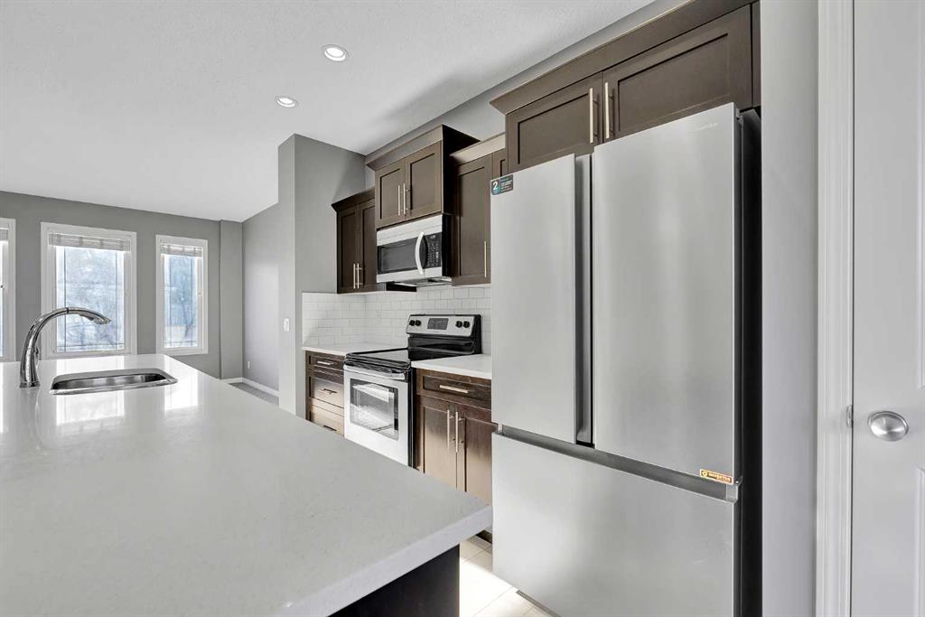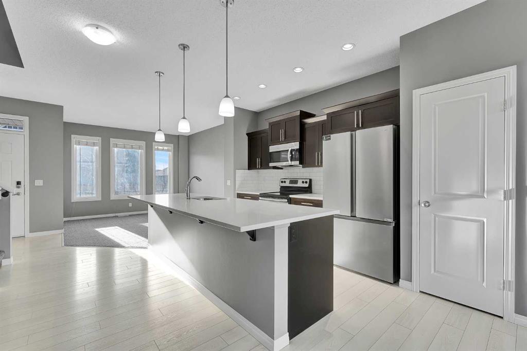 Modern upgrades and bright, functional living come together in this fully finished and MOVE-IN READY 2-storey detached home in the award-winning lake community of Mahogany. Offers 3+1 bedrooms, 3.5 bathrooms, a double detached garage, a fully developed basement and fresh paint throughout. Central A/C for those hot summer days. Quick possession available! The open-concept main floor is warm and welcoming, featuring a sun filled-living room with 9 ft ceilings and brand new carpet. a well-appointed central kitchen with a large quartz island, ample cabinetry, generous counter space, and SS appliances including a brand new fridge. Spacious dining area opens directly onto a huge 12x20 deck with gas hook-up for BBQ—perfect for summer entertaining, outdoor dining, or relaxing evenings in the private and fenced backyard (no neighbours behind). A convenient 2-pc bathroom completes the main level. Upstairs, the primary bedroom offers a private retreat with a walk-in closet and 4-piece ensuite, and a sunny balcony is great for morning coffee or reading a book. Complemented by 2 additional bedrooms and another full bath on this level. The fully developed basement adds excellent versatility with a large family/rec room, a 4th bedroom, and a 4pc bath—ideal for guests or a home office. Lots of storage space in the mechanical room and under the stairs. Outside, the backyard leads to the double detached garage, providing both parking and extra storage. Ideally located with easy access to Mahogany’s lake and beaches, residents enjoy amazing four-season amenities, plus access to nearby schools, parks, playgrounds, scenic pathways, and quick access to Mahogany Village Market, shopping, restaurants, transit, and major roadways. An outstanding opportunity to enjoy lake living at its best!