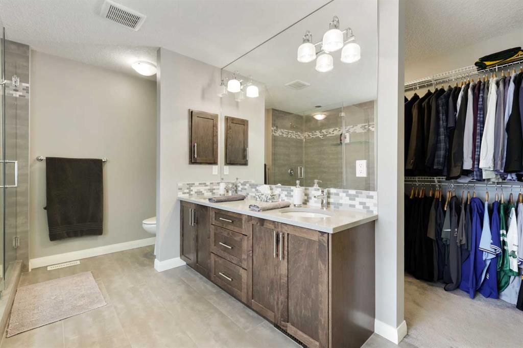 Location, luxury and lifestyle in this fully finished 2 story walkout backing onto hole #3 of the Track Golf Course in beautiful Boulder Creek Estates of Langdon. This exceptional home features water views, almost 2,800 sq ft of living space, central air conditioning and an incredible 5 car heated garage. A designated home office just off the front entrance is the perfect place to work or study away from the main living space. The main living area is a spacious open concept design with an entire wall of windows showcasing your stunning views. Enjoy all the bells and whistles in the chef’s kitchen. Ceiling height cabinetry, granite counters, high end stainless steel appliances including a gas range, wall oven and built-in microwave plus a walk through pantry that even has a coffee bar / butler’s pantry make this your dream kitchen come true. Between the dining room and kitchen is an expansive peninsula with seating perfect for friends and family to gather. The gas fireplace in the living room is both practical and elegant. Gorgeous wide plank hardwood floors and farmhouse inspired lighting throughout add to the charm of this home. The huge upper deck just off the dining room is perfect for outdoor dining, grilling and lounging while taking in your magnificent views. The large mudroom is the perfect place to keep the clutter of outerwear and gear out of your main living space. A 2 pc powder room rounds out this main level. Heading upstairs you’ll find a nice bonus room with a tray ceiling. It’s the perfect place for the family to curl up with a good book or to watch a movie together. The spacious primary bedroom has a large window overlooking your beautiful golf course & water views. Indulge yourself in the spa inspired 5 pc ensuite bath with freestanding soaker tub, large glass shower, heated floors and dual sinks. The oversized walk in closet is another luxury you’re sure to appreciate. The other 2 bedrooms share the main bath which has a door separating the sink from the rest of the bathroom making busy mornings a little less chaotic. You’re going to love entertaining with friends and family in the fully finished walk out basement. A rustic wood burning fireplace adds a warm and cozy vibe, and the wet bar, 4 pc bath and luxury vinyl plank flooring offer every convenience you could need. Step out to your covered patio area that leads to your huge outdoor living area. There is tons of lawn space for kids and pets to play, a stone fire-pit area for friends to gather plus manicured flower beds, raised planters and plenty of trees. Don’t miss your chance to call this home in the charming community of Langdon yours.