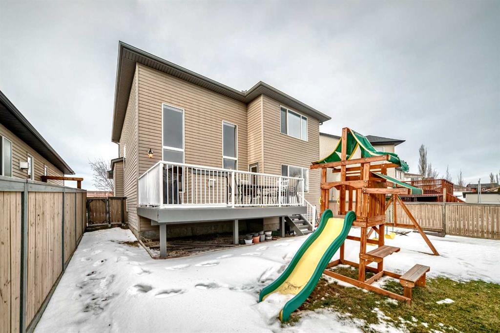 WELCOME to our exceptionally well maintained FORMER SHOWHOME home that offers 3,628 ft² of living space, thoughtful upgrades, and a prime family-friendly location. Situated directly across the street from Prairie Waters Elementary School and St. Gabriel the Archangel Catholic School, the home enjoys immediate access to two highly regarded schools, expansive green space, playgrounds, and convenient Calgary Transit access, including the nearby Purple MAX bus stop. The bright, open main floor features vaulted ceilings, large windows, upgraded maple cabinetry, a spacious island with eating bar, a walk-through pantry, and a great room with gas fireplace and built-in bookcase. Main floor laundry, a mudroom with built-ins, and a two-piece powder room add everyday convenience. Upstairs includes three bedrooms, a vaulted bonus room, and a primary suite with a five-piece ensuite, soaker tub, and walk-in closet. The fully finished basement adds two additional bedrooms, a renovated four-piece bathroom, and two separate recreation areas. You’ll appreciate the comfort of air conditioning, underground sprinklers, and a fully finished heated double garage with radiant heat, workbench, and cabinetry. The backyard features a large deck, a parking pad ideal for an RV, and a powered 8x15 hobby shop with overhead door. A well-rounded home in a location that truly supports family living.