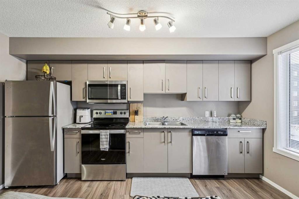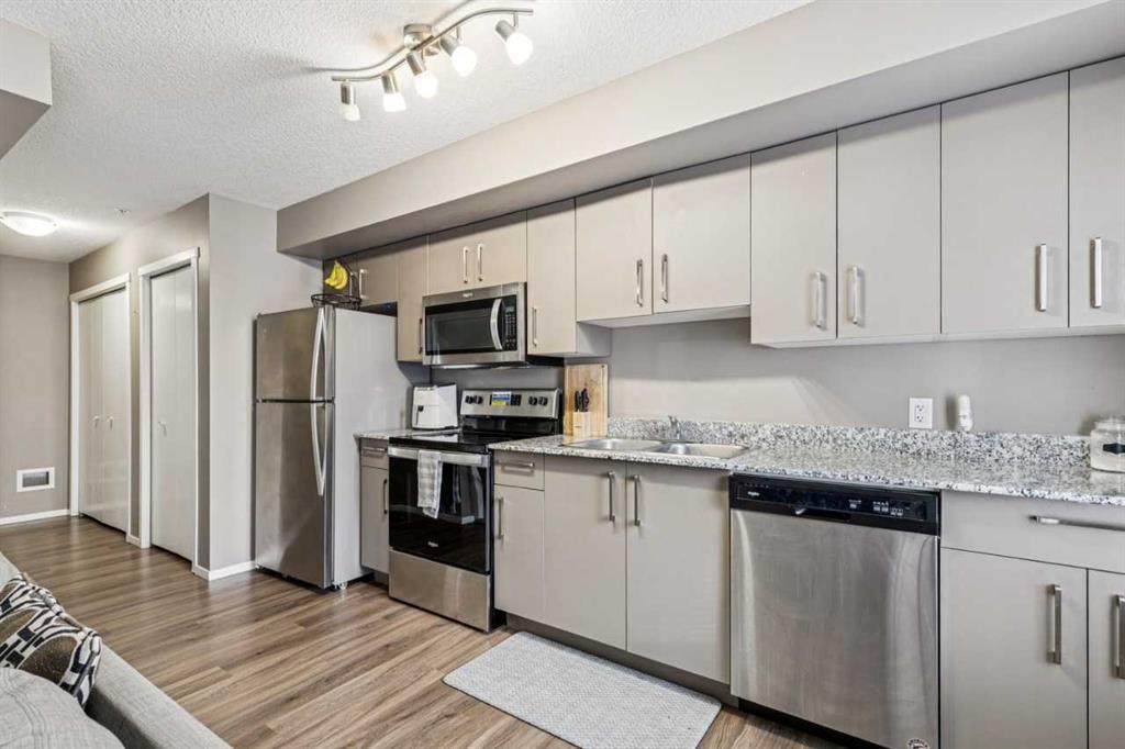 Welcome to this well-maintained apartment in the desirable community of Skyview Ranch. This bright and functional unit features titled heated underground parking, light-toned cabinetry, granite countertops, and a versatile den ideal for a home office or flex space. Enjoy mountain views from the private balcony. The professionally managed complex is pet-friendly (with board approval) and offers excellent amenities including two on-site fitness centres, recreation rooms available for booking, and ample visitor parking.