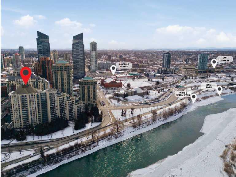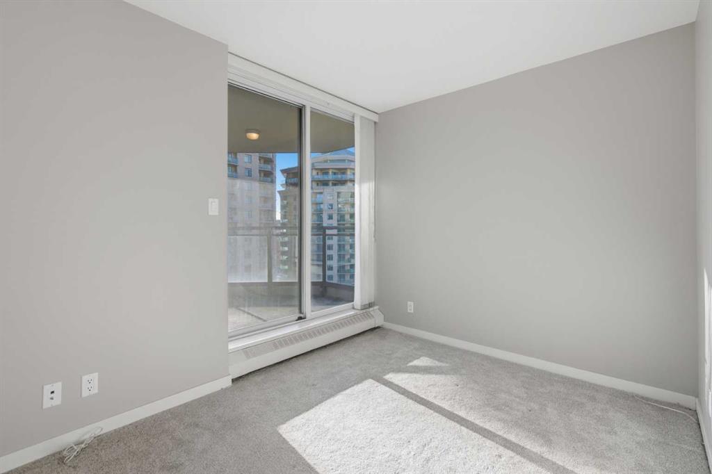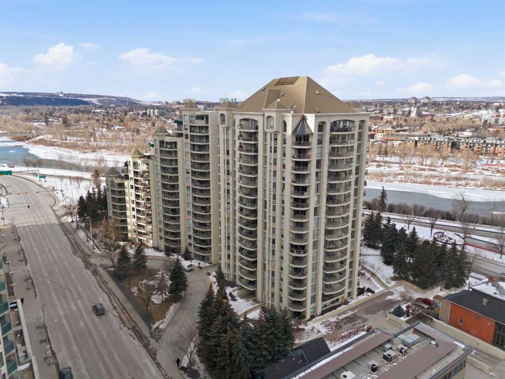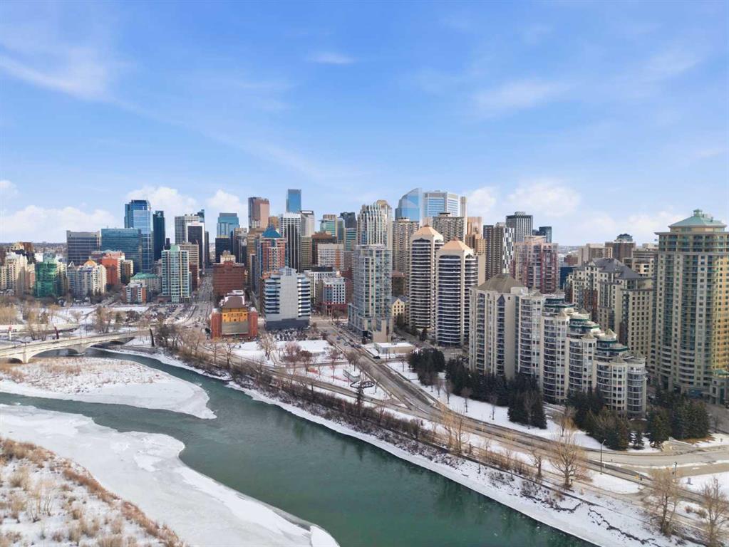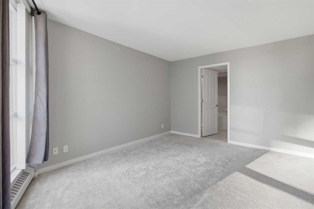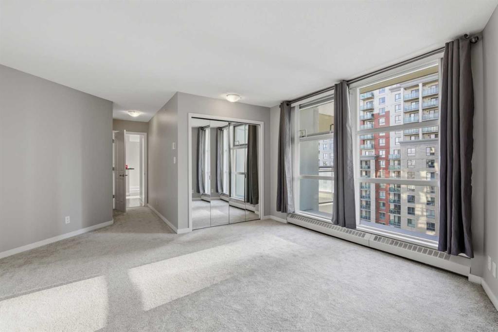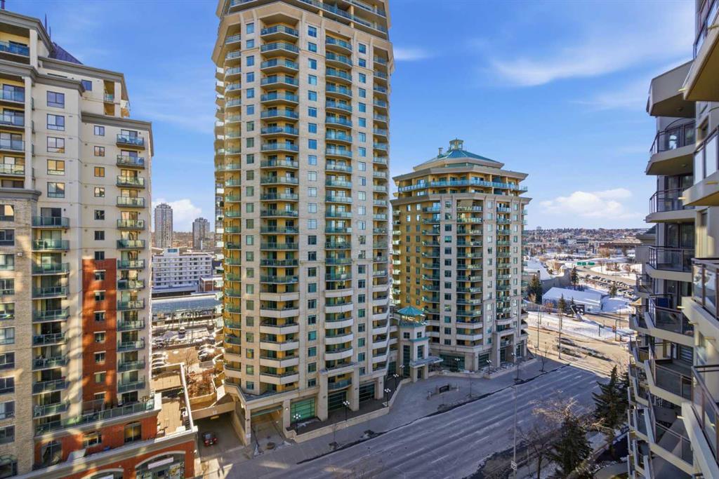 Welcome to Downtown's Westend! Enjoy abundant natural light through floor-to-ceiling, south-facing windows that brighten the entire unit. The primary bedroom features a well-appointed ensuite with a soaker tub, separate shower, and heated floors—also found in the second bathroom. You will appreciate the generous storage offered by two primary closets, including one walk-in. The open-concept living space showcases pristine Berber carpet and a versatile open den, ideal for a home office or reading area. The kitchen overlooks the dining space and is equipped with granite countertops, ample cabinetry, and sufficient room for two to work comfortably. A spare bedroom provides a welcoming option for guests, with convenient access to visitor parking. Additional features include one titled parking stall, party room, fitness centre, hot tub, and an exceptional location just one block from the C-Train, steps to Prince’s Island Park, and within walking distance to Kensington and downtown amenities. This is an excellent opportunity to live in a well-maintained building. Contact us today to book your private showing.