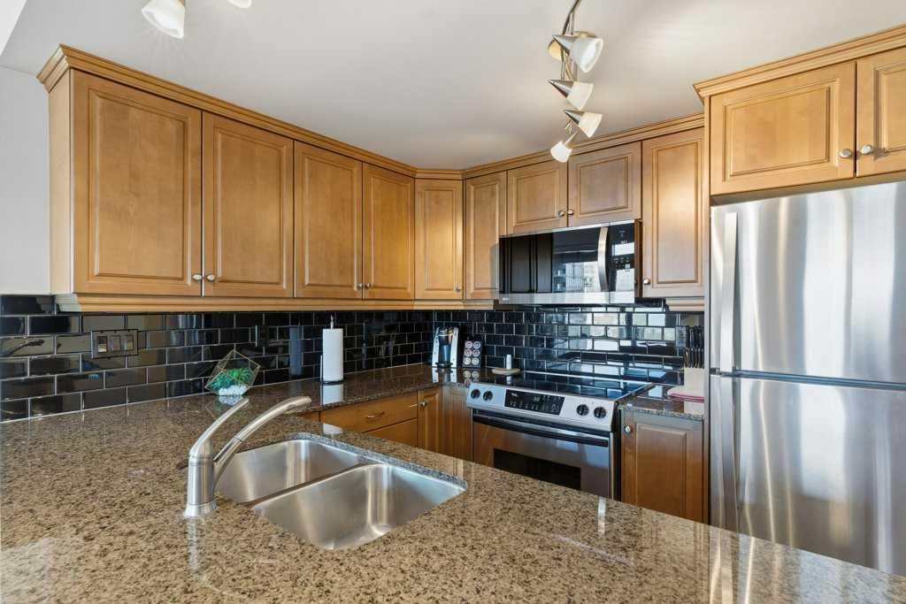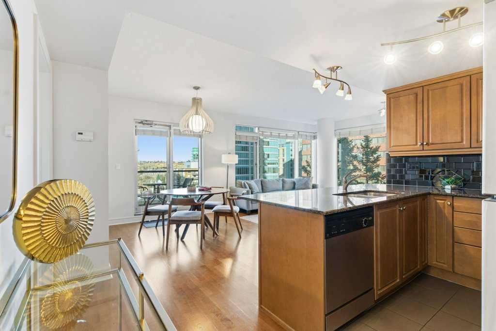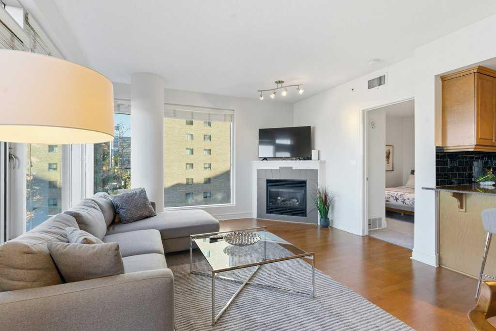 Urban Living at Its Best — Fully Furnished Executive Suite at Five West II. Unit can also be purchased without furniture. Experience luxury downtown living without the luxury price tag. This stylish, fully furnished 8th-floor executive suite in Five West Phase II delivers unbeatable river and city views — including the Bow River, Peace Bridge, and Kensington — by day and by night. The smart open-concept layout is designed for real life in the city. Host friends comfortably, work from home, or enjoy a cozy night in front of the gas fireplace with your favorite wine. Floor-to-ceiling windows flood the living and dining area with natural light, highlighting the sleek kitchen featuring Legacy cabinetry, granite counters, and stainless steel appliances. The spacious primary suite offers room for a king-size bed, a walk-in closet, and a private ensuite with modern finishing. A generous second bedroom with a cheater ensuite is perfect for guests or a home office. You’ll love the thoughtful extras too — front entry work-nook or storage option, in-suite laundry, air conditioning, and laminate flooring throughout. Titled underground heated parking + storage locker. Five West II brings elevated amenities to your doorstep, including a residents’ lounge with billiards and full kitchen, outdoor terrace, car wash bay, and full-time concierge service. Step outside and you’re moments from the Bow River pathways, Prince’s Island Park, top-tier dining, boutique shopping, transit, and downtown energy. This turnkey suite shows beautifully and offers the ultimate downtown lifestyle — views, convenience, comfort, and sophistication. Move in and start living your best city life.