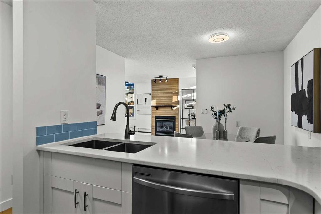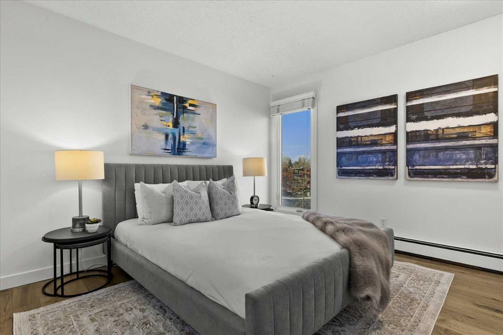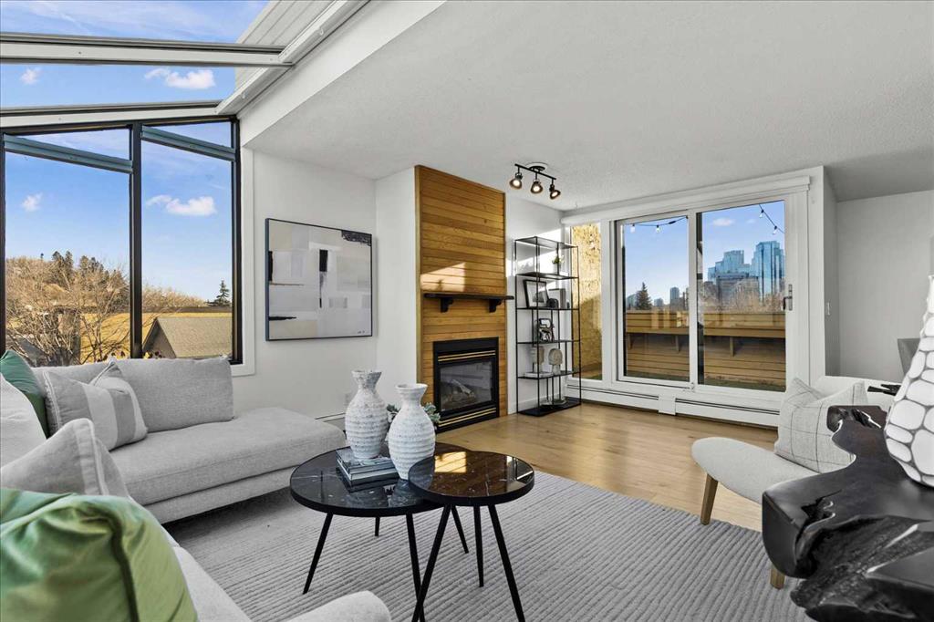 * New Price, Open House Weekend* Are you looking for a bespoke condo in a premium location with a gorgeous view of downtown? What about nearly 1000sqf on the top floor with numerous renovations, a solarium and steps from the restaurants and shoppes of Kensington Village? Perched atop one of the most recognizable condo communities in Sunnyside, this corner unit home features in home storage, an updated kitchen with newer appliances (brand new dishwasher, washer and dryer) and quartz counters – all while being part of a micro community within one of Calgary’s top locations. The neighbours that call this development home are some of the best you will find and spend time outside in the summer sharing in laughs and memories. A well-managed complex of only 14 units - minutes to the Bow River and hop, skip and jump into downtown is exactly what you are looking for in 2026. In addition to being super transit accessible, the crown jewel of this home is the expansive living room highlighted by a gas fireplace, access to the SE facing patio with stunning downtown views, and a unique sunroom style windows that bathe the home in natural light. The primary suite easily fits a king size bed plus has room for a reading nook, additional closet storage and an ensuite bathroom. Another ample bedroom, 4-piece bathroom, in suite storage room, and an assigned parking stall complete this offering. Much of this home has been freshly painted and all was professionally cleaned right before listing, so it is READY for you and available for quick possession. The building also offers bike storage and a cedar sauna, undated roof and windows, and refreshed hallways. Come and have a look before She Gon’!