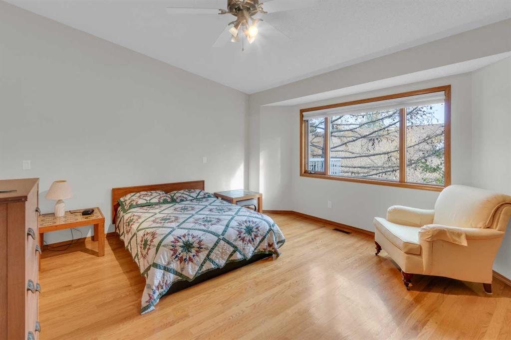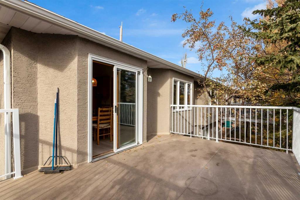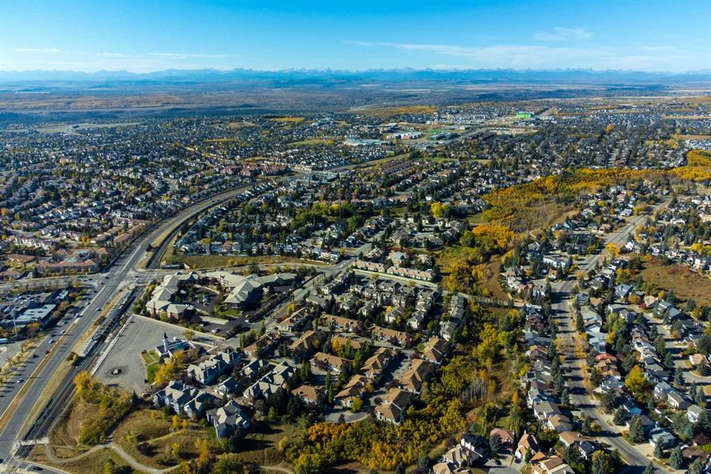 Over 2800 sq.ft. of developed living space in this exceptionally private, vaulted, walkout, villa style home in an amazing location! You will love the light airy feel of vaulted ceilings in the spacious main floor living, dining, kitchen, den/office, and bedroom areas. This surprisingly bright end unit walkout bungalow has sunlight spilling in all day from skylights plus large windows on 3 sides - south, west and east. Freshly painted in neutral designer colours throughout (Oct 2025) with vinyl plank flooring updates accenting hardwood floors in large functional living area with gas fireplace, dining and den areas. Enjoy sunrise coffees and cool evenings on the peaceful secluded and extended deck surrounded by birdsong in mature flowering trees. A big main level den or sitting room connected to a fresh white kitchen with a south facing box window which adds light to an already bright space. Generous walkout level family room with oversize windows and sliding doors to a private patio. Also features a large bedroom with adjacent full bath, plus 2 flex rooms and loads of storage. New HE furnace & HW tank, 2019. (NOTE: All the “Poly B” pipes have been replaced). Super convenient location - imagine walking literally just 1 block to Sunterra West Market Square, the L.R.T., coffee shops, pubs, and restaurants. Also close to natural ravine walking paths, dog parks & bike paths. Easy access to major commuting routes including Sarcee trail and the SW Ring Road. Click on 3D for interactive floorplans. NOTE This the end unit of a triplex. Just move in, relax, and enjoy your easy care, lock and leave lifestyle!