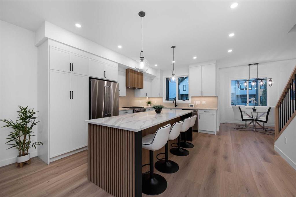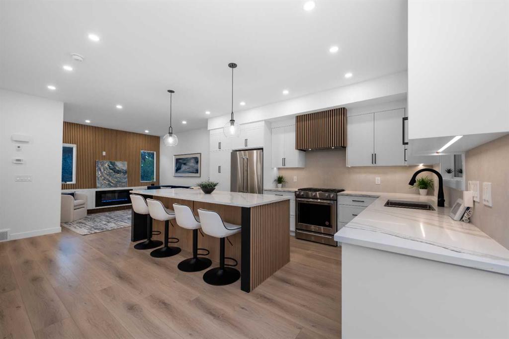 **Open House Saturday 1 pm to 4 pm** READY TO MOVE IN, BRAND NEW. The Opal on Westmount – Redefining luxury living in West Hillhurst. A modern contemporary 3-story row home just steps from shops and cafés, the Bow River pathway, and the vibrant amenities of Kensington. Designed for those who value elegance, functionality, and convenience, The Opal on Westmount offers a lifestyle that’s deeply connected to nature and city life, all within walking distance to great schools, churches, and outdoor recreational spaces. Situated on the corner of 23 Street and Kensington Road, this home offers unmatched convenience with quick access to downtown, Memorial Drive, and Crowchild Trail. Spanning 1,746 square feet of living space, this townhome is meticulously designed to accommodate active and professional lifestyles. The entry level features a versatile flex room with access to the garage and backyard storage; ideal for a home gym or storing bicycles, skies, and sporting equipment. The main floor has an open-concept layout, starting with a beautiful open living room that features an electric fireplace and wood slate acoustic feature wall. Beside that is a luxurious powder room draped in wallpaper. The gourmet kitchen is designed for entertaining with an unobstructed 9 ft island that can easily seat 4, shaker-style cabinets, a custom wood-slate hood fan, upgraded kitchen aid appliances, a gas range, double sized pantry, and an east facing sink that looks out the window towards the city skyline. Lastly, the main floor features a spacious dining area leading to a private 70 sq ft balcony that has a gas line perfect for a BBQ set up. The top floor is designed for comfort. The primary bedroom has a vaulted ceiling and features the custom wood slate panelling that is used throughout the home. A walk-in closet is hidden behind a pocket door, while the 4-piece ensuite boasts a standing shower and double sinks on an 7 ft vanity, with custom double mirrors on a upgraded wallpaper. Two additional well-sized bedrooms, a 4-piece main bathroom, and a convenient top-floor laundry complete the space. Throughout the home, contemporary finishes and premium materials add a touch of understated elegance. Sustainability meets convenience as the home is fully roughed-in for solar panelling and electrical vehicle charging, providing future-forward solutions for today’s homeowners. Outside, the low-maintenance landscaping is practical as it is beautiful. Move in ready! Book your private showing today.