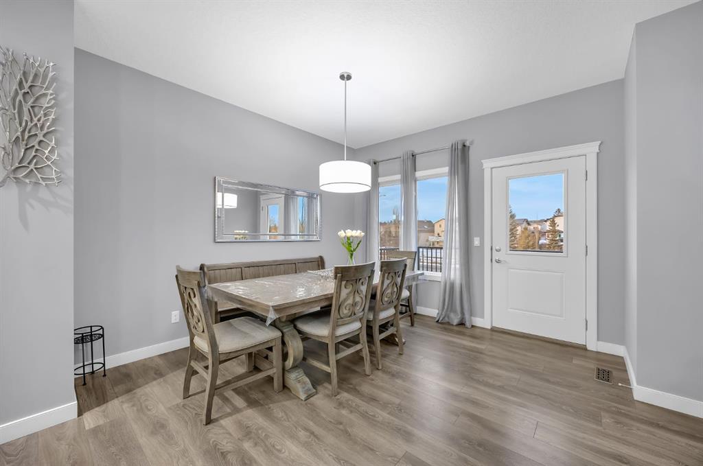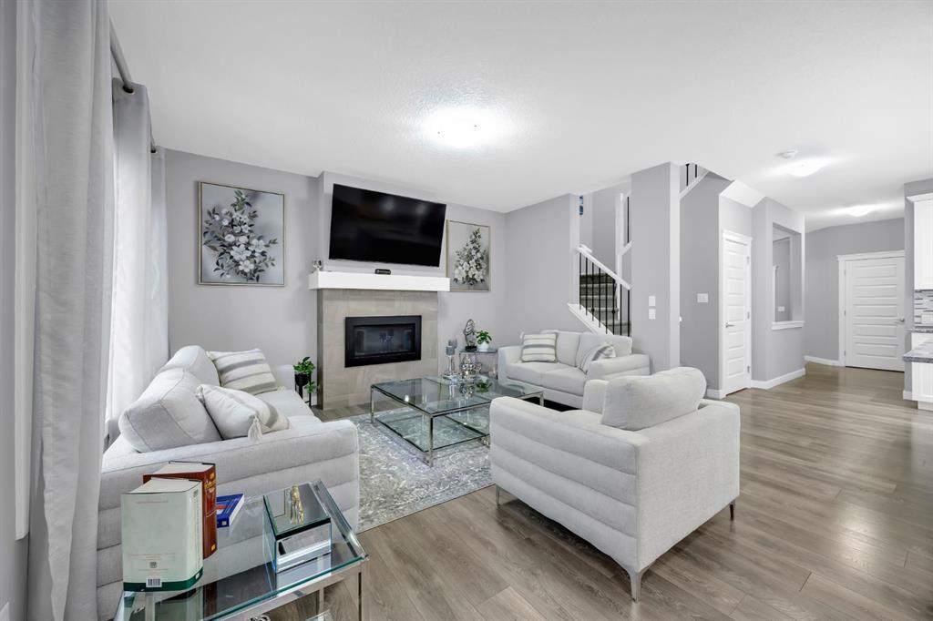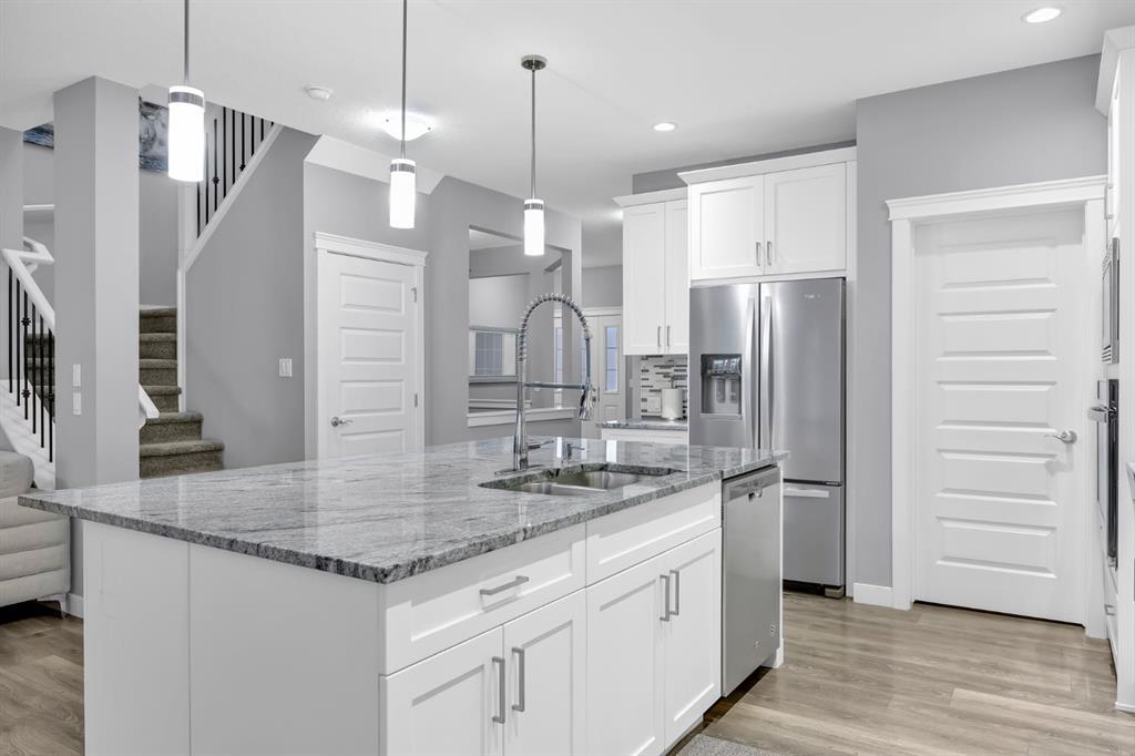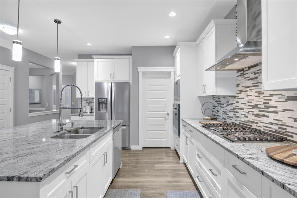 Welcome to 161 Ravenstern Crescent, a stunning 2-storey walkout home located in the highly desirable community of Ravenswood in Airdrie. Offering 2,449 sq. ft. of thoughtfully designed living space, this home features 4 bedrooms, 2.5 bathrooms, and a layout perfect for growing families. The main floor is both functional and stylish, showcasing durable vinyl plank flooring throughout. A versatile front office/den provides the ideal space for a home office, library, or study. The open-concept design flows seamlessly into the heart of the home — the chef’s kitchen, complete with stainless steel appliances, quartz countertops, a gas cooktop, built-in oven and microwave, and a large central island perfect for entertaining. A convenient walkthrough pantry connects directly to the kitchen, and a 2-piece bathroom completes the main level. The inviting living room is anchored by a cozy gas fireplace, creating the perfect gathering space. Upstairs, you’ll find a spacious bonus room, ideal for family movie nights or a play area. The upper level also includes three generously sized bedrooms, a shared 5-piece bathroom, and a convenient laundry room. The primary retreat is impressively sized and features a large walk-in closet and a luxurious 5-piece ensuite, offering a private space to unwind. The walkout basement is undeveloped and ready for your personal touch — whether you envision additional living space, a home gym, or a guest suite. Ideally located close to schools, shopping, parks, and offering easy access to major highways, this home combines comfort, convenience, and future potential. Book your private showing today and experience everything this exceptional home has to offer!