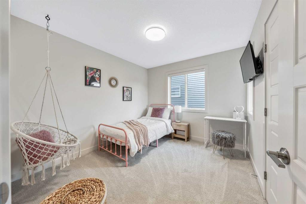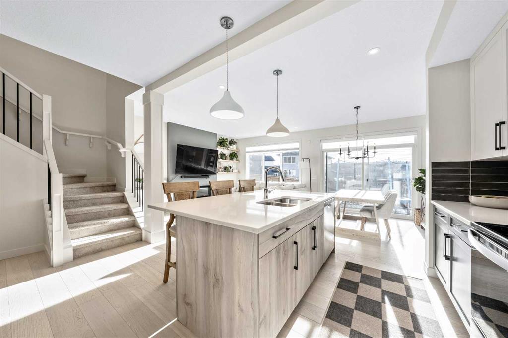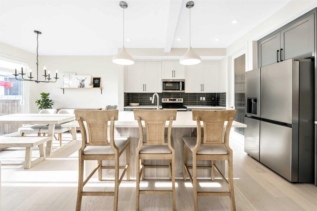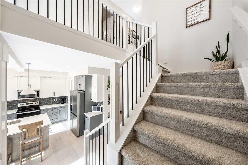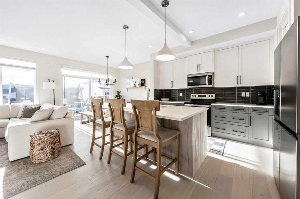 Situated on a quiet street in the centrally located community of Greystone—just steps from a park & playground—this beautifully upgraded home features a sun-filled, fully fenced south-facing backyard, ideal for both entertaining and everyday living. Thoughtfully designed with an open, modern layout, this 3-bedroom, 2.5-bath home offers over 1,762 sq. ft. of stylish living space and showcases numerous premium upgrades throughout. The main floor makes an immediate impression with an elegant 8’ glazed front door, 9’ ceilings, oversized windows, and refined 8’ interior doors. Engineered hardwood flooring flows seamlessly through the foyer, hallway, great room, kitchen, and dining nook, creating a warm and cohesive atmosphere. The kitchen is a true showpiece, featuring a large single-level 7’ entertainment island with breakfast bar, quartz countertops, and a spacious walk-in pantry with 8’ French doors. Additional highlights include 42” upper cabinetry with dropped bulkhead, soft-close doors and drawers, dedicated pots-and-pans storage, and a full stainless steel appliance package, including a refrigerator, smooth-top electric range, microwave/hood fan, and built-in dishwasher. The bright and inviting great room and dining area are flooded with natural light from oversized windows and an 8’ wide sliding patio door, while the striking Napoleon Entice fireplace adds both style and warmth—perfect for relaxing evenings or hosting guests. Upstairs, the primary suite offers a private retreat complete with a well-appointed 4-piece ensuite featuring dual quartz vanities with undermount sinks, an oversized shower, ceramic tile flooring, and a private water closet with a window. A generous walk-in closet is conveniently accessed through the ensuite. The upper level is completed by a spacious front bonus room, two additional well-sized bedrooms with ample closet space, a full main bathroom with quartz countertops and tile flooring, and a convenient second-floor laundry room finished with tile. The unfinished basement features 9’ ceilings, providing an excellent opportunity for future development and allowing the new owners to create a space perfectly tailored to their needs—a true blank canvas. Bright, modern, and ideally located in a family-friendly community, this home offers exceptional value and versatility and truly checks all the boxes.