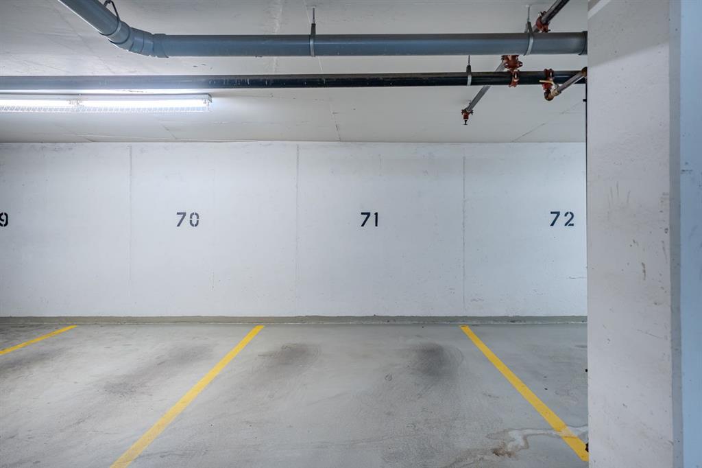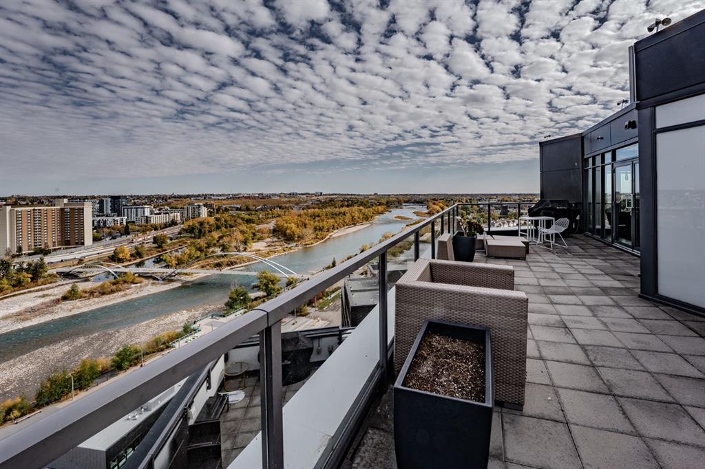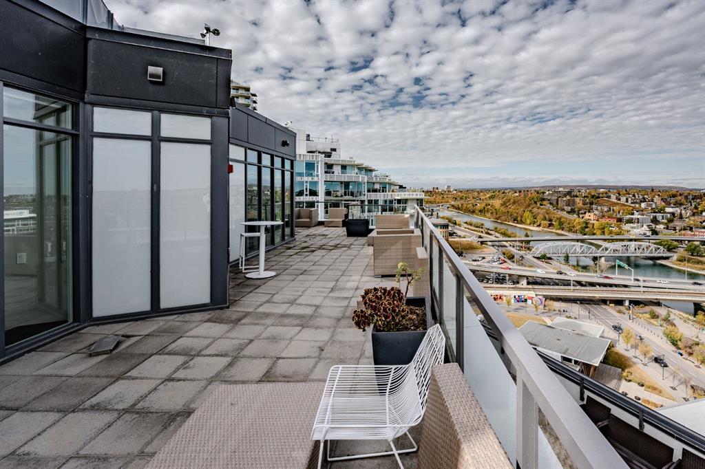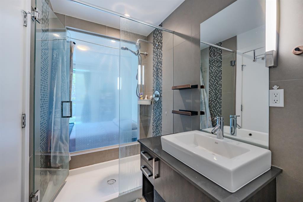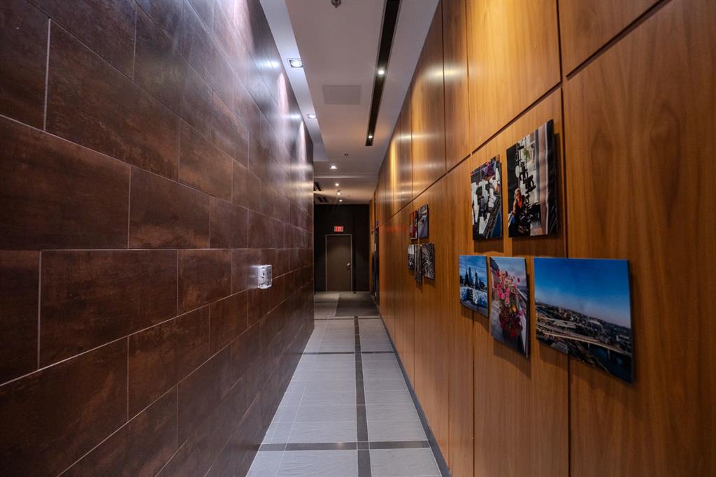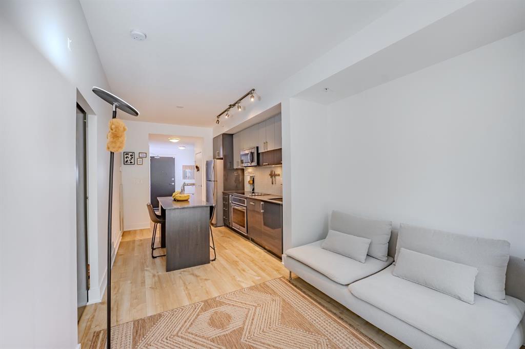 Welcome to the First, a modern condo in the heart of Calgary’s East Village. This one-bedroom, one-and-a-half-bath home offers a smart layout with beautiful finishes and plenty of natural light. Large windows fill the space with sunshine, and the private balcony overlooks a quiet courtyard, giving you a peaceful spot to enjoy your morning coffee or relax in the evening. The entryway opens into a practical foyer with a half bath for guests and a tucked-away laundry area. The kitchen stands out with stainless steel appliances, quartz countertops, a built-in oven, and soft-close cabinets. The island adds extra prep space and makes it easy to entertain or enjoy casual meals. The living area feels bright and open, flowing nicely into the bedroom. Behind a sliding barn door, you will find a large walk-in closet and a stylish ensuite with a glass rainfall shower that feels like your own private spa. You will also have central air conditioning, a titled underground parking stall, and a large storage locker for convenience. The building offers great amenities, including a fitness center, yoga room, party lounge with a kitchen and bar, sky club with a pool table, business meeting room, and a rooftop patio with BBQs. Located steps from the Bow River pathways, the Simmons Building, the Central Library, and plenty of shops and restaurants, this is a perfect spot for anyone who wants to enjoy city living with comfort and style. Whether you are an investor, professional, or student, this home offers the ideal mix of convenience, design, and location.