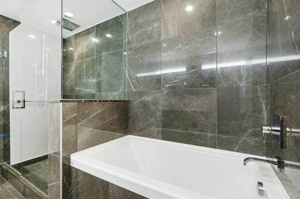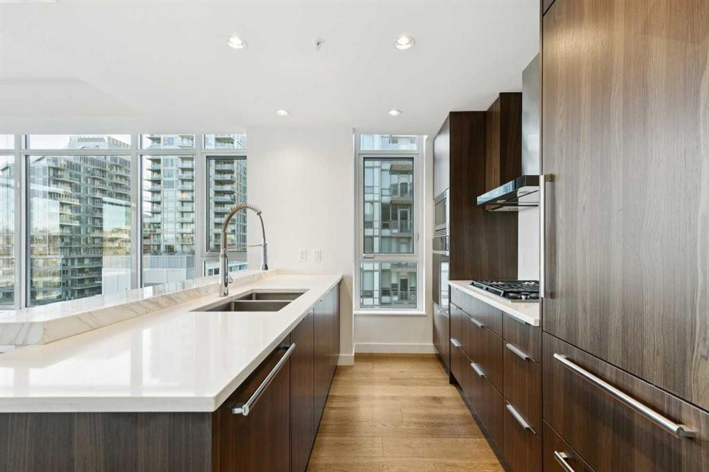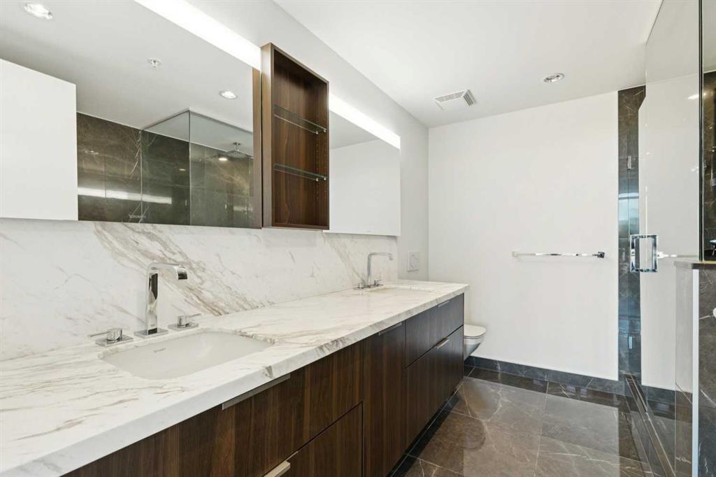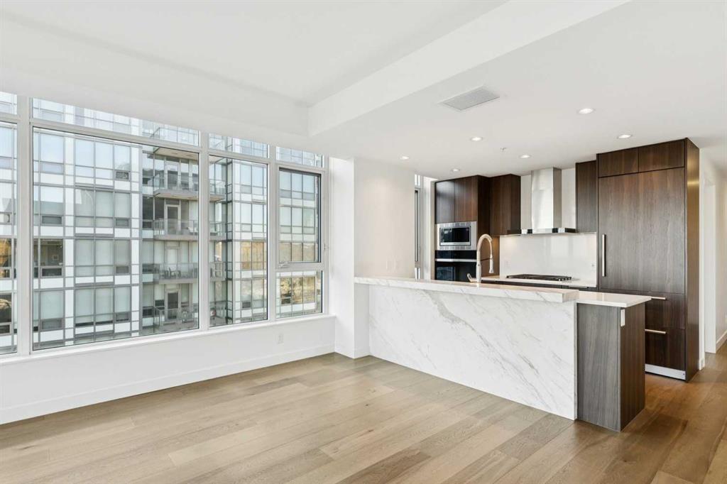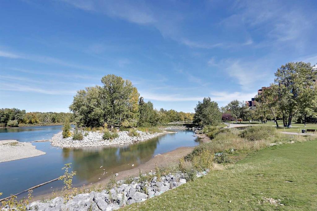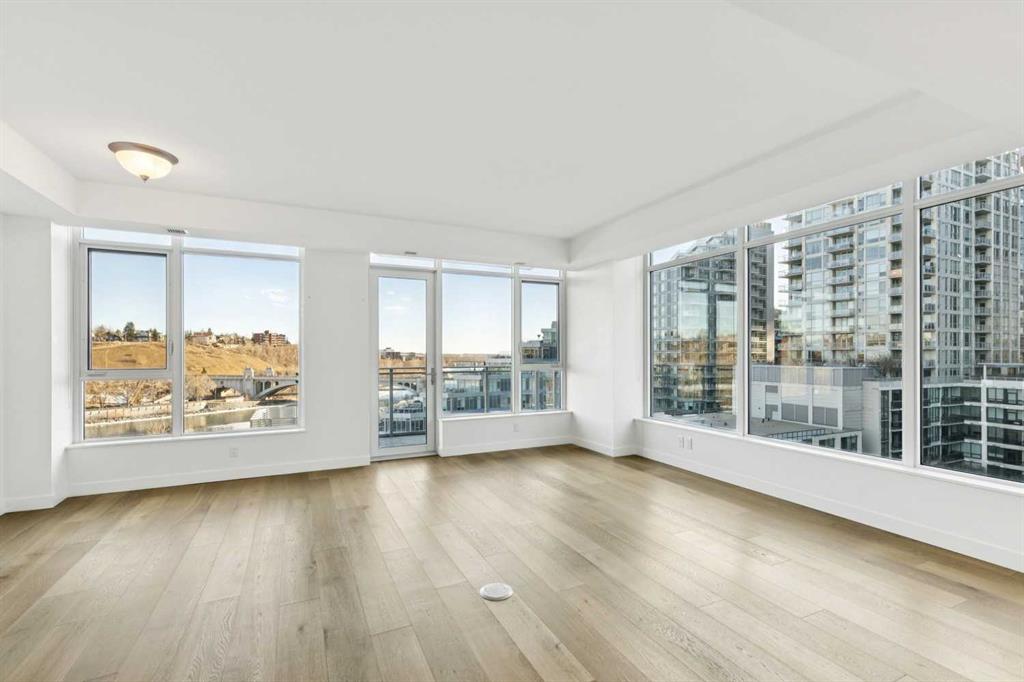 With spectacular, unobstructed views of the Centre Street Bridge, Prince’s Island Park, and the Bow River valley, this stunning two bedroom unit offers one of the most iconic outlooks in the city. With the land in front already developed, the breathtaking views are securely protected. Floor-to-ceiling corner windows flood the apartment with natural light, enhancing the thoughtful two-bedroom, two-bathroom layout, ideal for comfortable living for one or two. The expansive living area opens to a private balcony where river, park, and city views take centre stage. Wide-plank, light-toned laminate flooring runs throughout, complemented by freshly painted interiors and sophisticated, timeless finishes. The contemporary kitchen is both elegant and highly functional, featuring premium appliances including a Wolf gas cooktop and wall oven, integrated Sub-Zero refrigerator, panelled Asko dishwasher, quartz countertops, a marble breakfast bar, ample storage, and a full pantry. The primary bedroom offers a generous walk-in closet and a beautifully appointed ensuite with dual sinks, marble counters, a soaker tub, and a large shower. The second bedroom is well-sized with a window overlooking the city centre and located across from a full bathroom. Additional features include in-suite laundry with folding counter and storage, two assigned underground parking stalls, and a separate storage locker. Building amenities include a well-equipped fitness centre, bike storage, Concierge services and a car wash bay. Steps to river pathways, Prince’s Island Park, the Peace Bridge, downtown, top restaurants, and year-round festivals - this is exceptional inner-city living.