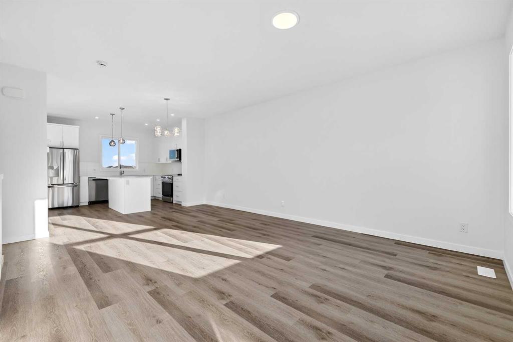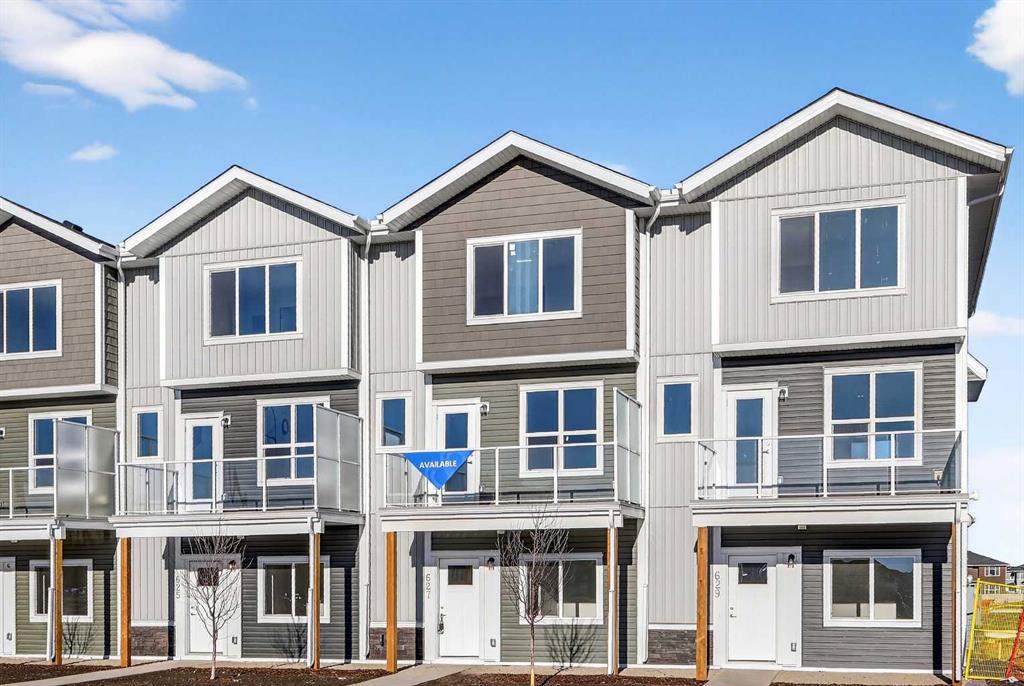 StreetSide proudly presents this exceptionally popular interior-unit townhome, where expansive living areas meet modern comforts and sophisticated finishes. The thoughtfully designed floorplan features three spacious upper-level bedrooms and two and a half well appointed bathrooms, complemented by a versatile lower-level den perfect for a home office or quiet retreat. The heart of the home is an inviting open-concept main floor, anchored by a large gourmet kitchen featuring a functional breakfast bar for casual dining. This bright living space transitions seamlessly to a private balcony, offering a perfect setting for outdoor relaxation. The interior showcases high end craftsmanship, including modern white slab-style cabinetry with a full bank of drawers for maximum storage. The kitchen is further elevated by polished white quartz countertops and a full suite of premium stainless steel appliances. Durable luxury vinyl flooring runs throughout the primary living areas, while the stairs and upper level are finished with plush carpet over an 8lb underlay for superior comfort. This residence is a water meter unit, allowing for precise and efficient utility management. Additional conveniences include an attached double car garage, professionally maintained landscaping, and a lifestyle defined by maintenance free living. Located within Red Embers Point East, this home places you at the heart of the dynamic Redstone neighborhood. Enjoy the ease of a convenient location with quick access to major routes, including Stoney Trail, ensuring you are never far from the city's best. The community is strategically positioned near future commercial developments, promising shops, services, dining, and entertainment options just moments from your doorstep.