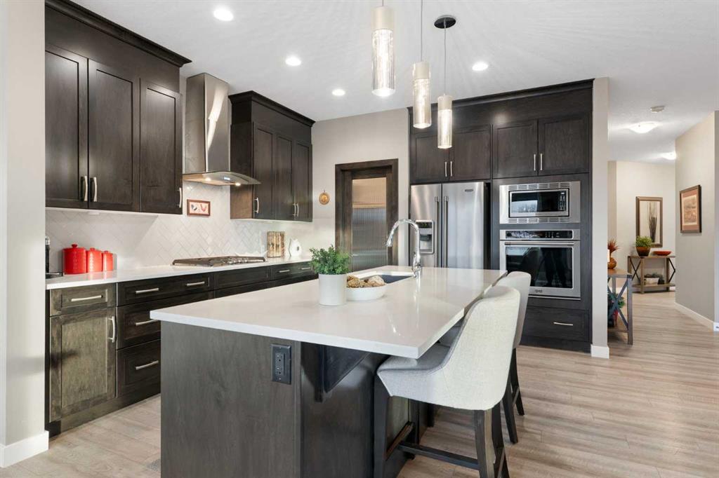 Backing onto peaceful greenspace and wetlands, this beautifully maintained two-storey home in Fireside offers a rare combination of privacy, functionality, and thoughtful upgrades throughout. With a fully finished walkout basement and partial mountain views, this home is designed to enjoy every season. The main level features luxury vinyl plank flooring, a bright & open layout anchored by a well-appointed kitchen with Maytag appliances, including a gas range, built-in oven, and fridge with ice and water. Six pot drawers, generous cabinetry, and a seamless flow to the upper deck make this space ideal for everyday living and entertaining. Step outside to the expansive 27' upper deck finished with durable Duradek flooring, privacy walls, a deck cover with sun roller blind, and a natural gas BBQ hookup, all overlooking tranquil greenspace. Upstairs, the thoughtful layout truly shines with four generously sized bedrooms, a large bonus room, and convenient upper-level laundry, making this home ideal for a growing or multi-generational family. The primary retreat offers a thoughtfully designed ensuite with double sinks, walk-in closet, and a deep soaker tub, creating a calm space to unwind at the end of the day. Additional bedrooms are well proportioned and versatile for kids, guests, or home offices, while the bonus room provides the perfect hub for movie nights, play space, or a second living area. The fully finished walkout basement extends the living space and truly sets this home apart with an extra bedroom and full bathroom. A Dry-Core subfloor keeps the basement warm and comfortable year-round, while the walkout leads to a beautiful sunroom designed for relaxation. With three sliding patio doors, this enclosed space creates a peaceful, wind- and bug-free environment, perfect for enjoying the hot tub or unwinding while taking in wetland views. The backyard has been professionally levelled with a retaining wall, is fully fenced with solar lighting, and backs directly onto green space, offering privacy and a strong connection to nature. Additional highlights include central air conditioning, built-in cabinetry in the garage, vessel sink in the powder room, and negotiable items such as a Broil King natural gas BBQ and additional fridges. Located in the family-friendly community of Fireside, close to schools, parks, pathways, and amenities, this home delivers a rare blend of lifestyle, comfort, and setting.