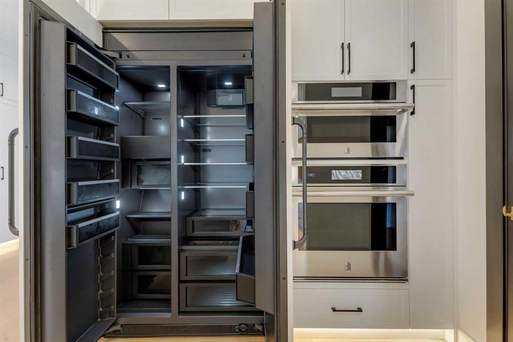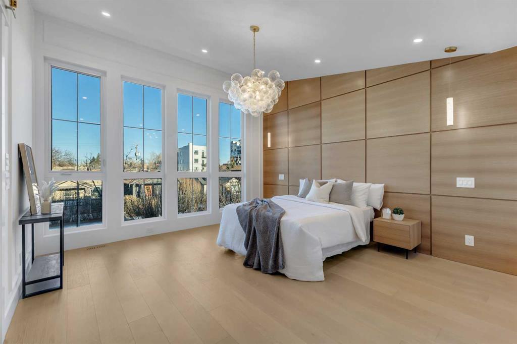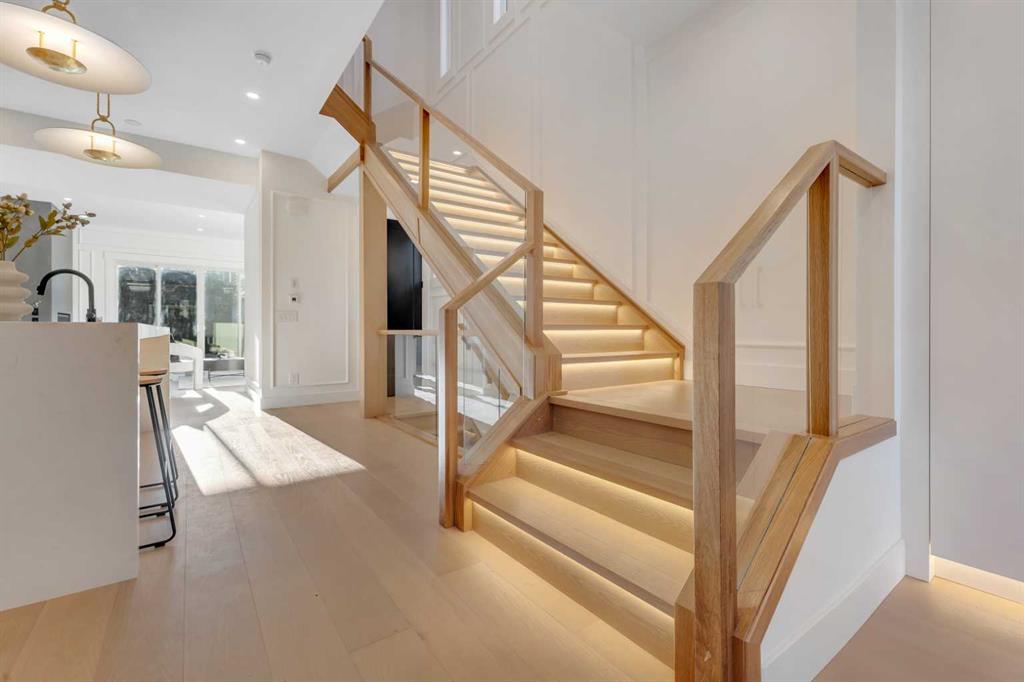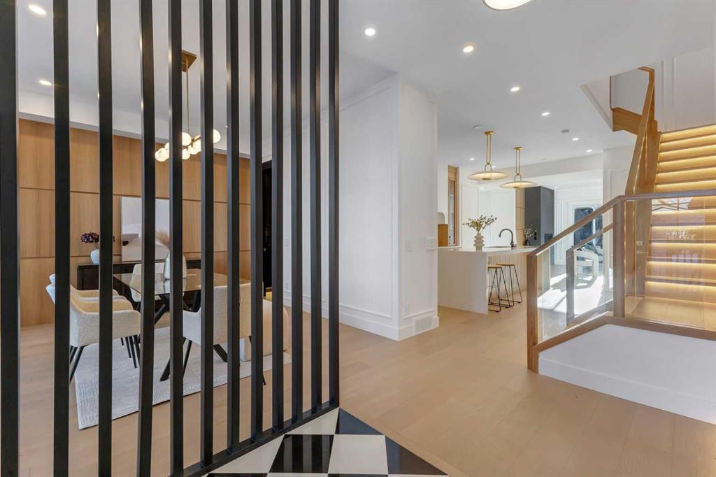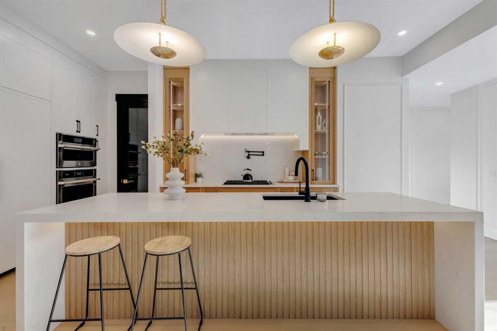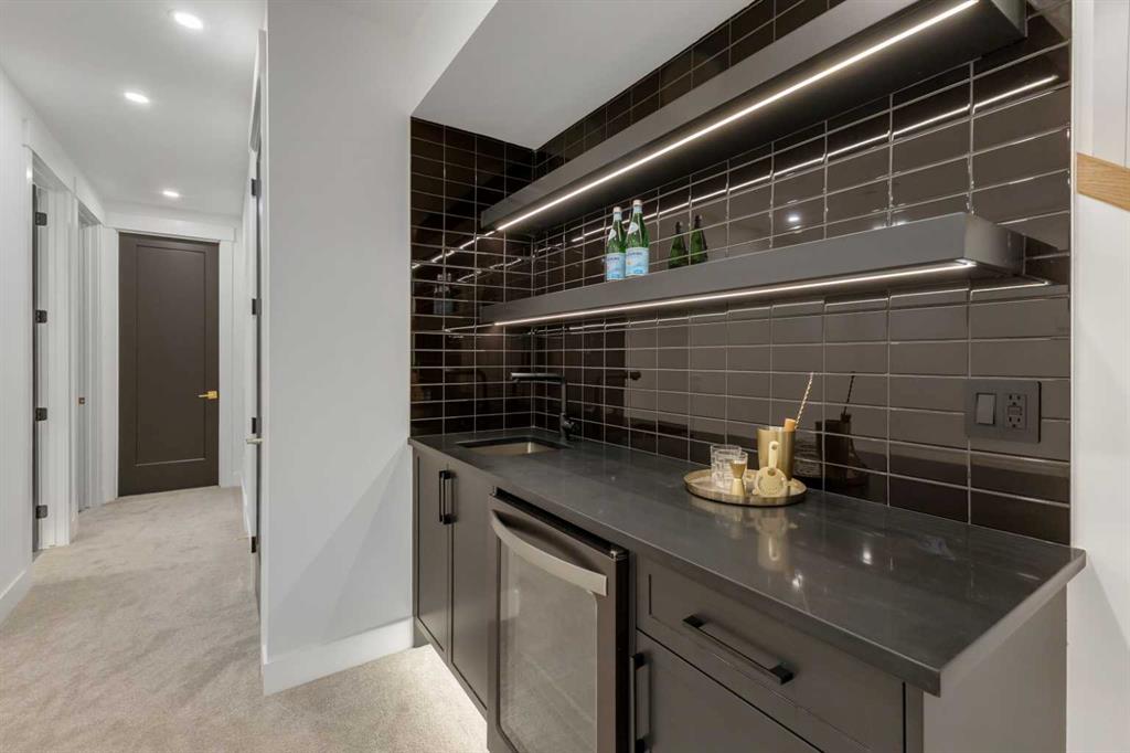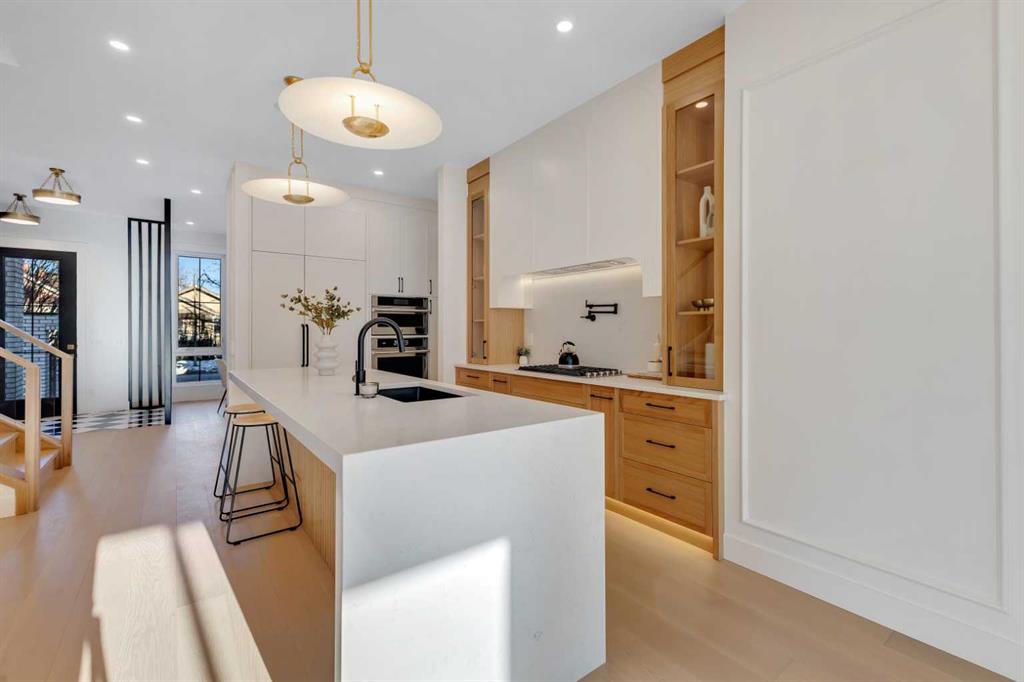 This exceptional detached infill by Moon Homes is set in a quiet pocket of Inglewood and offers a refined blend of architectural presence, thoughtful layout, and elevated living. Designed with intention throughout, the home delivers a strong sense of craftsmanship while remaining highly functional for everyday life. The main floor opens to a welcoming front entry finished with custom millwork and built in storage that provides subtle separation while maintaining an open flow. A dedicated front dining area is framed by oversized windows overlooking the tree lined street, creating a bright and inviting space for hosting and daily use. Carefully selected materials and cohesive detailing throughout the main level give the home a polished and timeless feel. At the centre of the home, the kitchen is both striking and highly functional. Quartz countertops, custom oak and white cabinetry, matte black fixtures, an arched hood fan, and a full JennAir appliance package including a gas range anchor the space. A pot filler and extensive storage support everyday cooking, while the hidden prep kitchen adds a second sink, additional cabinetry, and open shelving, allowing the main kitchen to remain clean and composed. The living room is warm and elevated, centered around a gas fireplace with a tiled surround and floating oak media feature. Large sliding doors open to the backyard, bringing in natural light and reinforcing seamless indoor outdoor living. At the rear of the home, a spacious mudroom with built in cabinetry continues the thoughtful storage theme, while a well finished powder room completes the main level. Upstairs, the primary suite is a true retreat. Vaulted ceilings create a sense of scale, while a full floor to ceiling oak panel feature wall adds depth, warmth, and architectural impact. The walk in closet is finished with custom built ins topped with quartz surfaces, combining durability with a refined aesthetic. The ensuite is equally impressive, featuring dual sinks, a freestanding soaker tub, and a fully tiled walk in steam shower, creating a calm and spa inspired space. A built in coffee bar with sink, floating shelves, and space for a beverage fridge adds everyday convenience and a boutique hotel feel. Each secondary bedroom is finished with tray ceilings, walk in closets, and private four piece ensuites, offering comfort and privacy for family or guests. An upper floor laundry room is conveniently positioned nearby. The fully developed basement expands the home’s versatility with a large recreation room featuring a custom wet bar, a fourth bedroom, full bathroom, quiet home office, dedicated gym space, and a temperature controlled wine room with custom shelving. This level is designed to accommodate entertaining, work, and relaxation with ease. Located just steps from Inglewood’s 9th Avenue, the home offers walkable access to cafés, restaurants, shops, river pathways, parks, and schools, all while remaining minutes from downtown.