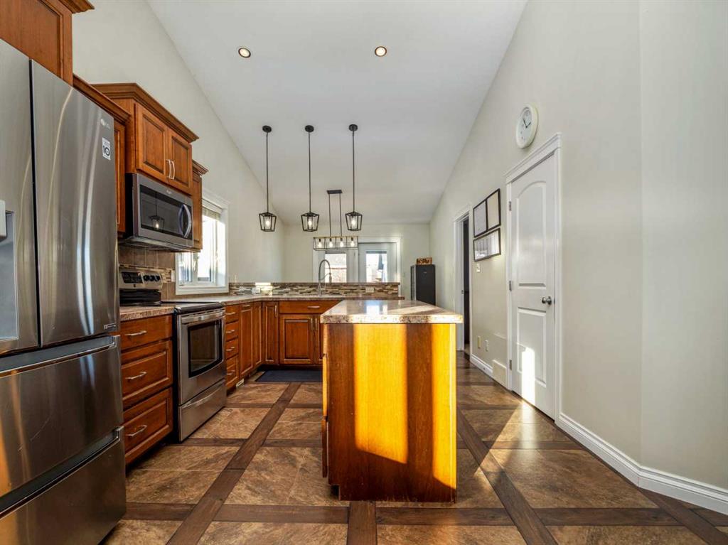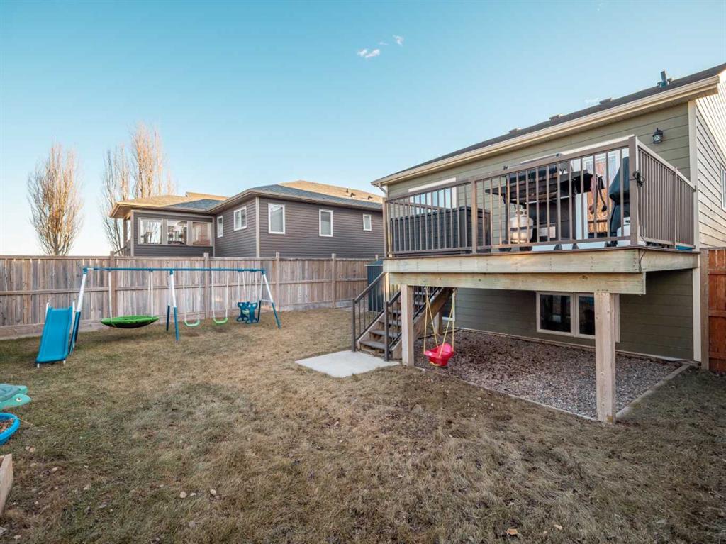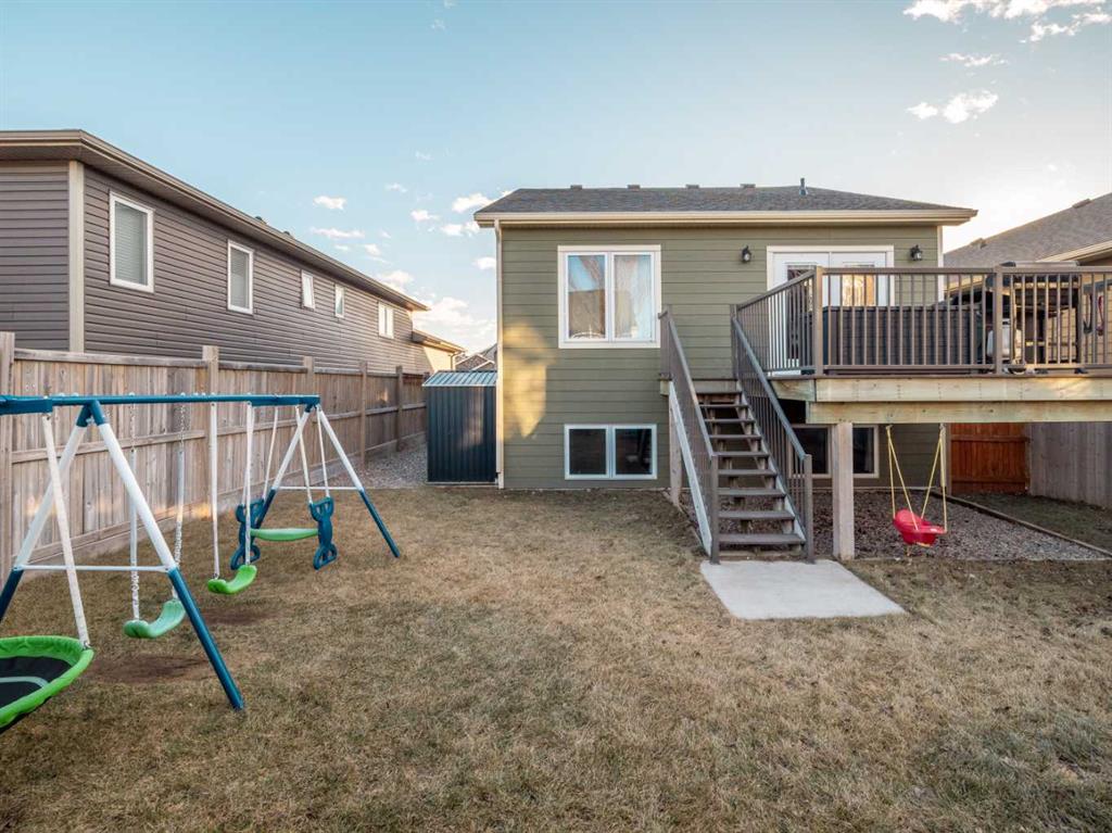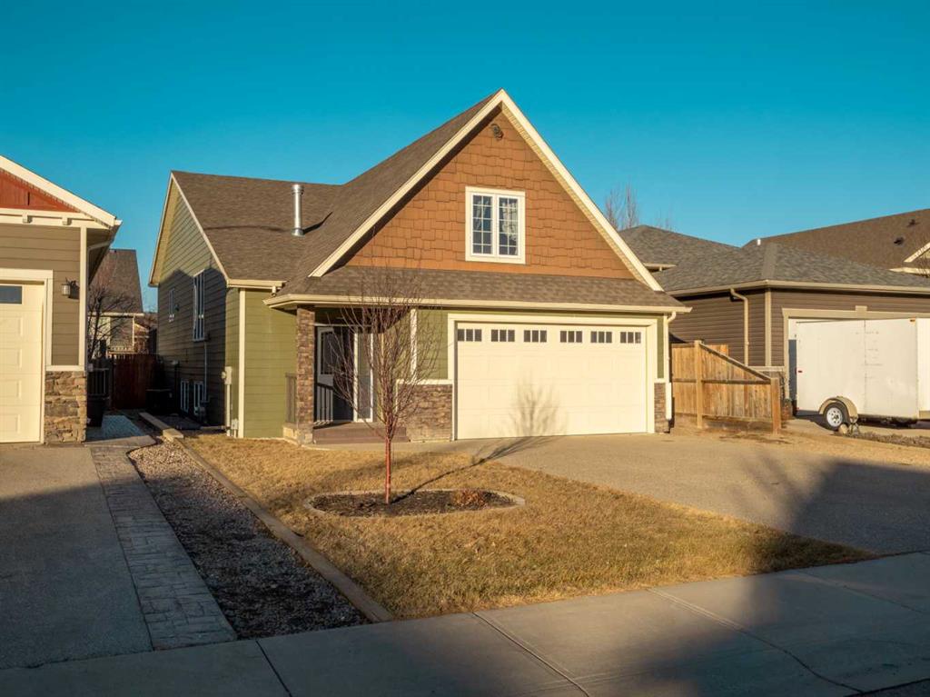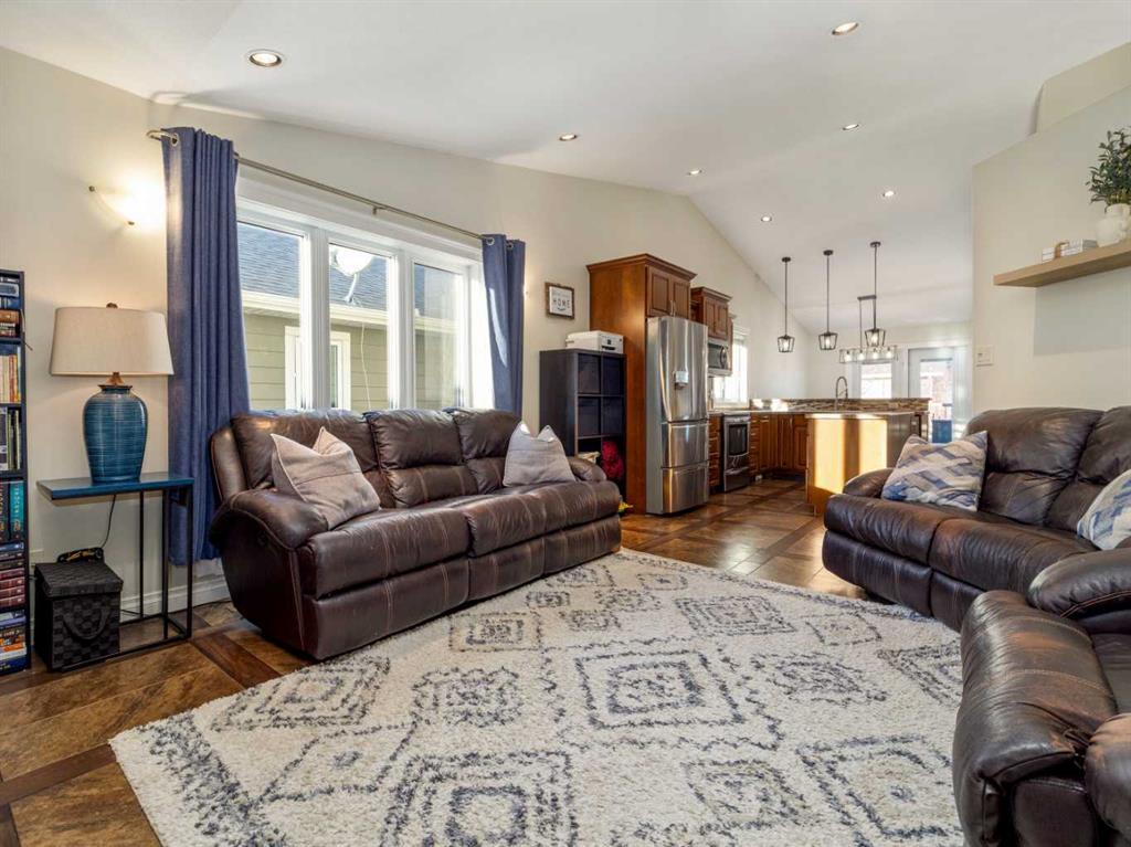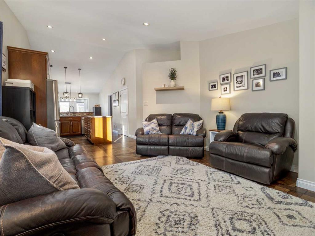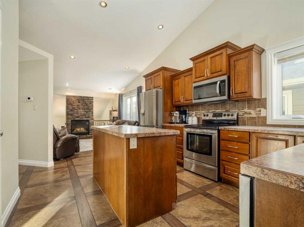 Fantastic modified bi-level family home in Nobleford with 4 bedrooms, 3 bathrooms, and 3 big living areas!...Welcoming entry open to above! Main floor has vaulted ceilings. Living room has gas fireplace with beautiful stone surround. Kitchen features stainless steel appliances, kitchen island, pantry, and raised breakfast bar in dining area. Dining room features garden doors to composite deck out back. Main floor also has 2 bedrooms including primary with 3 piece ensuite featuring a walk-in shower. There is also another full 4 piece bathroom on this level with tub/shower combo. Upper level houses a large bonus room that is perfect for a toy room, office, gym, or sitting room. Basement is fully developed with large family room(a portion of which is currently being used as a hair salon), 2 more bedrooms, another bathroom with stand-up shower, and furnace room with laundry. Yard is fenced and landscaped and even has a play set! Double HEATED attached garage for your vehicles! Current owners mention they have painted in 2024, bought a new microwave and dishwasher in 2024, a new washer in 2025, and the roof shingles are only 3 years old! They love the park, playground, spray park, skate park, ice rink, curling rink that Nobleford has to offer! There is even a chinese restaurant and a pizza place! If you enjoy small town living with some of the lowest property taxes in the province, this home just might be for you!