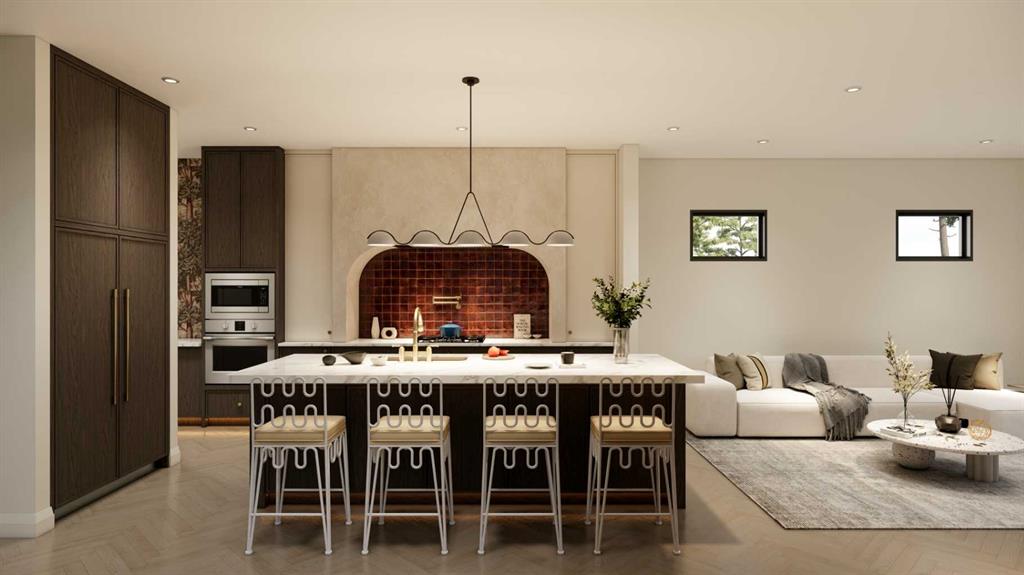 An artisanal masterpiece awaits, steps to Confederation Park, where every detail has been meticulously curated by a builder renowned for impeccable taste. Approaching the home, a large covered front patio welcomes you, setting the tone for a residence that is truly a cut above. Inside, the open~concept main floor is designed for both grand entertaining and everyday living. The front formal dining area features an adjacent wine display and a hidden butler’s pantry, both encased in elegant white oak feature walls, while a tucked away hidden home office seamlessly blends sophistication with functionality. The expansive kitchen with panel ready JennAir appliances blends effortlessly into the living room at the back. Anchored by a striking stone cast gas fireplace hearth and complemented by a discreet powder room and spacious mudroom, this main floor leaves nothing to be desired. Ascending to the upper floor, the master suite impresses with an 18~foot vaulted ceiling and 12~foot double sided stone gas fireplace, offset by a freestanding tub. The ensuite exudes a moody, indulgent vibe with accent lighting, a large steam shower with body jets, and a raindrop shower head. The walk~in closet is the size of a secondary bedroom, filled with natural light from a skylight, lit accent cabinetry and a glass countertop valet stand. Two additional bedrooms, each with tray ceilings, starlights, and backlit crown moulding, also feature their own walk~in closets and ensuites. With a conveniently located (and magazine worthy) laundry room completing this space. The lower level continues the theme of refined living, offering a large living area with projector and screen, a wet bar with island, and an additional versatile home office space with glass wall detailing. A private large fourth bedroom for a family member or guests, includes a massive walk~in closet ideal for additional home storage. Even the mechanical room is a statement piece, finished with diamond checker plate walls and epoxy floors. Throughout the home, thoughtful features abound. The oversized garage is also heated and fully finished with epoxy flooring, and the upper bathrooms are connected to an instant hot water system, All closets are finished in a thermally fused laminate material, complemented again by fully installed air conditioning system, and speaker system throughout. This is a home that marries unparalleled craftsmanship, intelligent design, and luxurious finishes at every turn. From the moment you arrive to the final detail in the basement, this home is a true reflection of bespoke elegance. Est completion May 2026.