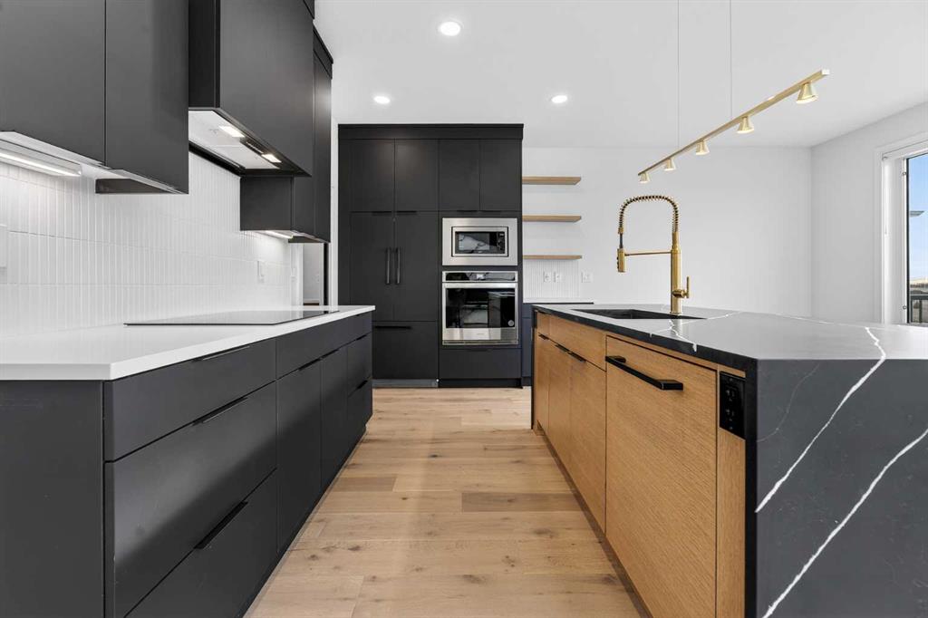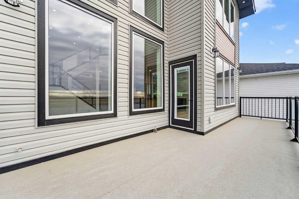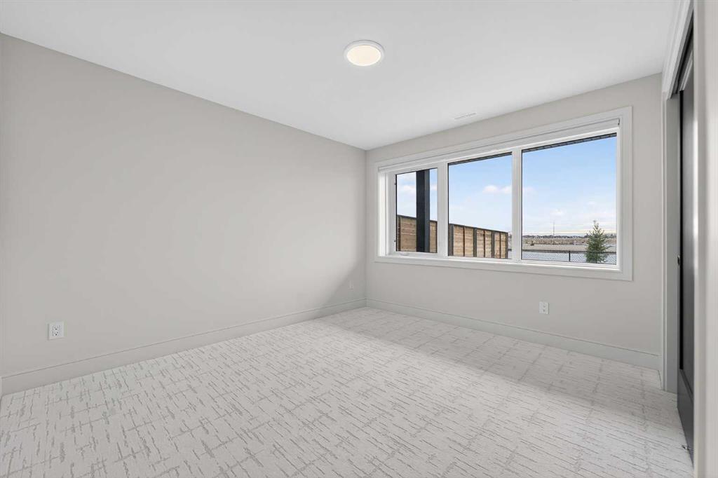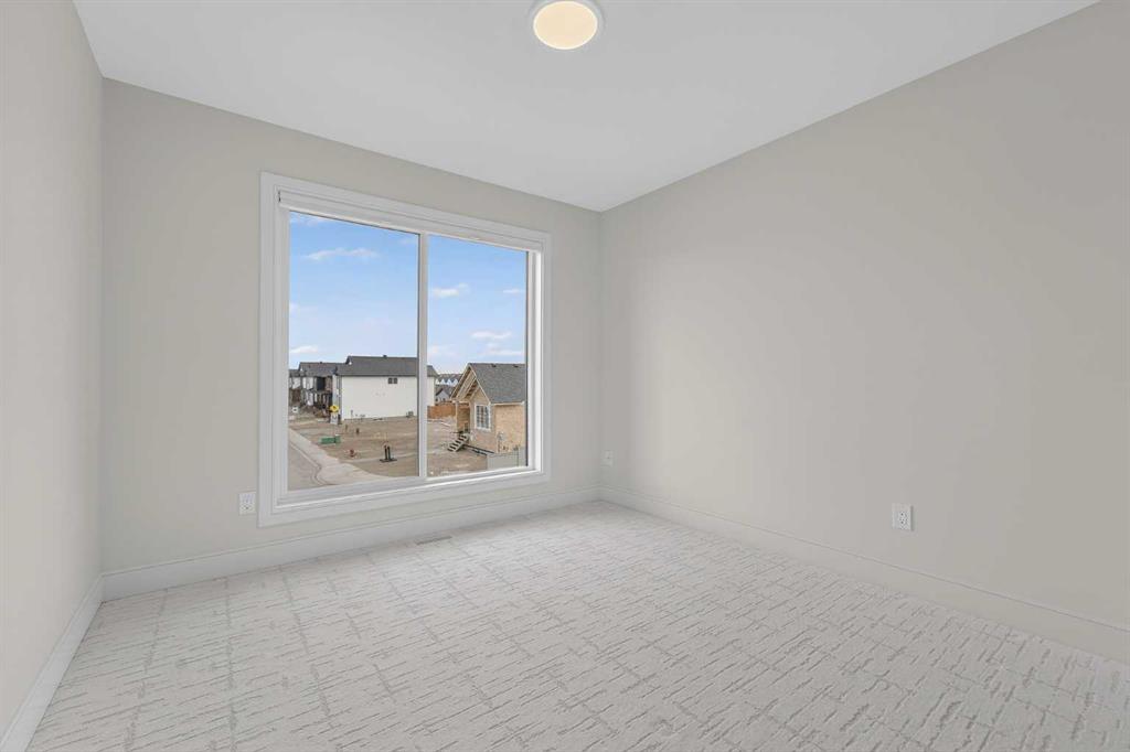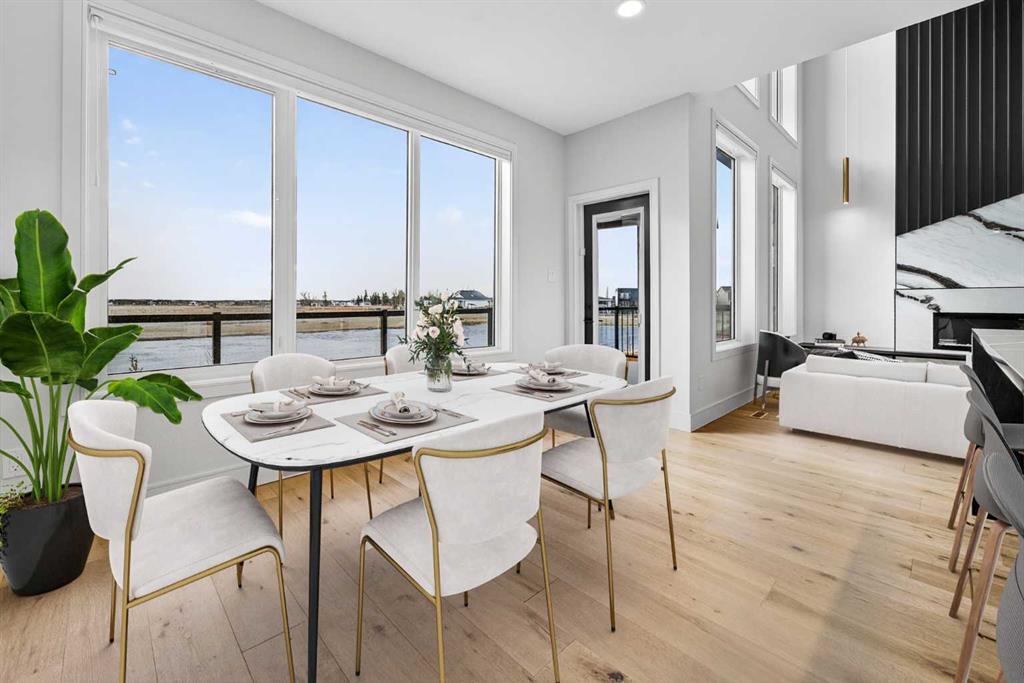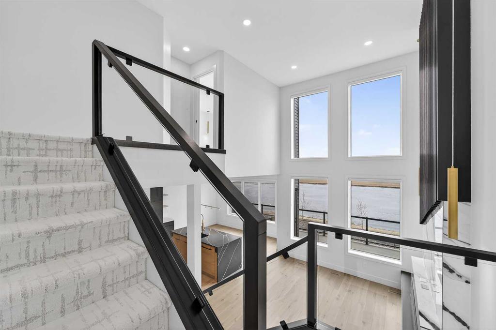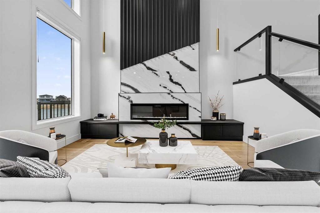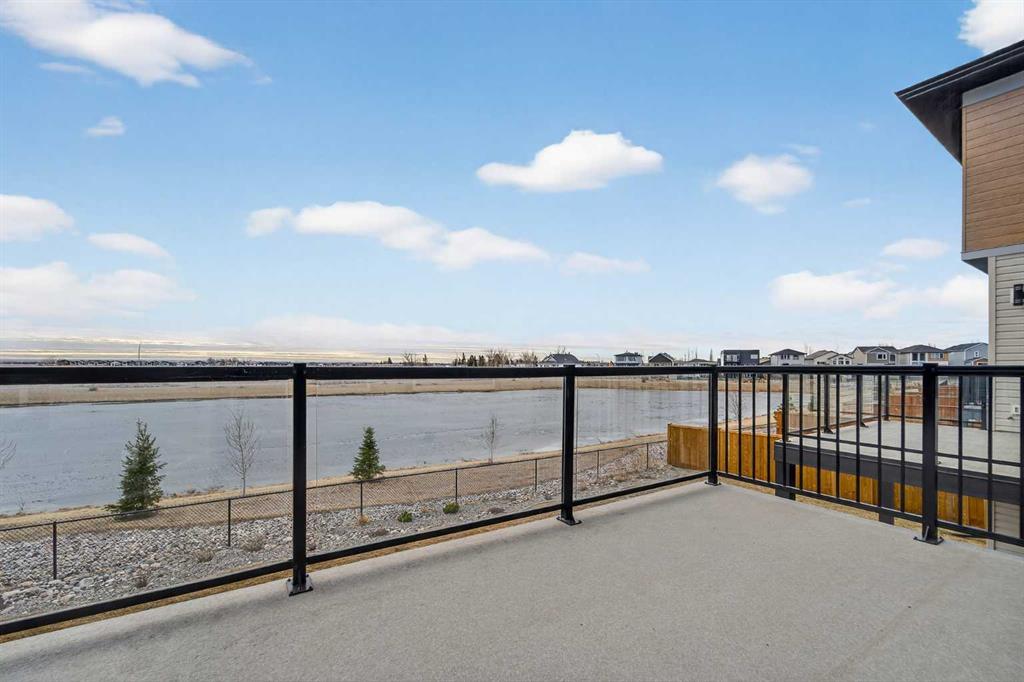 This brand new Stranville Living Master Builder showhome showcases the highly sought-after Perth 2 floor plan and is perfectly positioned in Southbrook with tranquil pond views and quick access to some of Lethbridge’s best amenities. Fully developed with a walkout basement, this home was designed to impress from the moment you step inside, blending bold architectural choices with everyday functionality in a way only a true showhome can. The main floor is anchored by a stunning open-to-above living room, where oversized windows frame the pond behind the home and flood the space with natural light. The fireplace is a true design feature here, set against dramatic vertical detailing and sleek modern finishes that instantly draw your eye upward and emphasize the home’s scale. The kitchen is equally striking, featuring a waterfall matte black island that grounds the space, paired with contrasting cabinetry, statement lighting, and a butler’s pantry complete with a gas range—ideal for both entertaining and keeping the main kitchen pristine. Step out back onto the full-length deck and enjoy uninterrupted pond views, making this space as functional as it is scenic. Upstairs, the second level offers three spacious bedrooms and a large bonus room that works perfectly as a family lounge, media space, or kids’ retreat. The primary bedroom is a standout, with expansive pond views that feel calm and private, and an ensuite that rivals a luxury hotel. Here you’ll find a floating vanity with undermount lighting, a skylight that fills the room with natural light, a standalone soaker tub, and a beautifully finished curbless shower. The walk-in closet is thoughtfully designed to connect directly through to the main floor laundry room, adding a level of convenience that’s both smart and intentional. The fully developed walkout basement continues the home’s versatility, offering two additional bedrooms, a four-piece bathroom, and direct access to the backyard and pond beyond. Whether you’re looking for space for family, guests, or simply want a home that showcases premium design from top to bottom, this Southbrook showhome delivers on every level with views, layout, and finishes that truly set it apart.