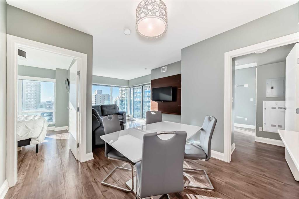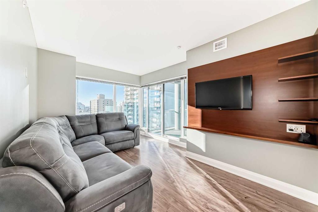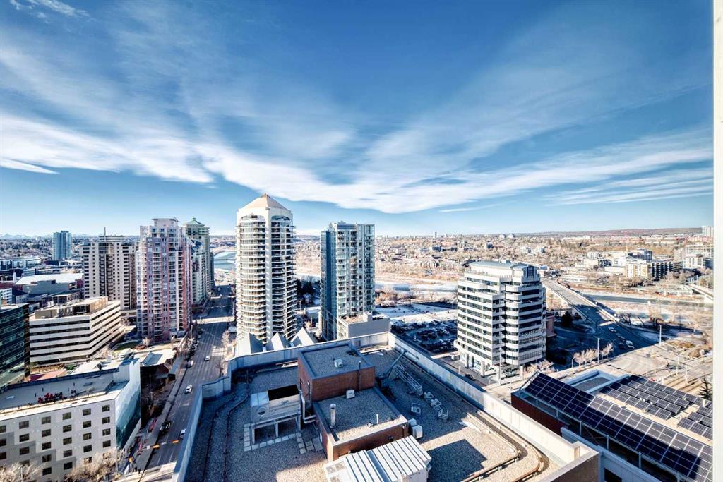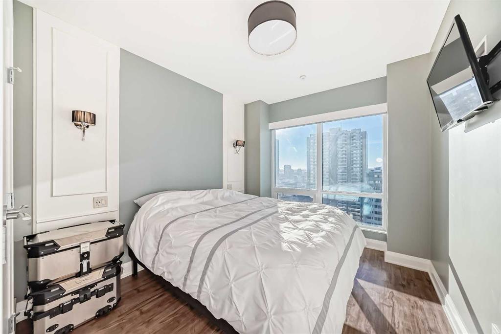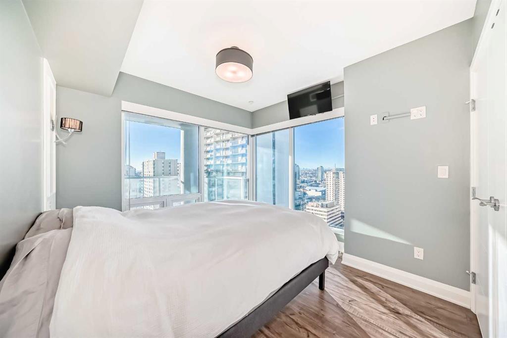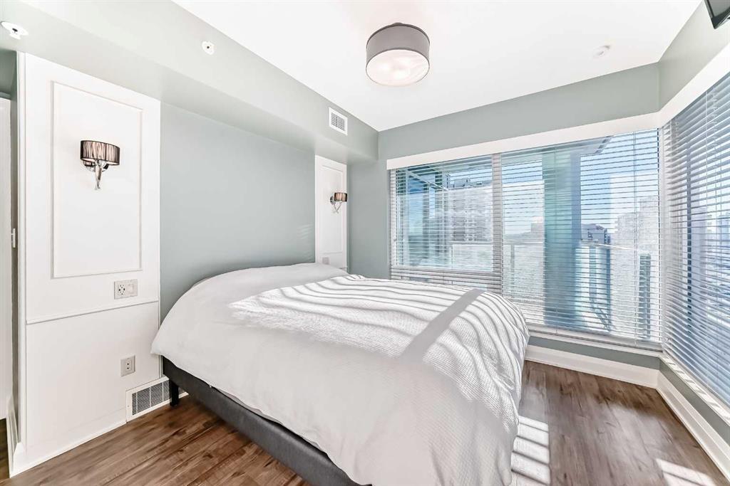 Experience the pinnacle of downtown luxury in this 2 bedroom, 2 bathroom, titled parking, SW-facing corner unit at VOGUE. Sold fully furnished and turnkey, this "Orion" floorplan is situated on one of the exclusive "Bedouin Suites" floors, featuring elite upgrades not found in the rest of the building. Floor-to-ceiling windows frame breathtaking mountain and river views, flooding the space with natural light. The interior boasts premium walnut built-ins, custom bedroom paneling, and a chef-inspired kitchen with an upgraded central island and quartz finishes. Both bedrooms act as private retreats, flanking the living area for maximum privacy. Perfect for investors, professionals and empty nesters. Beyond the unit, enjoy executive amenities including a 36th-floor Sky Gym and 24/7 concierge. Prime West End location steps to the river pathway, C-Train, downtown, and trendy Kensington. Condo fees are $610.35/month, including all utilities except electricity.