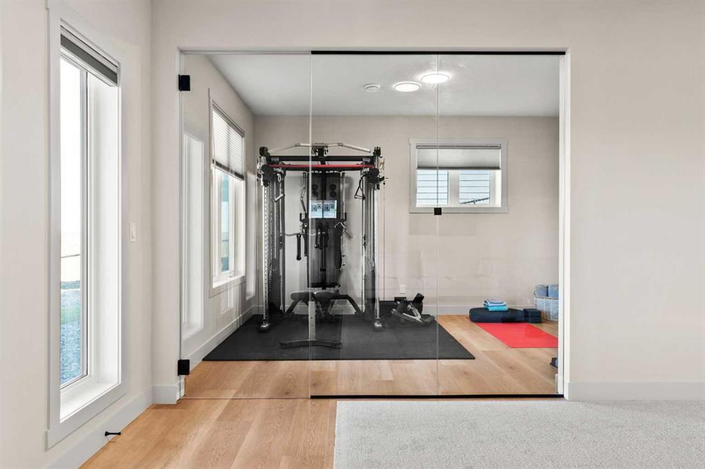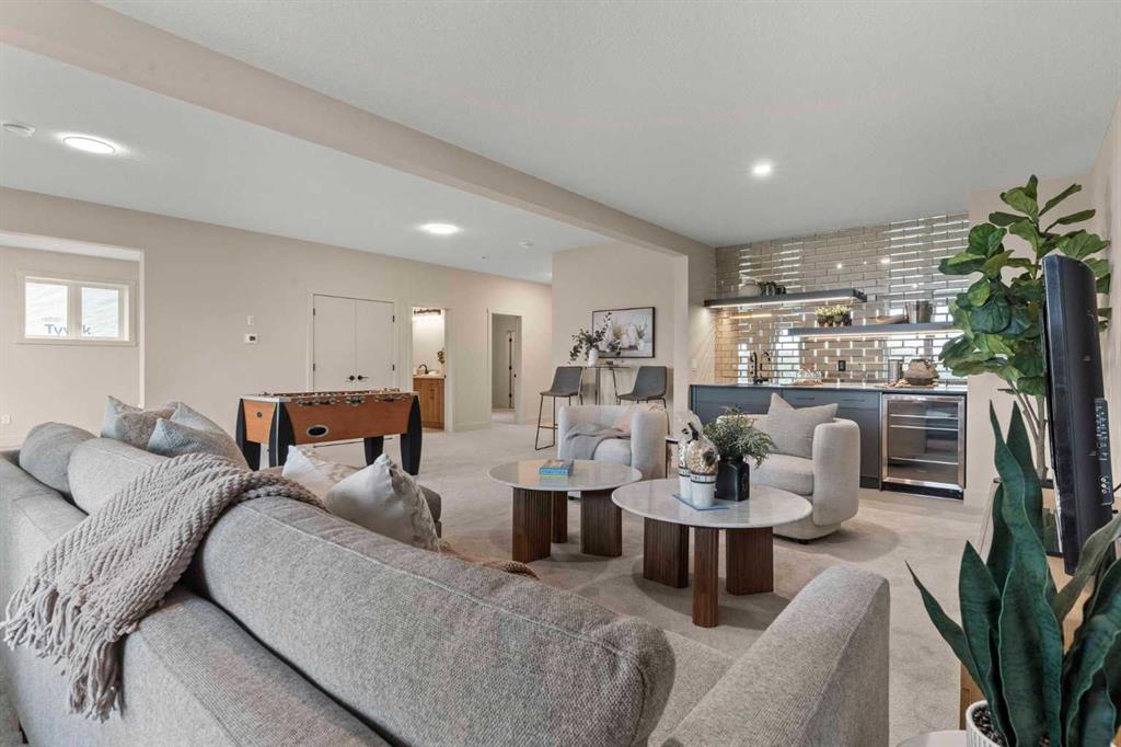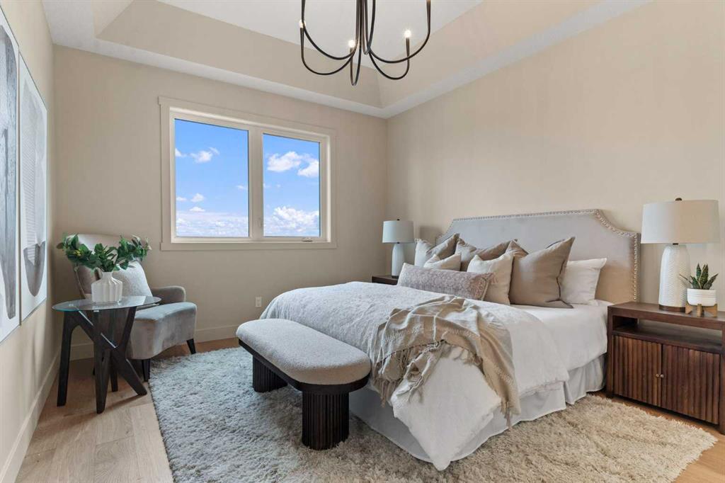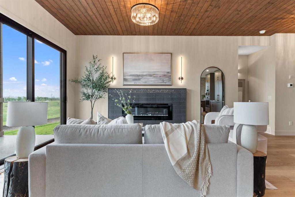 Welcome to the ultimate forever home—a brand-new luxury estate offering nearly 4,000 sq. ft. of thoughtfully designed living space, backed by New Home Warranty and available Spring 2026. Built by local builder, Iron Lake Homes, this residence is designed to age in place without compromise, blending timeless architecture with premium materials. The main level is anchored by rich hardwood and a stunning great room featuring a Canadian wood ceiling detail. The executive kitchen combines beauty and function with upgraded panel-ready appliances, dual wall ovens with microwave, gas cooktop, custom hood fan, and a built-in espresso machine, all seamlessly integrated into elevated millwork. The adjacent dining area is ideal for entertaining, complete with custom built-ins, bar fridge inset into an arched detail with glass backsplash that frames breathtaking views. Step outside to the covered deck with gas BBQ hookup—perfect for hosting or quiet evenings enjoying the scenery. The main-floor primary suite is a true retreat, featuring a spa-inspired ensuite with Heated herringbone brick floors, a curbless shower for two, and a freestanding soaking tub—designed for comfort, accessibility, and timeless luxury. Upstairs offers two spacious bedrooms, a bonus room, and a beautifully finished bathroom with Heated tile floors and dual vanity. The walkout basement expands the living space with an additional large bedroom, full bathroom, expansive recreation area, and a dedicated wellness zone with sauna and gym, plus direct outdoor access. Situated on an exclusive estate cul-de-sac at the highest elevation in Okotoks, this home captures sweeping views of the Sheep River Valley, town, and Rocky Mountains. Black farmhouse windows flood the interior with natural light, while the oversized pie-shaped lot offers rare flexibility, potentially allowing room for a detached shop, pool, or sport court—true acreage-style living within town limits. Finished with James Hardie Midnight Black siding, brick accents, and an oversized Heated three-bay garage, this is a rare opportunity to own a meticulously crafted luxury estate—designed not just for today, but as the ultimate forever home. Photos are representational of specifications only, please come view to see the colors and selections for this one of a kind home. Price includes GST.