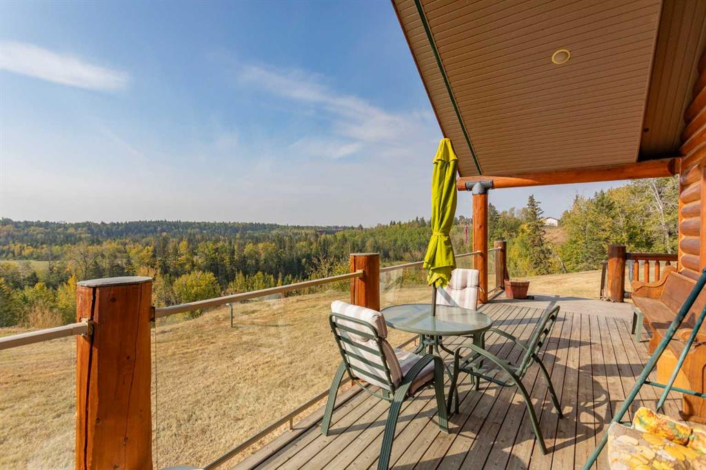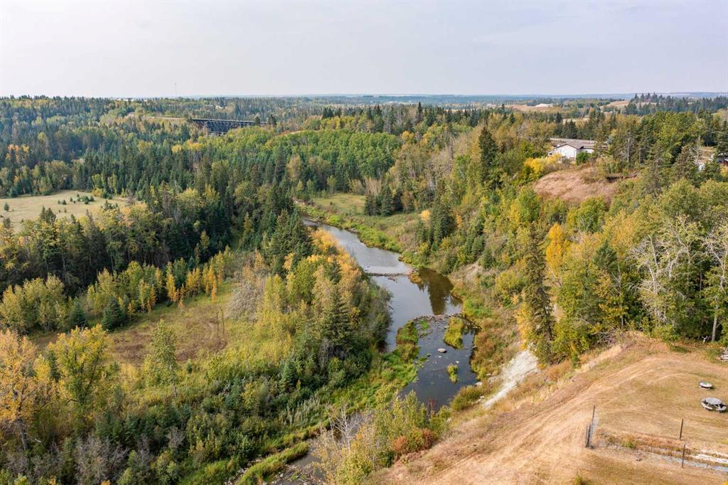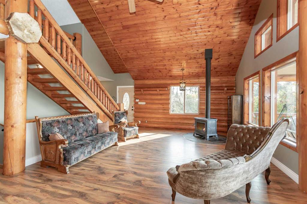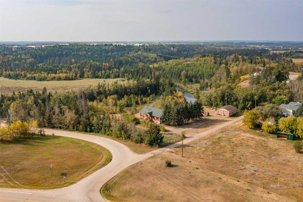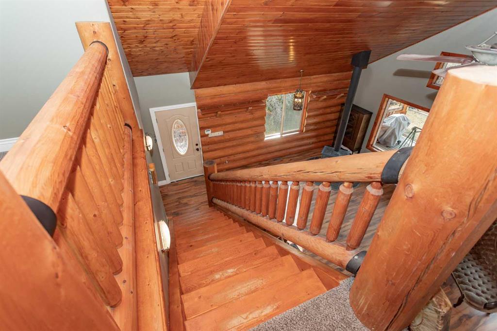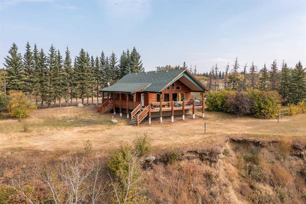 Set on 5.54 acres above the Blindman River, this log-style 1.5 storey home offers a peaceful setting with wide-open valley views and plenty of space to enjoy country living. The main floor is bright and welcoming, featuring a spacious living room with a wood stove, large south-facing windows, and direct access to the full wrap-around deck. The kitchen is practical and inviting with oak cabinetry, laminate countertops, a walk-in pantry, and a comfortable dining area. Two well-sized bedrooms, a 3-piece bathroom with a full tub, and a dedicated main floor laundry room complete this level. Upstairs, the loft-style bedroom provides a private retreat with brand new carpet, dual closets, a 3-piece ensuite, and impressive views through the oversized windows. The basement is partially developed with framing in place and building materials included, offering a head start for future development. The home is built on an ICF foundation and is equipped with underfloor heat, a high-efficiency furnace, and a high-efficiency hot water tank. The land itself is flat and usable, with a mix of open space and treed areas that attract wildlife. A pathway leads to a separate flat section of the property, ideal for a firepit area, camping spot, or future shop. The existing shop features high ceilings, a mezzanine, and radiant heat, and offers great potential for those looking for workspace or storage. Recent improvements include a new septic field and a newer pressure tank. Located in the Burbank community of Lacombe County, this property is just minutes from Blackfalds and approximately 10 minutes to Red Deer, offering the balance of quiet acreage living with convenient access to town amenities.
