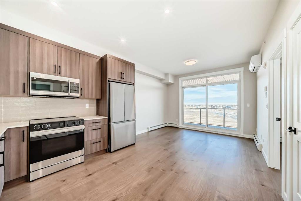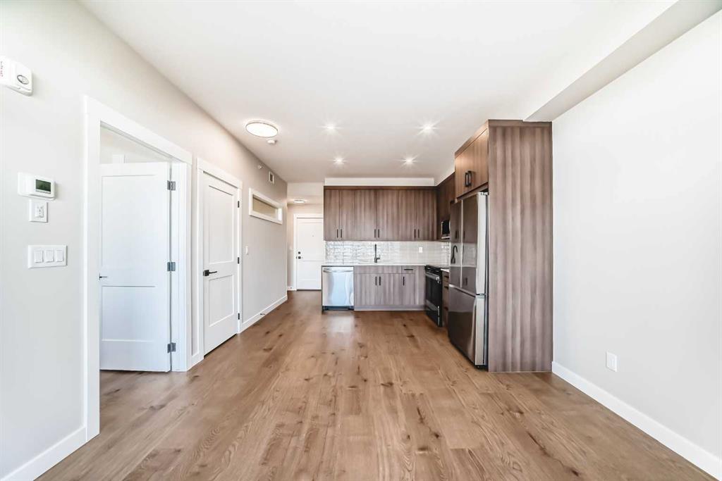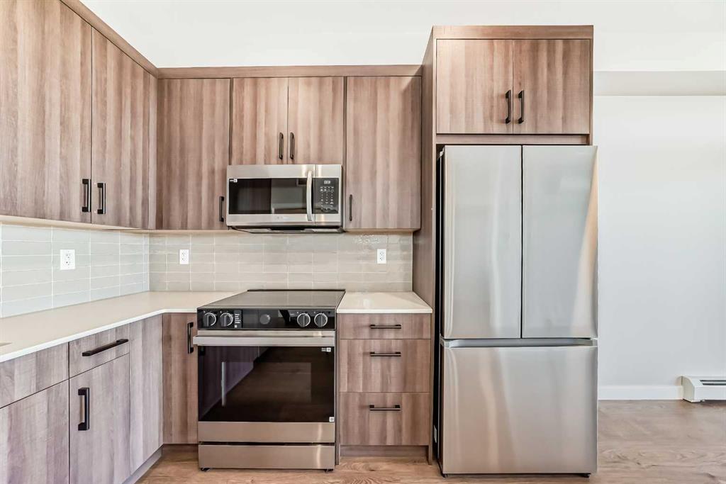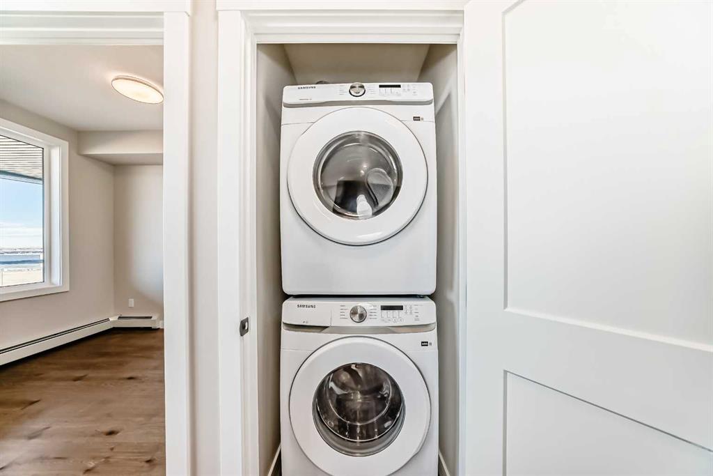 Welcome to the Curnoe 2 by Logel Homes—a well-designed unit featuring cabinets with full-height fronts, quartz countertops, and luxury vinyl plank flooring throughout, with tile in the bathroom. The upgraded kitchen includes a modern backsplash, premium sink and faucet, and comes with stainless steel appliances. Enjoy year-round comfort with air conditioning, plus the convenience of an in-suite washer and dryer. Nine-foot ceilings and large windows provide plenty of natural light. This home includes a titled parking stall and is backed by the Alberta New Home Warranty. Located close to shopping, public transit, and major routes like Deerfoot and Stoney Trail, it offers easy access across the city. With affordable condominium fees, this is a great opportunity to own a well-appointed home in a convenient location.