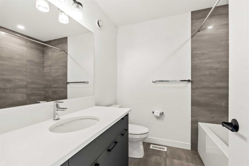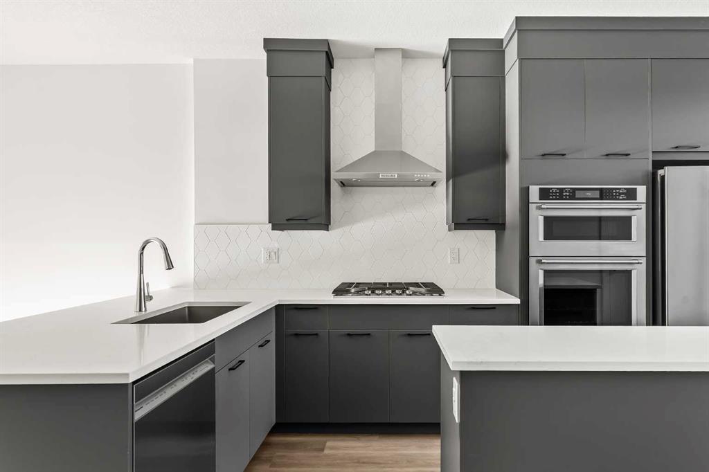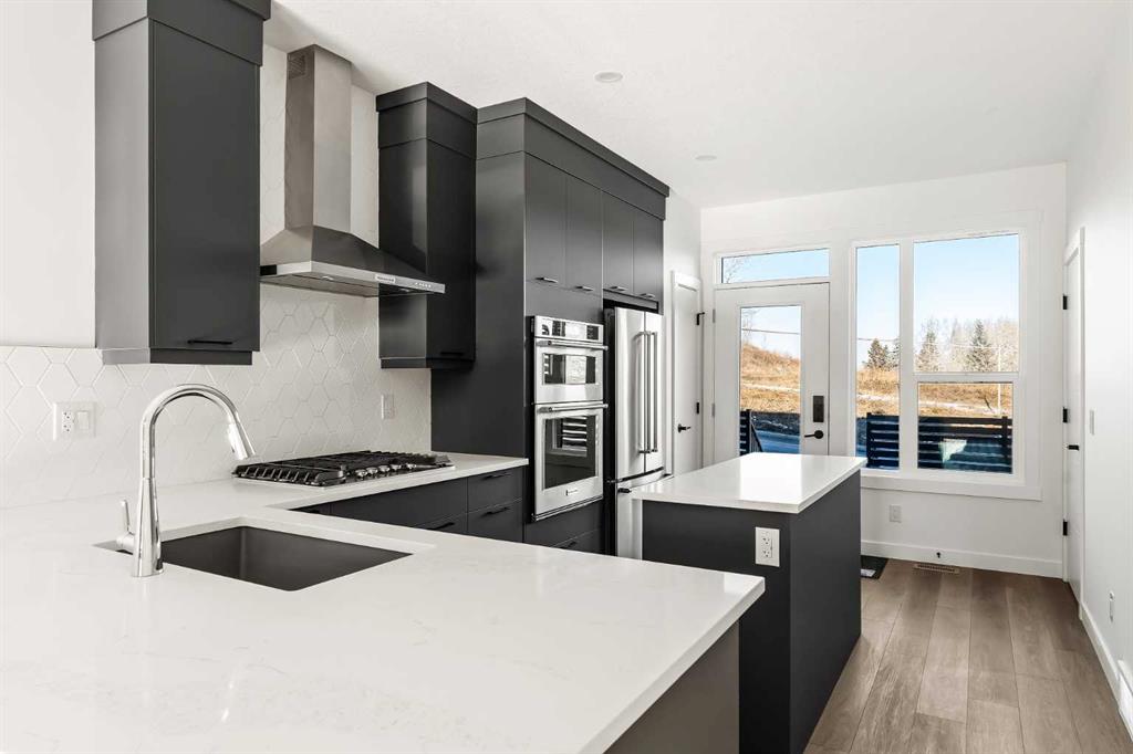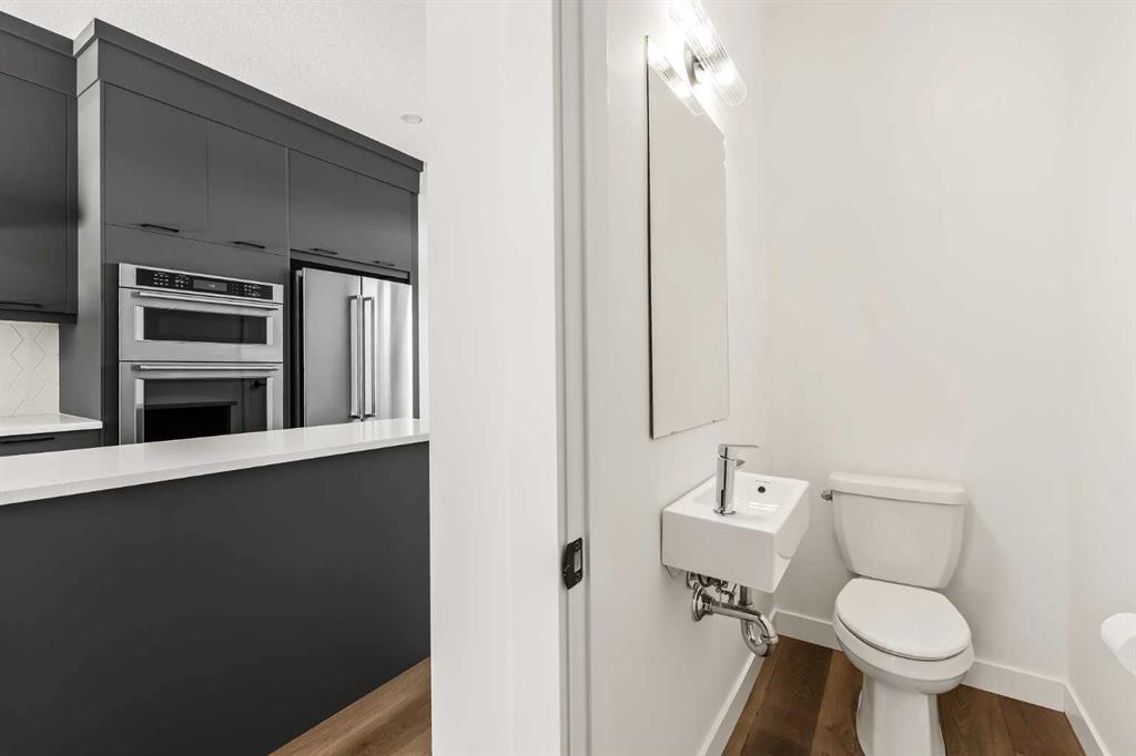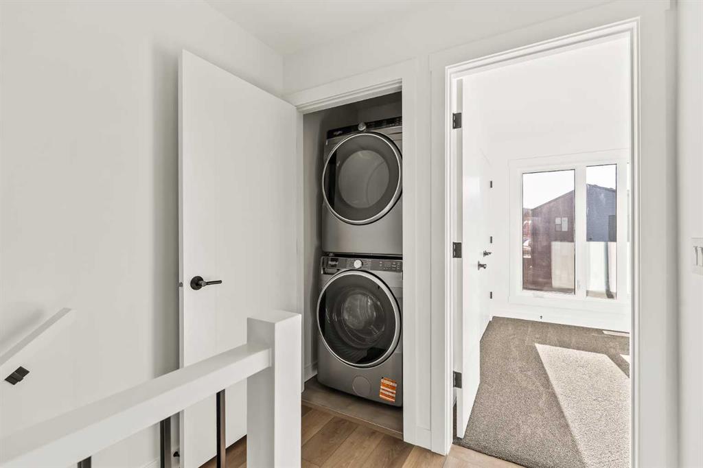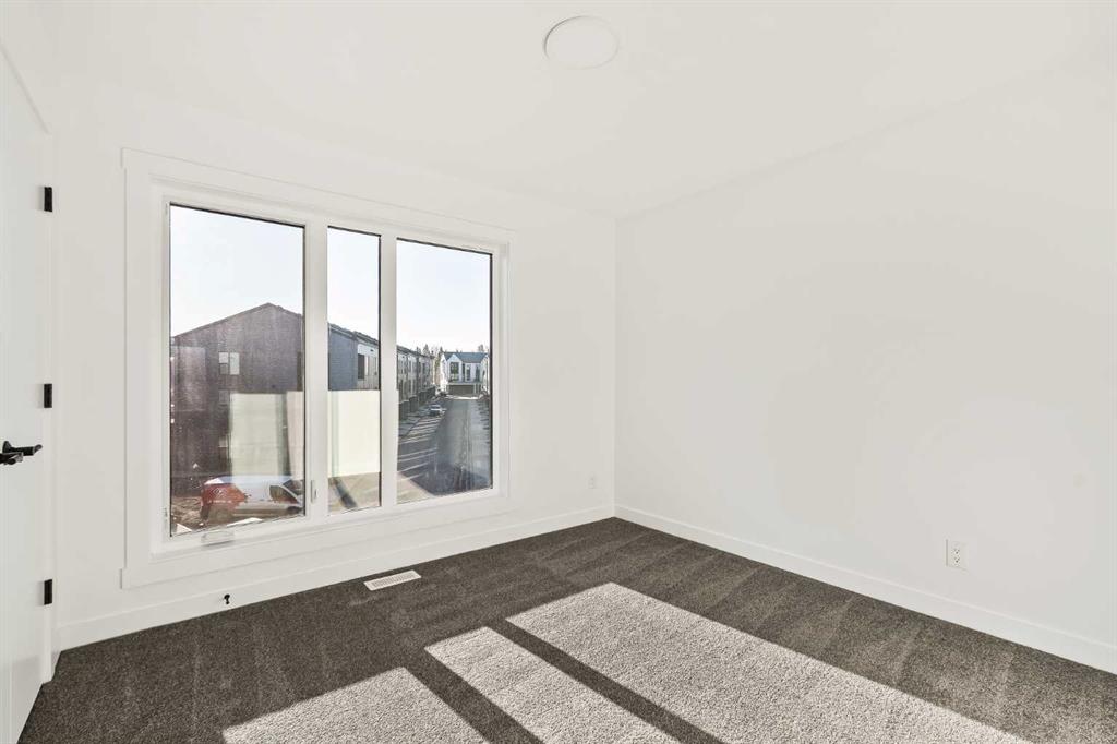 Welcome to the Alameda urban townhome at Crown Park, by Brookfield Residential. Thoughtfully designed, this brand-new residence offers over 1,300 sq. ft. of above-grade living space, plus a versatile lower-level flex room conveniently located off the attached garage. Featuring 2 bedrooms, 2.5 bathrooms, two distinct living areas, and two outdoor living spaces - including an impressive ~200 sq. ft. rooftop patio - this home is ideal for young professionals, downsizers seeking a low-maintenance lifestyle, or investors looking for a premium inner-city opportunity. The welcoming front entrance showcases a spacious patio overlooking green space, complemented by a wall of windows that allow you to enjoy the views both inside and out. The main level boasts a bright, open-concept layout designed with entertaining in mind. The gourmet kitchen is equipped with a gas cooktop, built-in appliances, chimney-style hood fan, and a central island as well as an eating bar that flows seamlessly into the dining and living areas. The central dining space overlooks the living room, while south-facing windows flood the main level with natural light throughout the day. A convenient 2-piece powder room completes this floor. The upper level is intelligently designed for privacy, with bathrooms centrally located and two generously sized bedrooms positioned at opposite ends of the home. The primary suite features double-door entry to a walk-in closet and a luxurious 4-piece ensuite with dual sinks and a tiled walk-in shower with niche. The second bedroom offers a large closet and is perfectly suited as a guest room or home office, with south-facing windows and a full 4-piece bathroom located just steps away. Upper-level laundry adds everyday convenience. Durable vinyl plank flooring continues through the upper-level hallway and stairwell leading to the rooftop patio - a thoughtful upgrade that enhances year-round access to the outdoor space. Designed for entertaining, the rooftop patio offers ample room for lounge and dining areas, is equipped with a gas line, and enjoys views over green space. Completing the home is the lower-level flex room, ideal for a media room, home gym, or office, located adjacent to the private single attached garage, which also includes a dedicated storage room. Timelessly designed with hosting in mind and ample room to grow, this townhome is located just minutes from downtown Calgary and offers multiple outdoor living areas that make it as functional as it is beautiful. With immediate access to nature trails, golf, and major transit routes, this home delivers a lifestyle that extends well beyond its walls. Backed by full builder warranty and Alberta New Home Warranty, you can purchase with complete peace of mind!