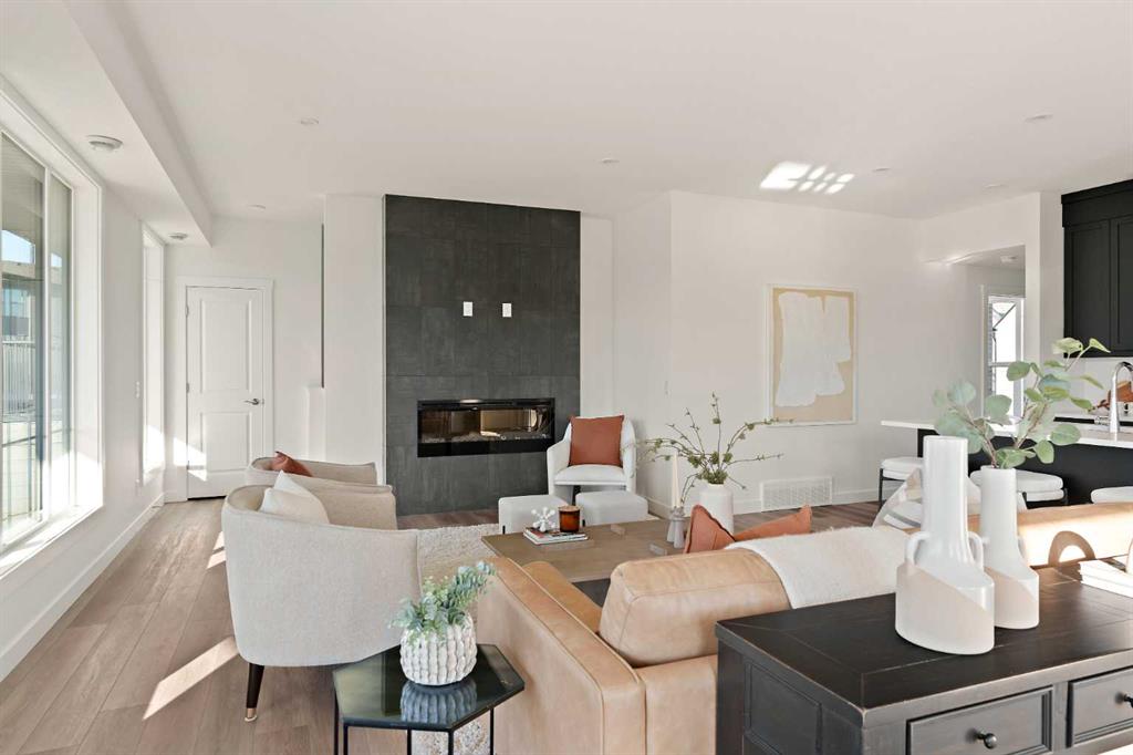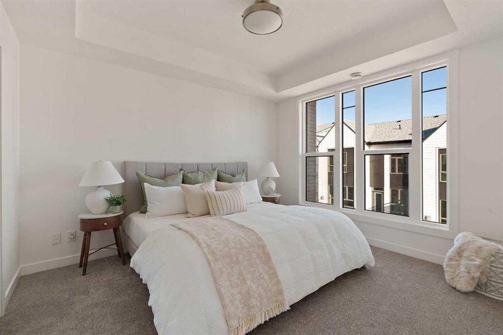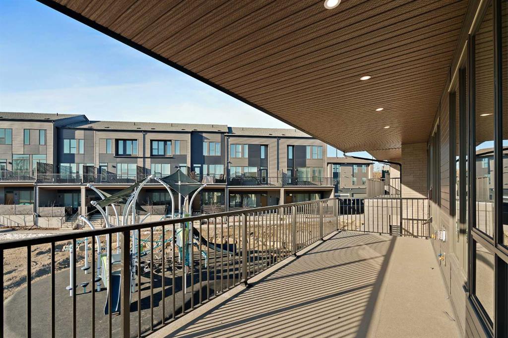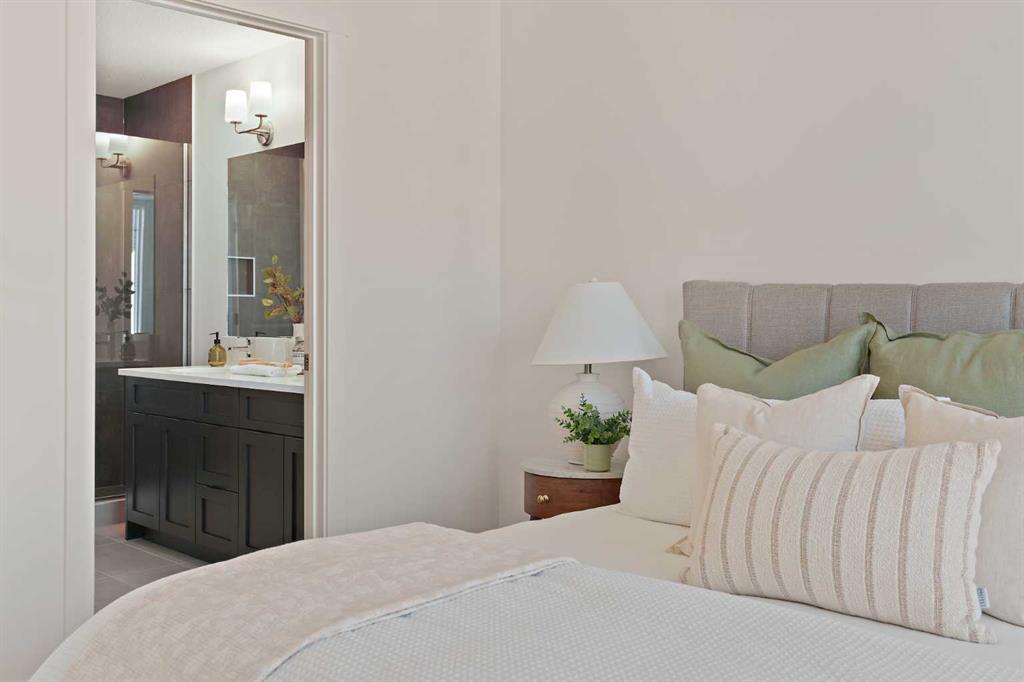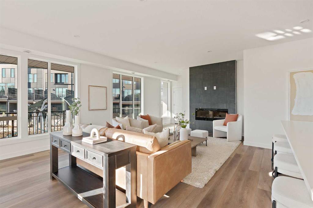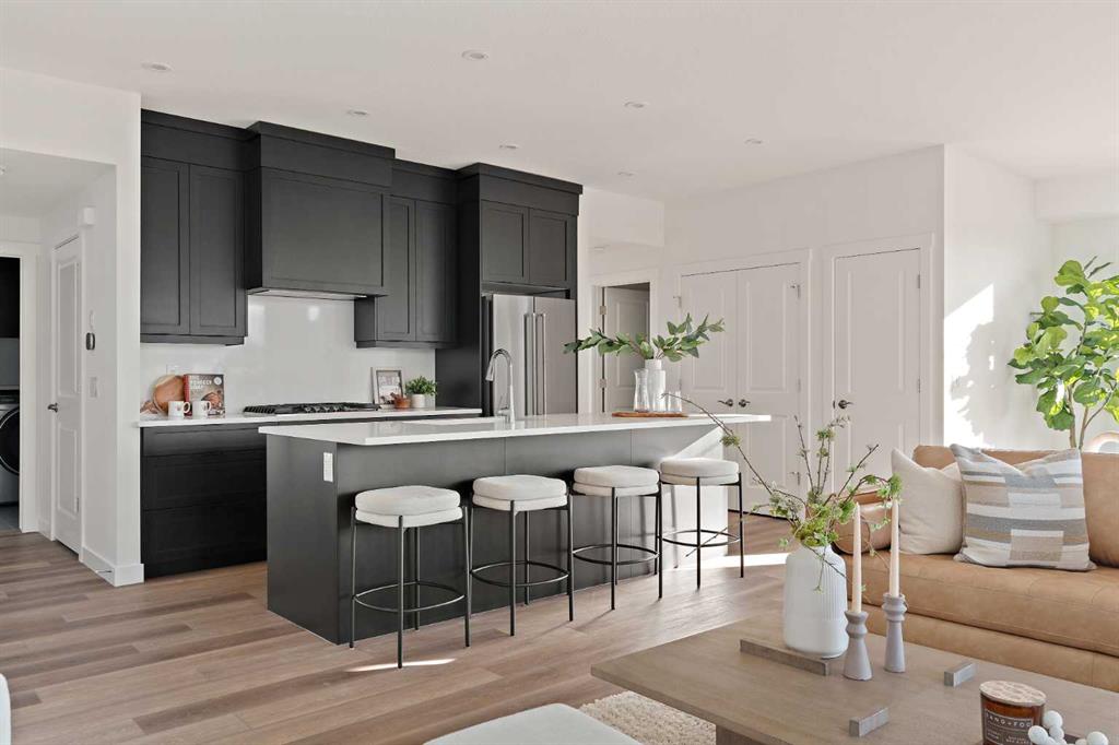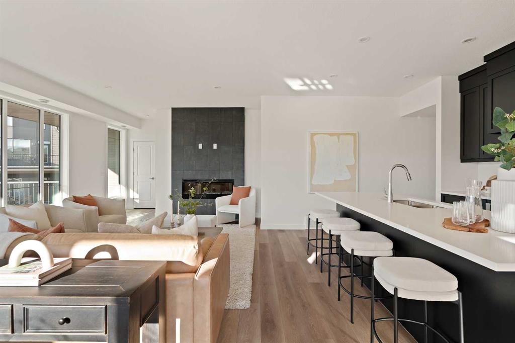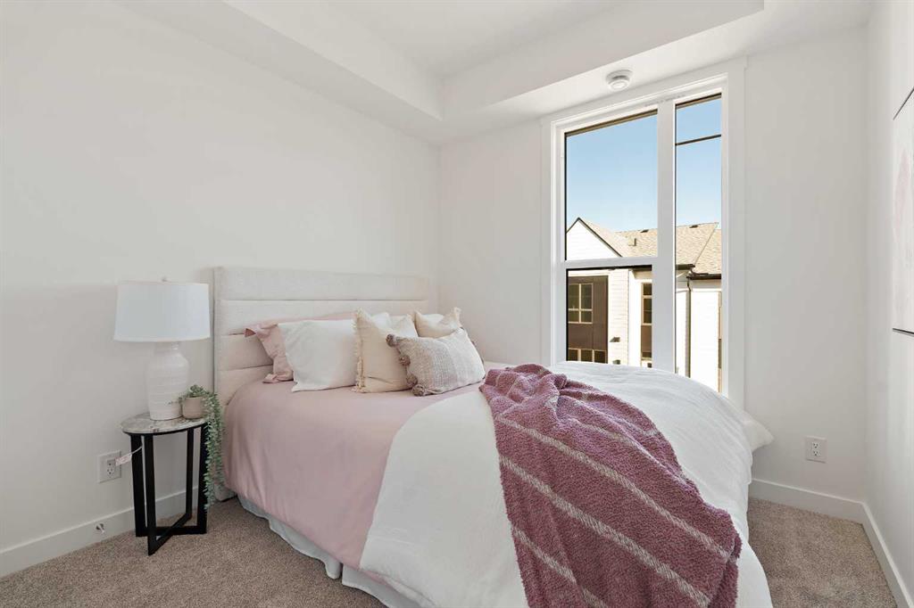 The Hyde at Crown Park is the perfect townhouse for those wanting single-level living without compromise. Featuring 3 bedrooms, 2 bathrooms, and nearly 1,400 ft2 of living space on one level with a private double attached and endless storage space, this home is perfect for those looking to downsize without compromising. Located in the heart of Crown Park overlooking a central park and just minutes from downtown Calgary, this brand new end-unit townhome perfectly combines maintenance-free living within a central urban setting. The beautifully designed main living area has the perfect open-concept design, making it ideal for entertaining and hosting. The kitchen anchors the main living space and opens perfectly to the living and dining areas with a wall of southwest-facing windows flooding the space with natural light. The timeless kitchen is complete with shaker cabinets, quartz countertops, and a suite of built-in appliances including a gas cooktop. The expansive living area has a central fireplace and ample seating space for six+ people, making entertaining a breeze. The large dining area can easily accommodate a table with seating for eight people and includes additional windows for added natural light. The primary suite is located at one end of the property, with laundry providing added privacy between the owner's suite and secondary bedrooms. A luxurious 4 pc ensuite with dual sinks and a walk-in shower as well as a large walk-in closet complete the primary suite. Two additional bedrooms provide added flexibility, with space for a guest bedroom + home office space or media room, and have their own full bathroom. The main living area is complete with a large laundry room with additional cabinets for storage and a countertop for added convenience. A ~26'x8' balcony provides the perfect outdoor living space - complete with a gas line, hose bib, and overlooking the park with optimal southwest exposure ensuring you're maximizing your sun and natural light all year long. The lower level of the property provides access to the oversized private double attached garage and two expansive storage spaces provide the space you've been looking for! Located at Calgary's newest inner-city development, this brand new home provides a lock-and-leave lifestyle without compromise and includes full builder warranty + Alberta New Home Warranty. These rare designs don't come available often - this is your opportunity to get the bungalow-style home you were looking for that offers single-level living with a private garage and low fees that provide you with a maintenance-free lifestyle.