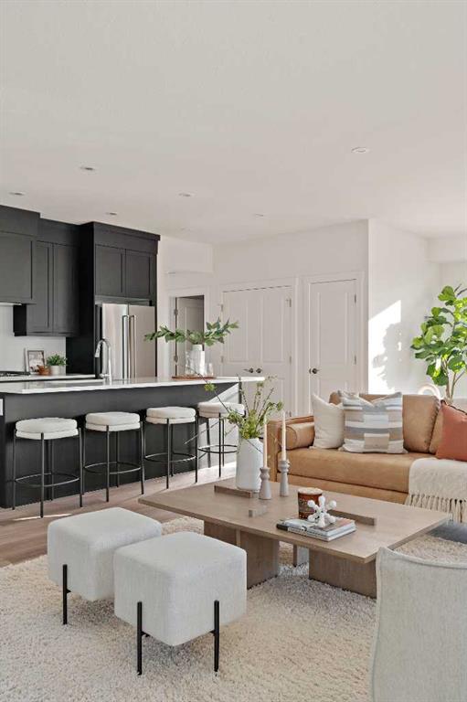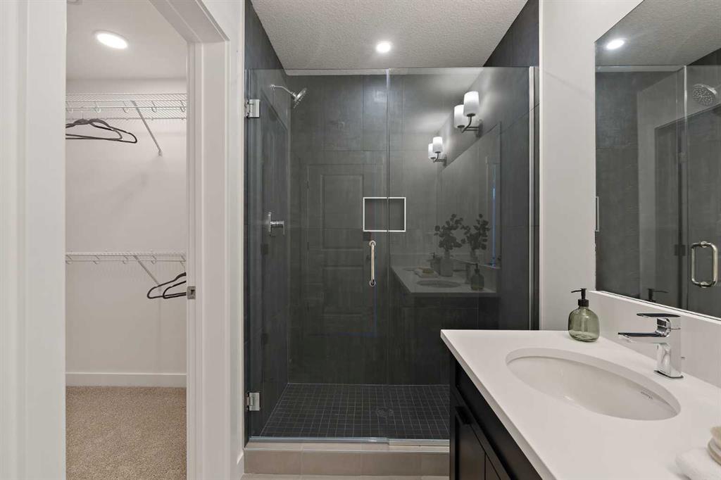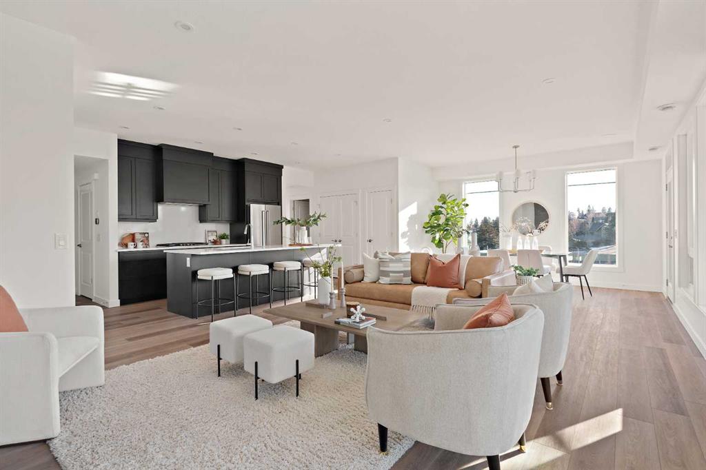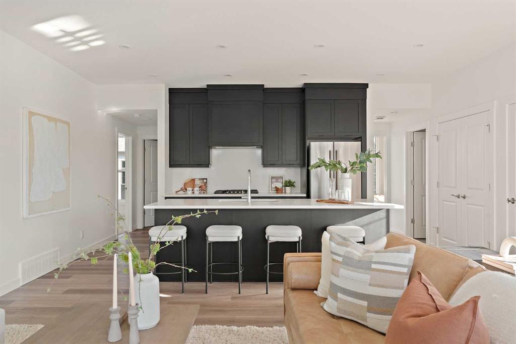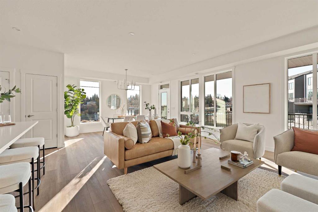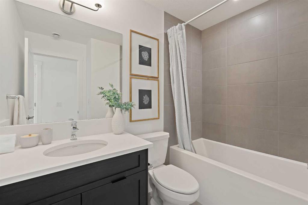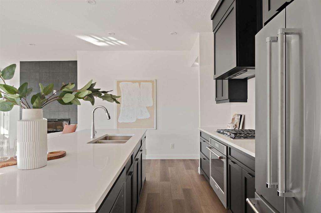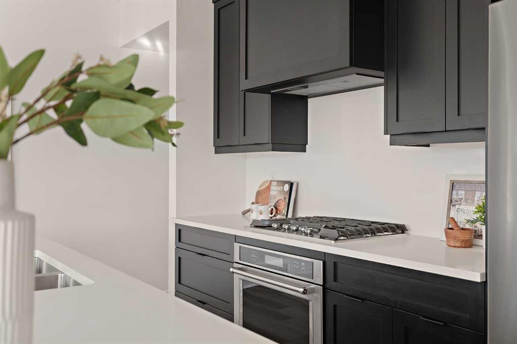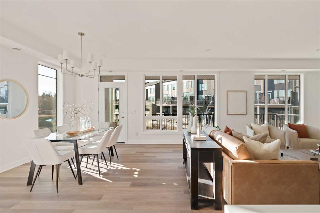 The Hyde at Crown Park is the perfect townhouse for those wanting single-level living without compromise. Featuring 3 bedrooms, 2 bathrooms, and nearly 1,400 ft2 of living space on one level with a private double attached and endless storage space, this home is perfect for those looking to downsize without compromising. Located in the heart of Crown Park overlooking a central park and just minutes from downtown Calgary, this brand new end-unit townhome perfectly combines maintenance-free living within a central urban setting. The beautifully designed main living area has the perfect open-concept design, making it ideal for entertaining and hosting. The kitchen anchors the main living space and opens perfectly to the living and dining areas with a wall of southwest-facing windows flooding the space with natural light. The timeless kitchen is complete with shaker cabinets, quartz countertops, and a suite of built-in appliances including a gas cooktop. The expansive living area has a central fireplace and ample seating space for six+ people, making entertaining a breeze. The large dining area can easily accommodate a table with seating for eight people and includes additional windows for added natural light. The primary suite is located at one end of the property, with laundry providing added privacy between the owner's suite and secondary bedrooms. A luxurious 4 pc ensuite with dual sinks and a walk-in shower as well as a large walk-in closet complete the primary suite. Two additional bedrooms provide added flexibility, with space for a guest bedroom + home office space or media room, and have their own full bathroom. The main living area is complete with a large laundry room with additional cabinets for storage and a countertop for added convenience. A ~26'x8' balcony provides the perfect outdoor living space - complete with a gas line, hose bib, and overlooking the park with optimal southwest exposure ensuring you're maximizing your sun and natural light all year long. The lower level of the property provides access to the oversized private double attached garage and two expansive storage spaces provide the space you've been looking for! Located at Calgary's newest inner-city development, this brand new home provides a lock-and-leave lifestyle without compromise and includes full builder warranty + Alberta New Home Warranty. These rare designs don't come available often - this is your opportunity to get the bungalow-style home you were looking for that offers single-level living with a private garage and low fees that provide you with a maintenance-free lifestyle.