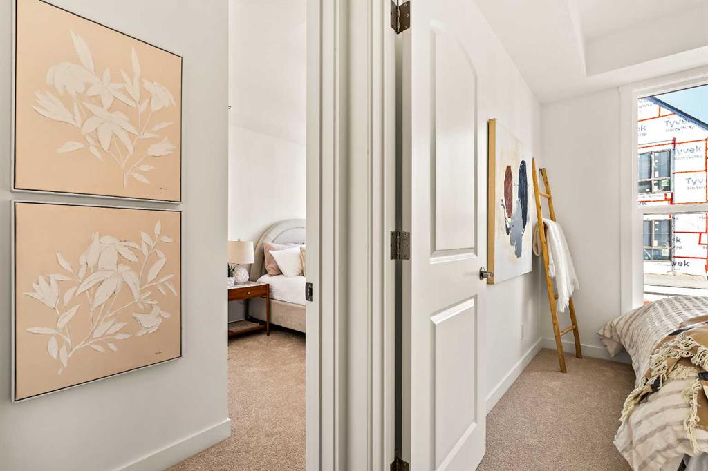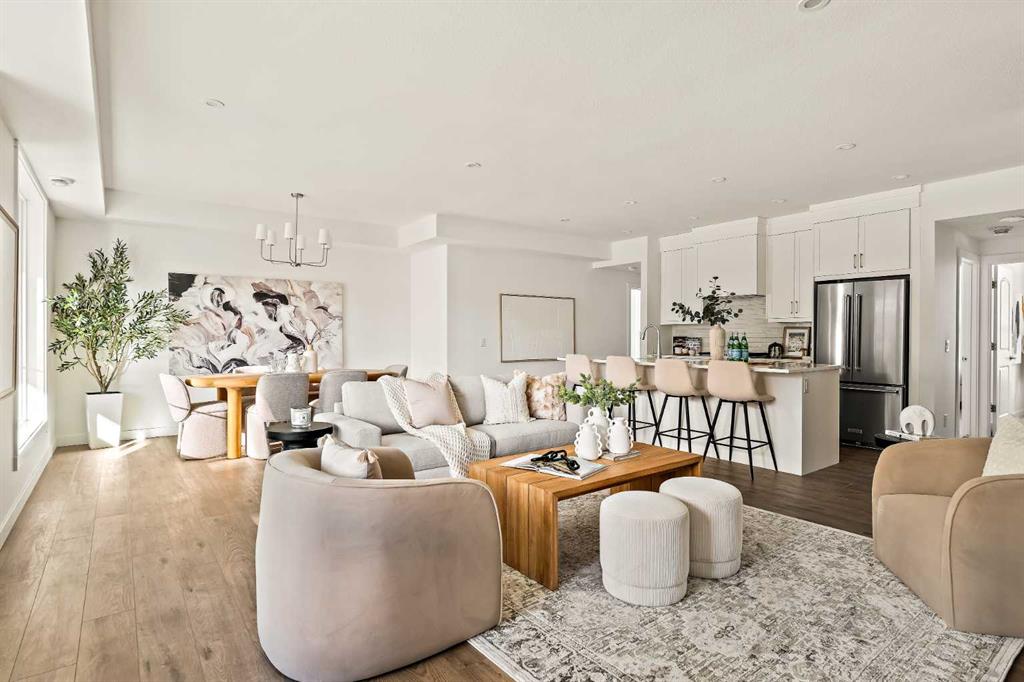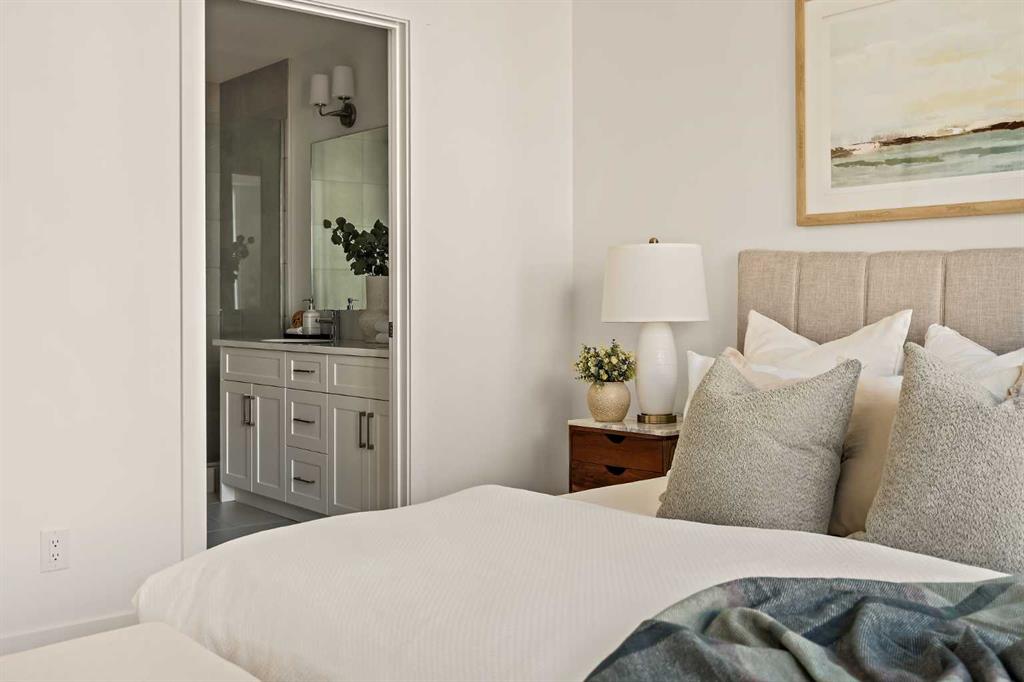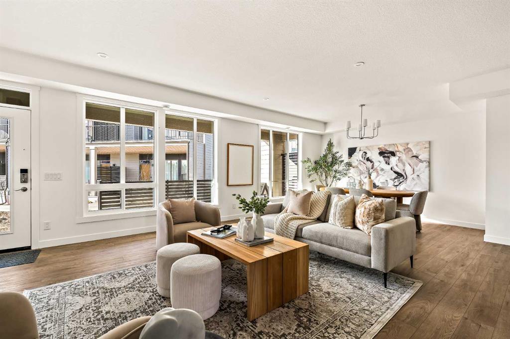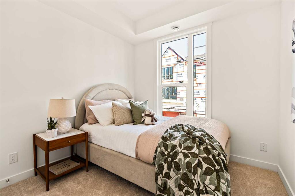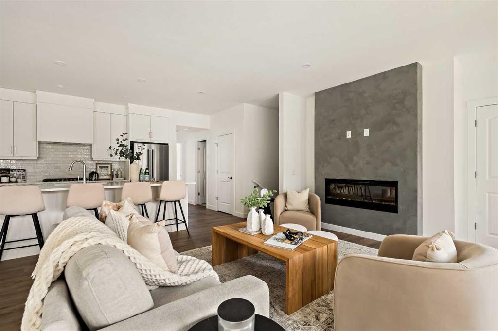 Welcome to the Regent at Crown Park - a thoughtfully designed townhouse that offers single-level bungalow style living without compromise. Designed with down-sizers in mind, this maintenance-free townhouse combines a bungalow lifestyle with a double attached garage - all while giving you a maintenance-free lifestyle, perfect for those who travel, or simply just don't want the hassle of exterior maintenance, landscaping or snow removal! This brand new 3 bedroom, 2 bathroom townhome has nearly 1,300 ft2 of living space over one level and a lower level with virtually endless storage and a private double attached garage! The brilliantly designed living area was created for entertainment with a central kitchen that opens to the living and dining areas with a wall of windows that flood the space with natural light. The timeless kitchen has white shaker cabinets, light quartz countertops and a suite of built-in appliances including a chimney hood fan, gas cooktop and built-in oven. The sprawling kitchen overlooks both the living and dining areas, ensuring the chef is never left out. A central fireplace with floor-to-ceiling plaster finish anchors the main living area with ample space for 6 to sit comfortably. The large dining area has space for a table and buffet if desired, providing flexible furnishing options to meet your needs. The primary suite is located at the back of the home and features a large walk-in closet and spa-inspired ensuite with dual sinks and a tiled walk-in shower. The centrally located laundry room, complete with upper cabinetry and a countertop for added convenience, perfectly separates the primary suite from secondary rooms for optimal privacy. Two additional bedrooms and a full bathroom round out this expansive single-level living space. The secondary rooms provide added flexibility for a guest room(s), home office, media room or studio space - while keeping a broad appeal for resale value. The lower level has a large storage room and oversized utility room (~17'x7') that could easily be used for a hobby space. An oversized double attached garage completes the interior of the home. Lastly, a large covered southwest-facing patio, spanning over 26' wide, provides the perfect outdoor living space with views overlooking the park and is complete with a gas line and hose bib for added convenience to everyday living. A bungalow style townhouse with a double attached garage is an exceptionally rare find - don't let this opportunity pass by. Purchase with peace of mind - this brand new home includes a comprehensive builder warranty + Alberta New Home Warranty. Located just minutes from downtown, countless amenities and in an established and developed area, you can move into your new home with confidence - knowing all that is around your beautiful new home.