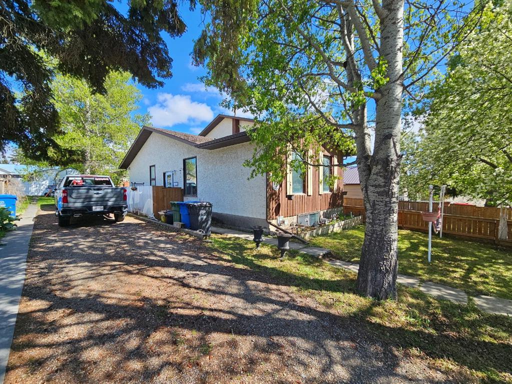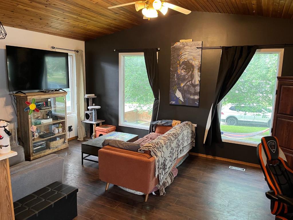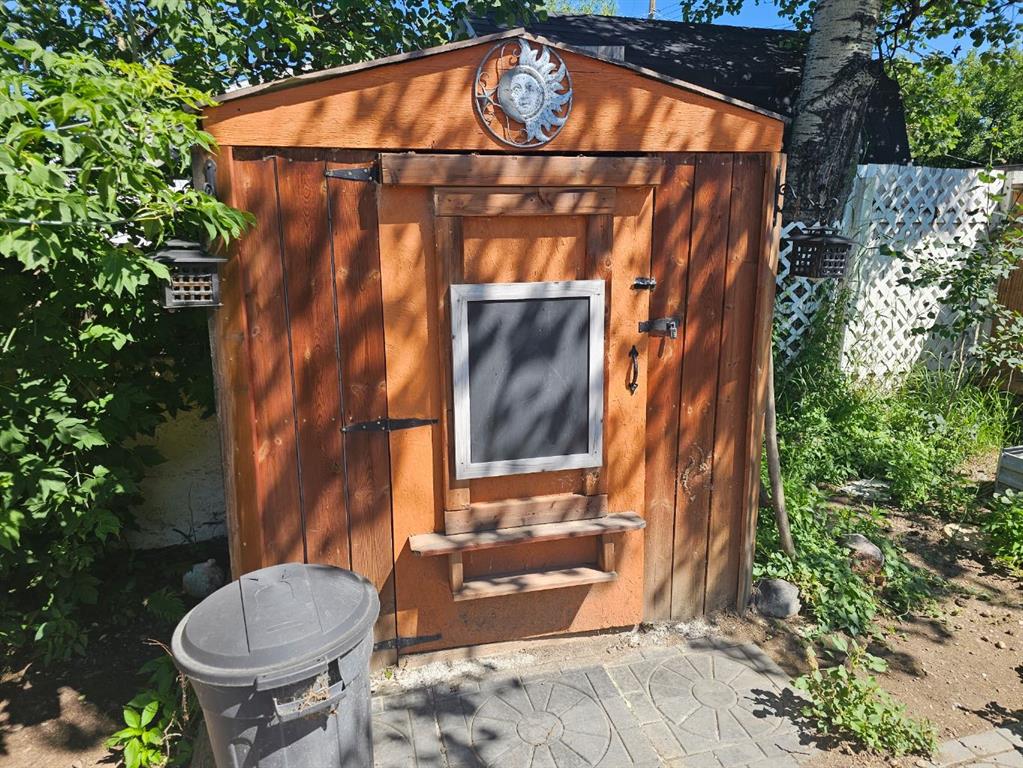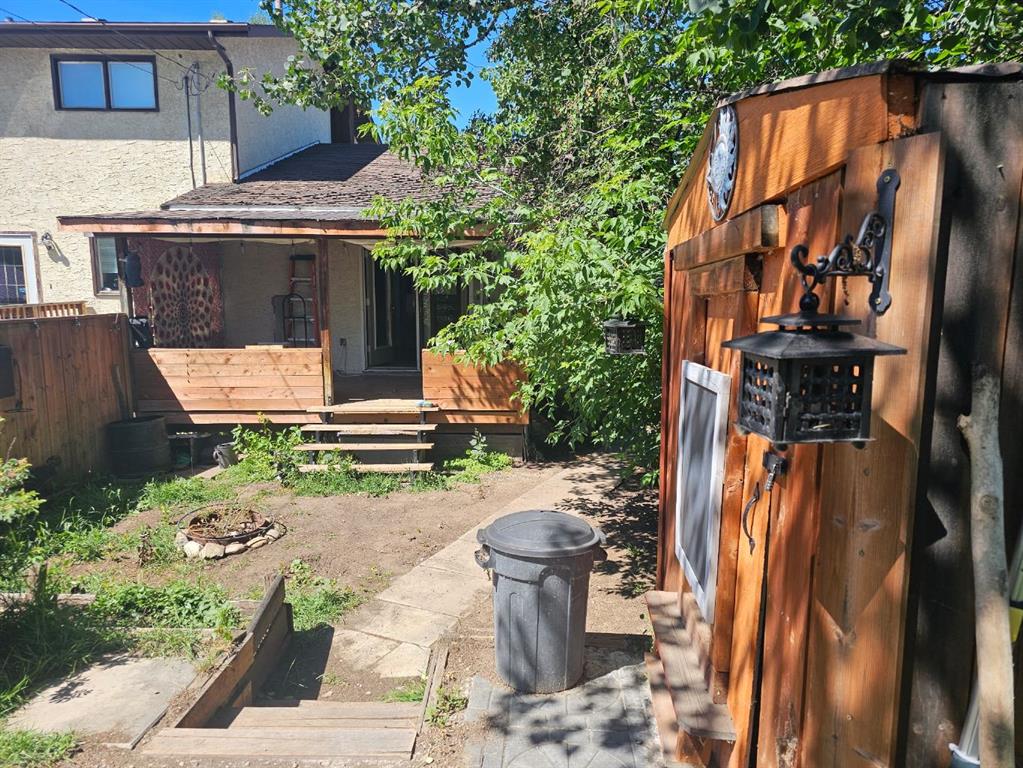 This four-bedroom, two-bathroom duplex is perfectly situated in an ideal location close to schools, shopping, and everyday conveniences, making it an excellent choice for families or investors alike. The main level offers a welcoming layout with an open kitchen featuring updated appliances, seamlessly connected to the dining area and a sunken living room. The living room is a true highlight, showcasing vaulted wood ceilings, and an abundance of natural light that creates a warm and inviting atmosphere. A four-piece bathroom, the primary bedroom with private access to the covered deck, and an additional bedroom complete the main floor, providing comfortable and functional living space. The lower level includes a free standing natural gas stove for added warmth. Two spacious bedrooms and a convenient two-piece bathroom, offering privacy and flexibility for guests, teens, or a home office setup. A utility room with a stacked washer and dryer, along with a laundry sink, completes the lower level. Outside, the property offers a private yard featuring garden boxes ready for planting and a handy storage shed. Combining a thoughtful layout, attractive features, and a sought-after location, this duplex offers comfortable living with room to grow.