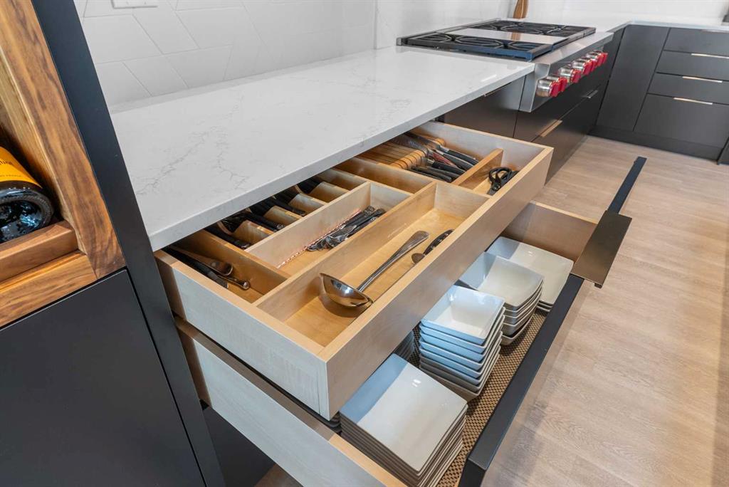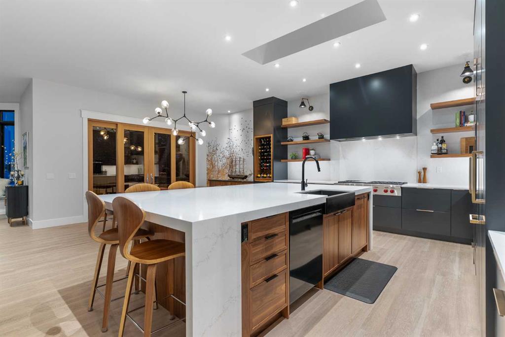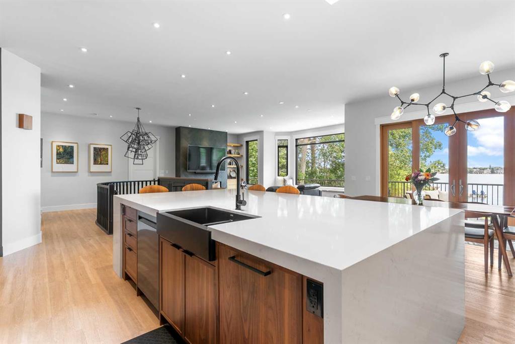 Experience lakefront luxury at one of Chestermere’s most coveted addresses. This superbly renovated walkout bungalow boasts 3,670 Sq Ft of beautifully developed living space on West Chestermere Drive. It combines timeless design with modern elegance, offering breathtaking lake views from nearly every room. Inside, soaring 10-foot ceilings and expansive windows flood the home with natural light. Italian tile, installed by a renowned European craftsman, sets the stage for exceptional finishes throughout. The heart of the home is the massive Legacy kitchen, showcasing satin black and walnut cabinetry, walnut island, striking quartz waterfall countertops, and top-tier Wolf & Thermador appliances, complete with a butler’s pantry. Check out the cutlery drawer! The kitchen flows seamlessly into the great room, anchored by a gas fireplace with a custom Italian-tile surround, and extends outdoors through patio doors to a spacious deck—perfect for entertaining or simply soaking in the lake views. The primary suite is a private retreat featuring deck access, a spa-inspired ensuite with a book-matched walnut vanity, European enamel cast iron sinks, heated tile floors, and a deluxe shower with body jets and an oversized rain head. A striking office with double black entry doors and a feature wall offers style and functionality. The walkout lower level is designed for entertaining and versatility, with a sunny family room, wet bar (with potential to convert into a second kitchen), a spacious bedroom, 1 & half bathrooms, and a large gym that could easily be reconfigured into two additional bedrooms. Outdoors, enjoy a triple-car garage. A sprawling lakefront lot with mature trees for privacy, large hot tub ready Gazebo, wonderful for entertaining, 75-ft dock, and a rare boathouse. Meticulously crafted for those who treasure comfort with elegant sophistication and appreciate want to claim their own “little piece of paradise.” Experience the ultimate in year-round outdoor living on fabulous Lake Chestermere.