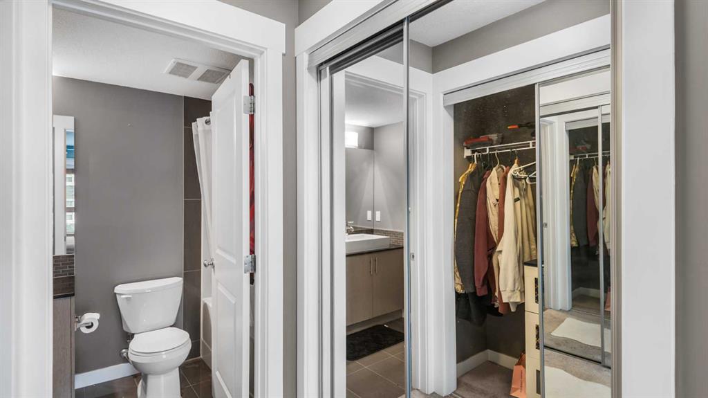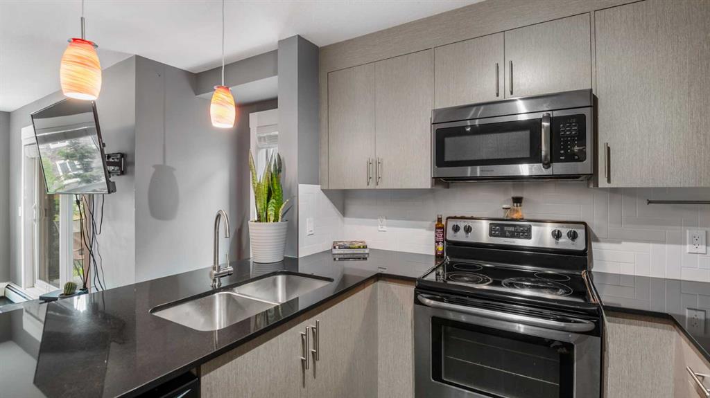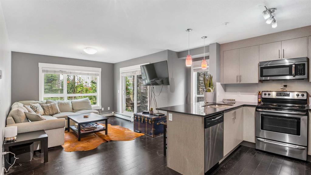 This well-appointed corner unit in the Skymills complex offers over 945 sq ft of thoughtfully designed living space with two bedrooms and two full bathrooms, plus the highly sought-after bonus of two titled parking stalls: One above ground and one in the heated underground parkade. The open-concept layout is bright and inviting, featuring large south and west-facing windows that fill the home with natural light throughout the day. The modern kitchen is finished with quartz countertops, generous cabinetry, and a seamless flow into the living and dining areas, ideal for both everyday living and entertaining. Cork flooring adds warmth, comfort, and durability to the main living space. Both bedrooms are generously sized, including a private primary suite complete with its own ensuite and double closets. Step outside to the west-facing patio, equipped with a gas line for your BBQ, providing a perfect extension of your living space. Located close to parks, playgrounds, schools, shopping, transit, and the airport, this home delivers exceptional convenience in a well-managed complex. Whether you are a first-time buyer, downsizer, or investor, this is a standout opportunity in Skyview Ranch. Book your private showing today and see the value for yourself.