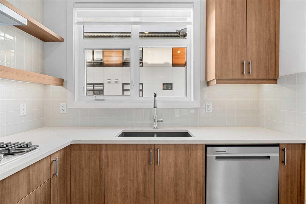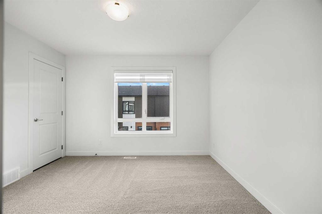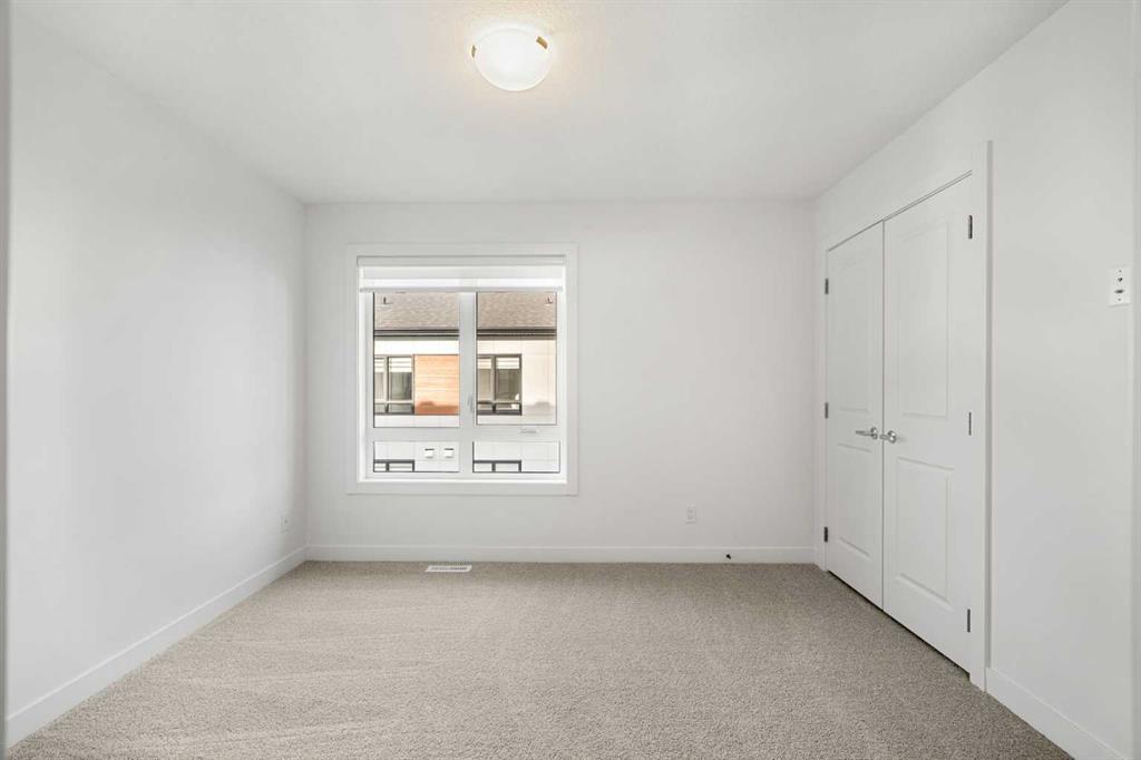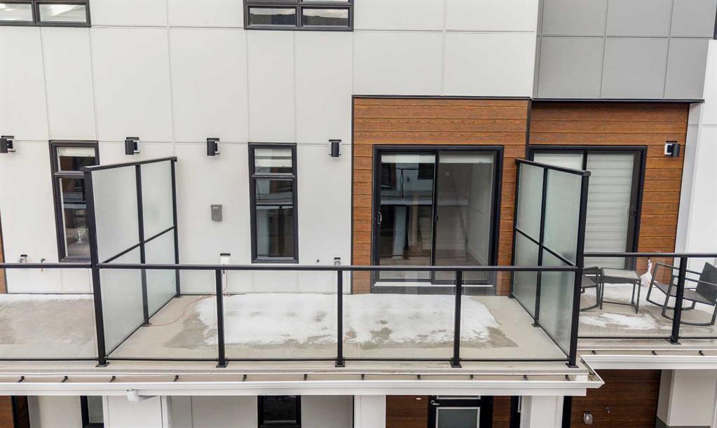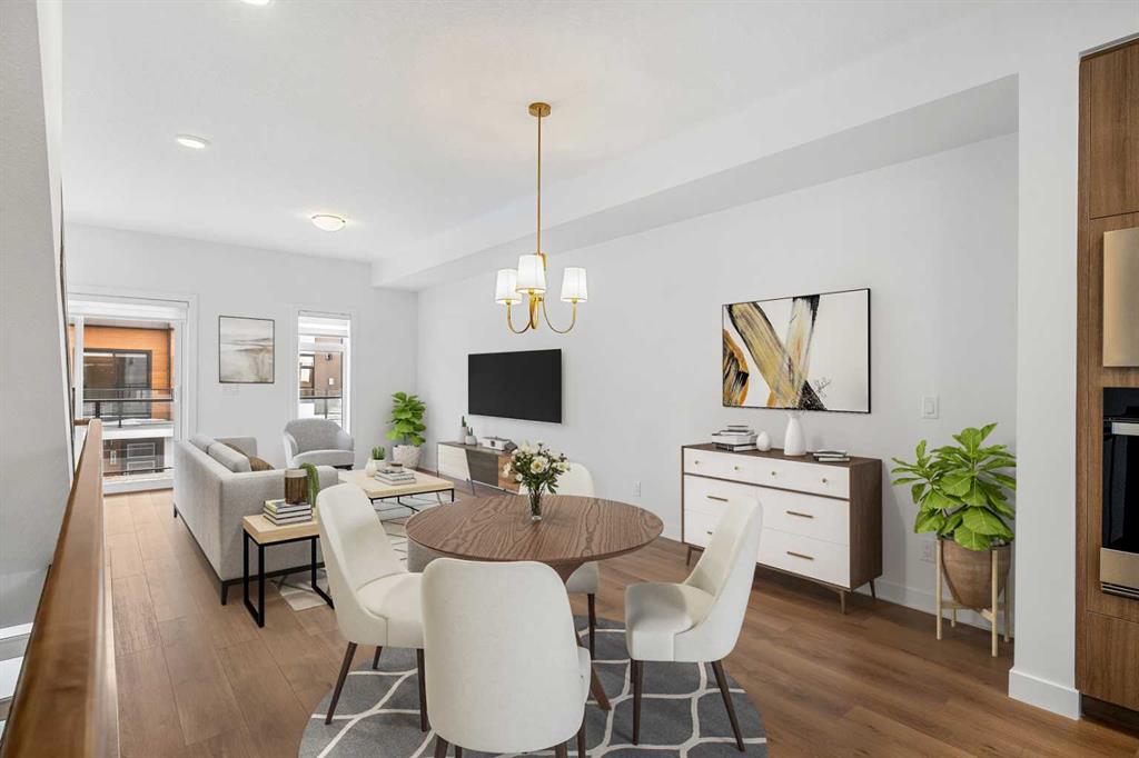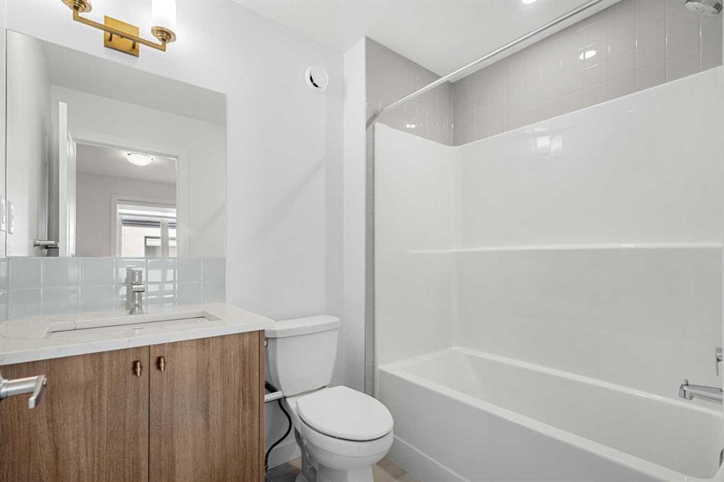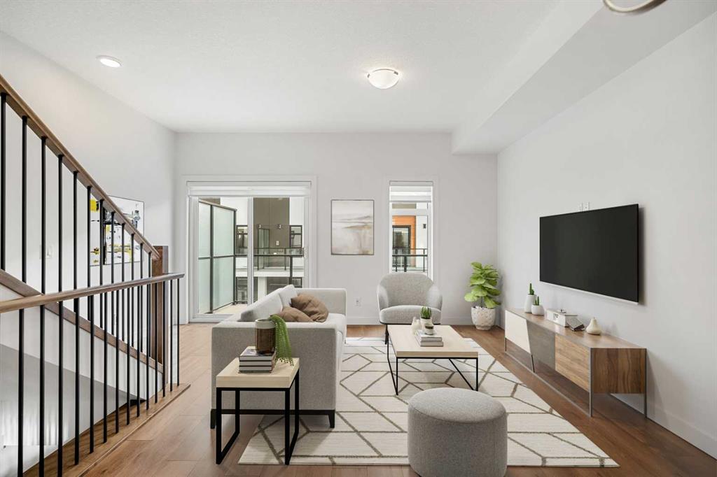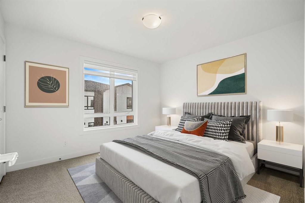 Welcome to this exceptional Trico built townhome located in the West 83 community of West Springs, one of Calgary’s most desirable west-side neighborhoods. This thoughtfully designed residence offers over 1,300 square feet of living space across a well-planned, modern layout that blends comfort and style. Inside, you are welcomed by an open-concept main floor illuminated by abundant natural light, which seamlessly connects the living, dining, and kitchen areas. The kitchen features two-tone cabinetry paired with quartz countertops and a gas range stove, creating a refined and functional space for everyday living. A 16-foot wide deck extends the living area outdoors, providing an inviting setting for morning coffee or relaxing in the evening. The upper floor holds two generous bedrooms, each with its OWN ENSUITE BATHROOM, ensuring privacy and comfort for residents and guests alike. The primary bedroom includes a three-piece ensuite and DUAL WALK IN CLOSETS, providing ample storage and convenience. Contemporary finishes throughout the home enhance the overall sense of refinement. Additional features include upgraded LED lighting, zebra blinds for versatile light control, and rough-in for A/C to support year-round comfort. The intelligent floor plan maximizes space while maintaining a flow that suits both everyday living and entertaining. Situated close to parks, pathways, shopping, dining, and excellent schools, this property offers both a peaceful residential setting and quick access to downtown Calgary. Major routes are within easy reach, making commuting and weekend escapes equally convenient. This home includes an Alberta New Home Warranty and represents a rare opportunity to live in a vibrant community with access to some of Calgary’s best amenities. Don't miss your chance to view this property - head to the Showhome today!