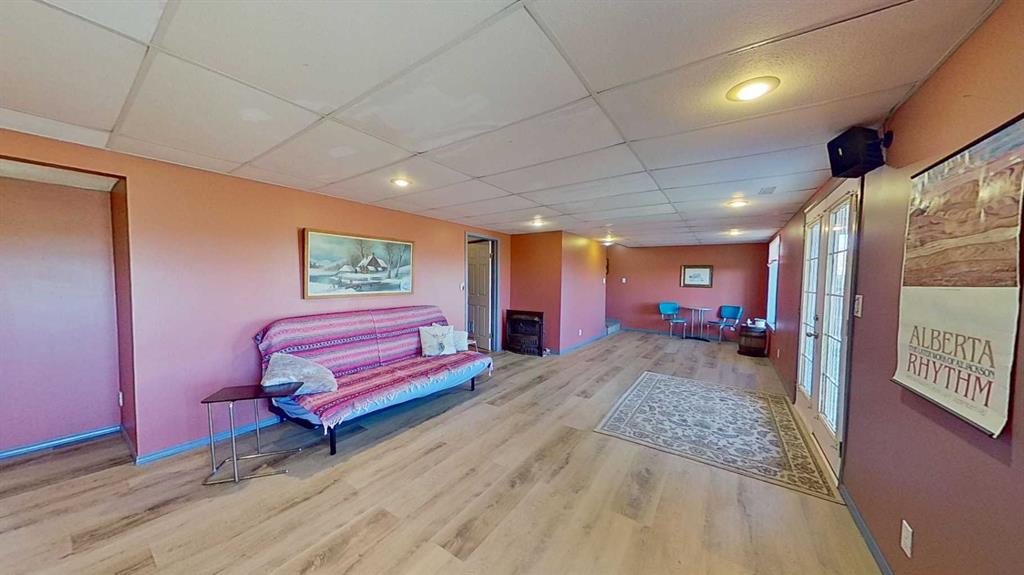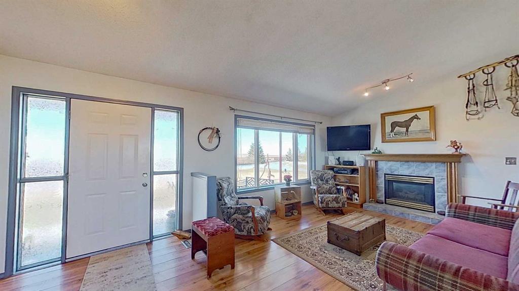 Prairie Panorama. Stunning sunrise and sunset views from a gentle rise on 50.92 acres bordered by an irrigation canal. The 1284 sq ft bright open concept bungalow offers 3 bedrooms and 2 bathrooms upstairs, including an ensuite with a two-person jetted tub. A gas-fireplace living room and a combined kitchen/dining area open to both front and back decks. The fully finished walk out basement adds a large family room, an additional bedroom, an office, a full bathroom, and a generous storage room. The landscaped yard features an irrigation system, mature fruit tress and berry bushes, terraced beds, and a water feature. Outbuildings include a 30 X 40 sq ft Quonset with water hydrant, 4 box stalls with mats, and a concrete-front shop area. The land is fenced and cross fenced with two automatic waterers, two corrals, a round pen, three horse shelters, and three storage sheds, one used as a tack shed beside the hitching post. Annual lease income of approximately $4075. An additional 5.67 WID acres are part of the fenced pasture. The pasture includes a fenced dugout suitable for stocking trout, and parts are on hand to repair the aerating windmill. A man- gate connects the front pasture to the installed culvert under the canal road, with a trenched hose leading to the yard for future irrigation expansion. Ride, hike, bike out along the canal. A natural gas Kohler generator automatically provides whole-property back up power. Subdivision potential exists. Location advantages: 10 minutes to Strathmore, 13 minutes to De Havilland field, 30 minutes to Calgary.